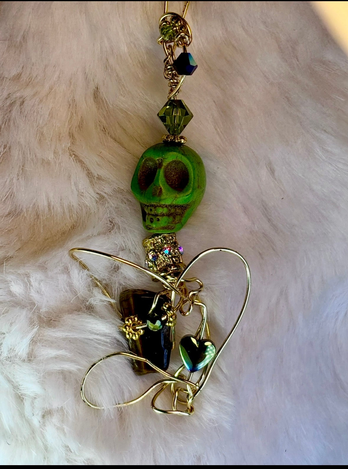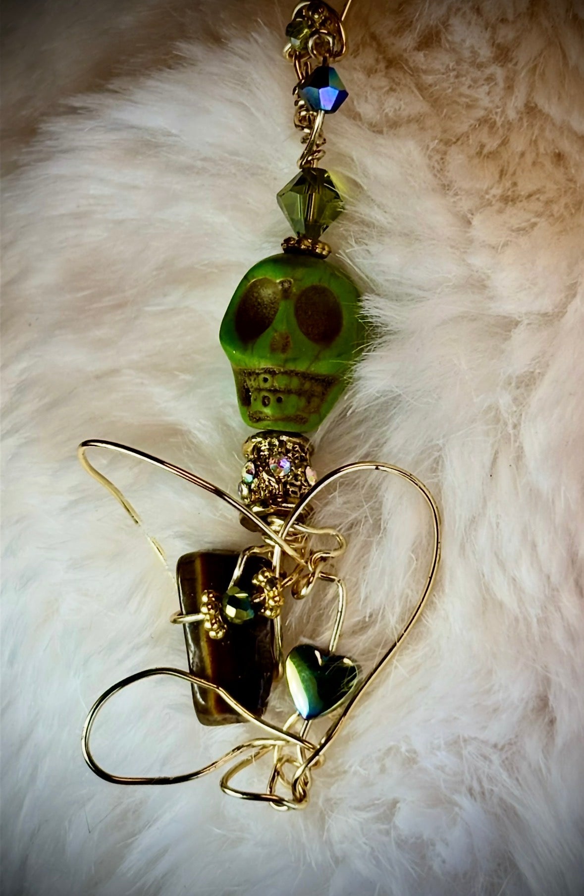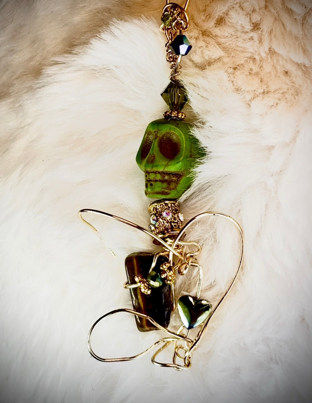 This piece was formed as a reminder that love is not weakness — it is armor. I shaped the gold into flowing protective curves that cradle both strength and vulnerability at once. The dyed turquoise skull speaks of individuality and fearless self-expression, while beneath it rests Tiger Eye — steady, grounded, unwavering.