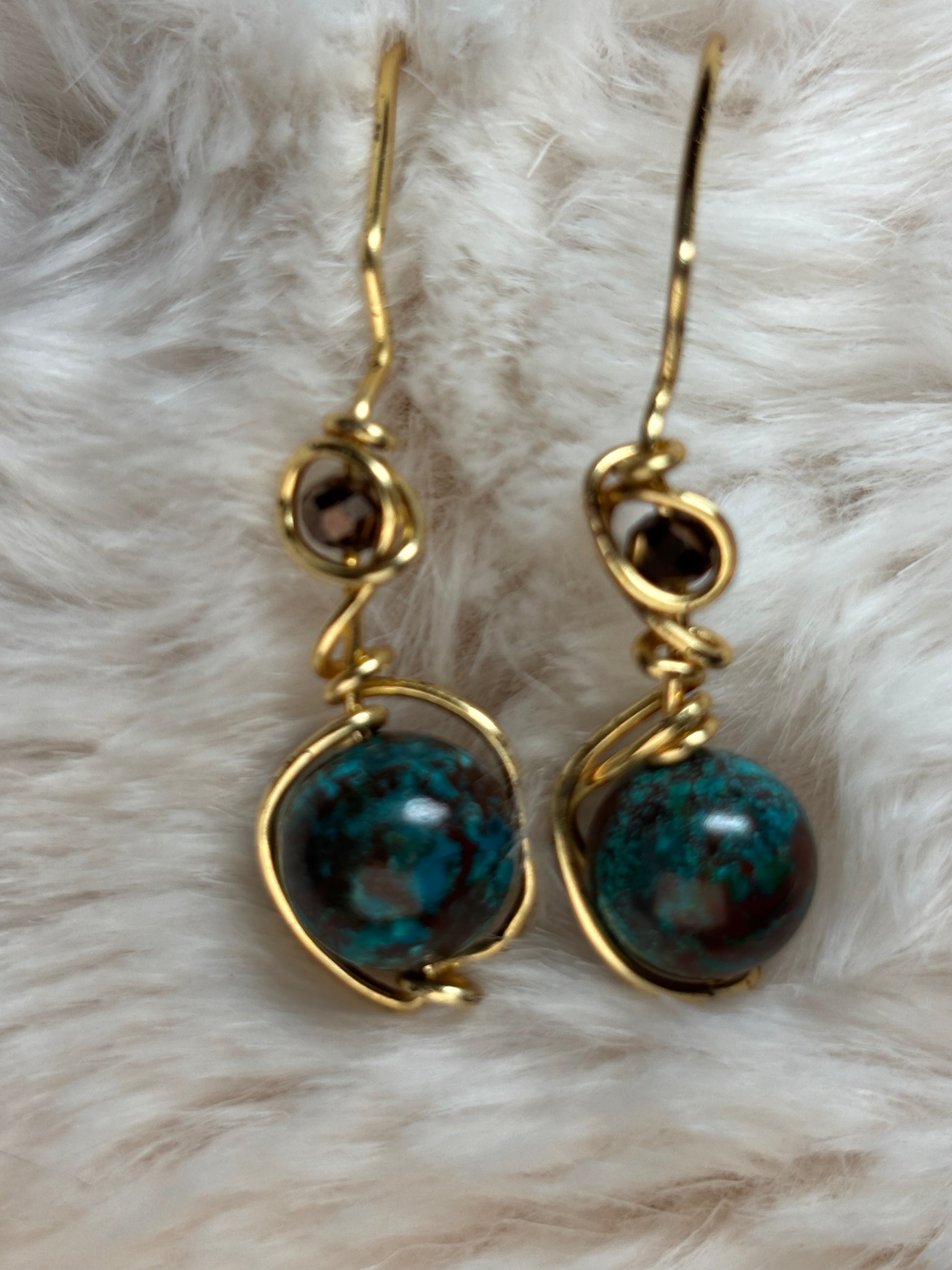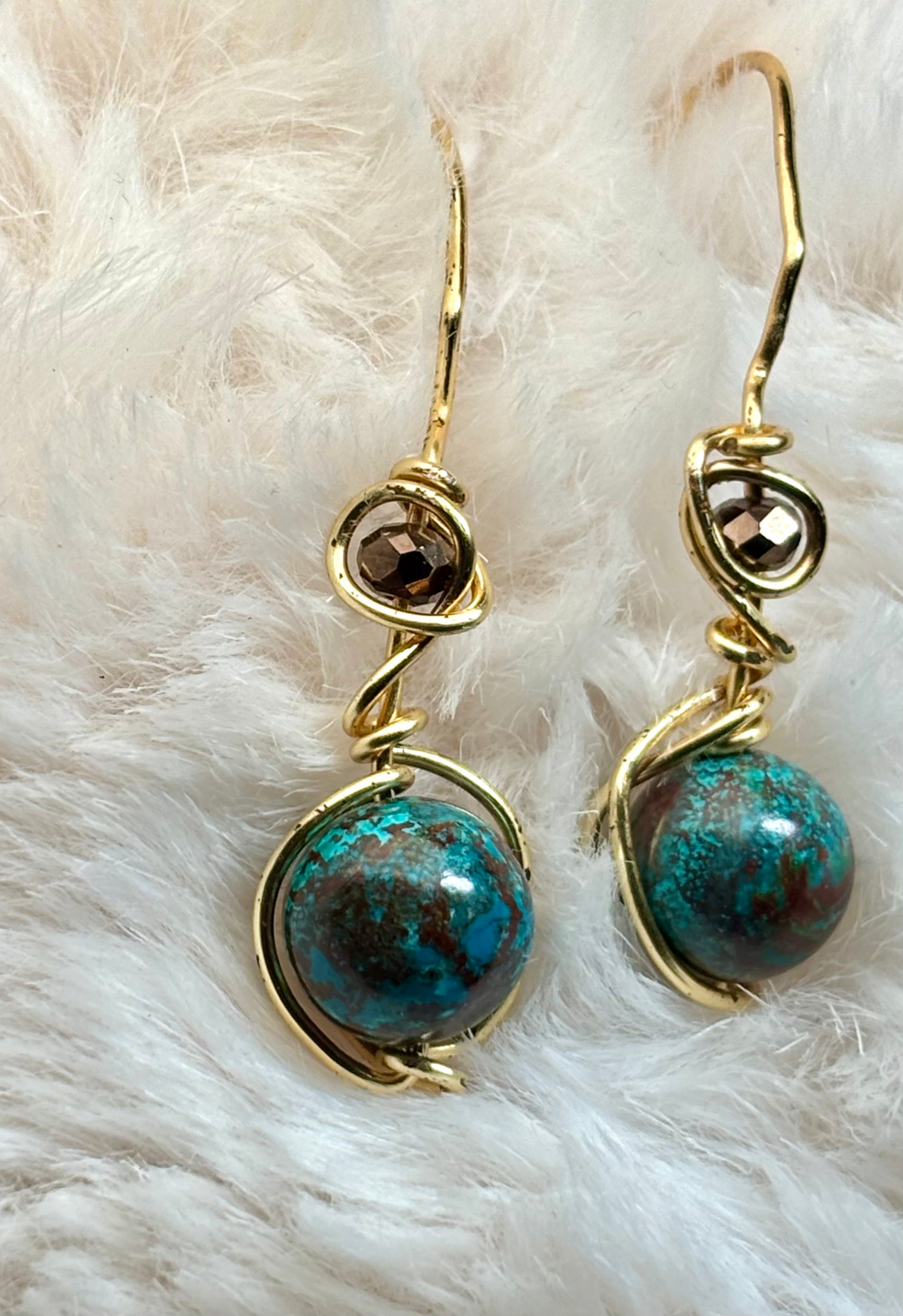 Born in the high mountain ranges of Peru, these turquoise stones carry the meeting of sky and earth within them. Their deep blue-green hues flow through dark natural matrix like hidden alpine lakes surrounded by ancient rock. Each stone holds the quiet strength of the mountains and the vast openness of high-altitude skies. Wrapped in warm golden curves, the design feels like sunlight tracing ridgelines at dawn, honoring the stone’s natural beauty and timeless presence.