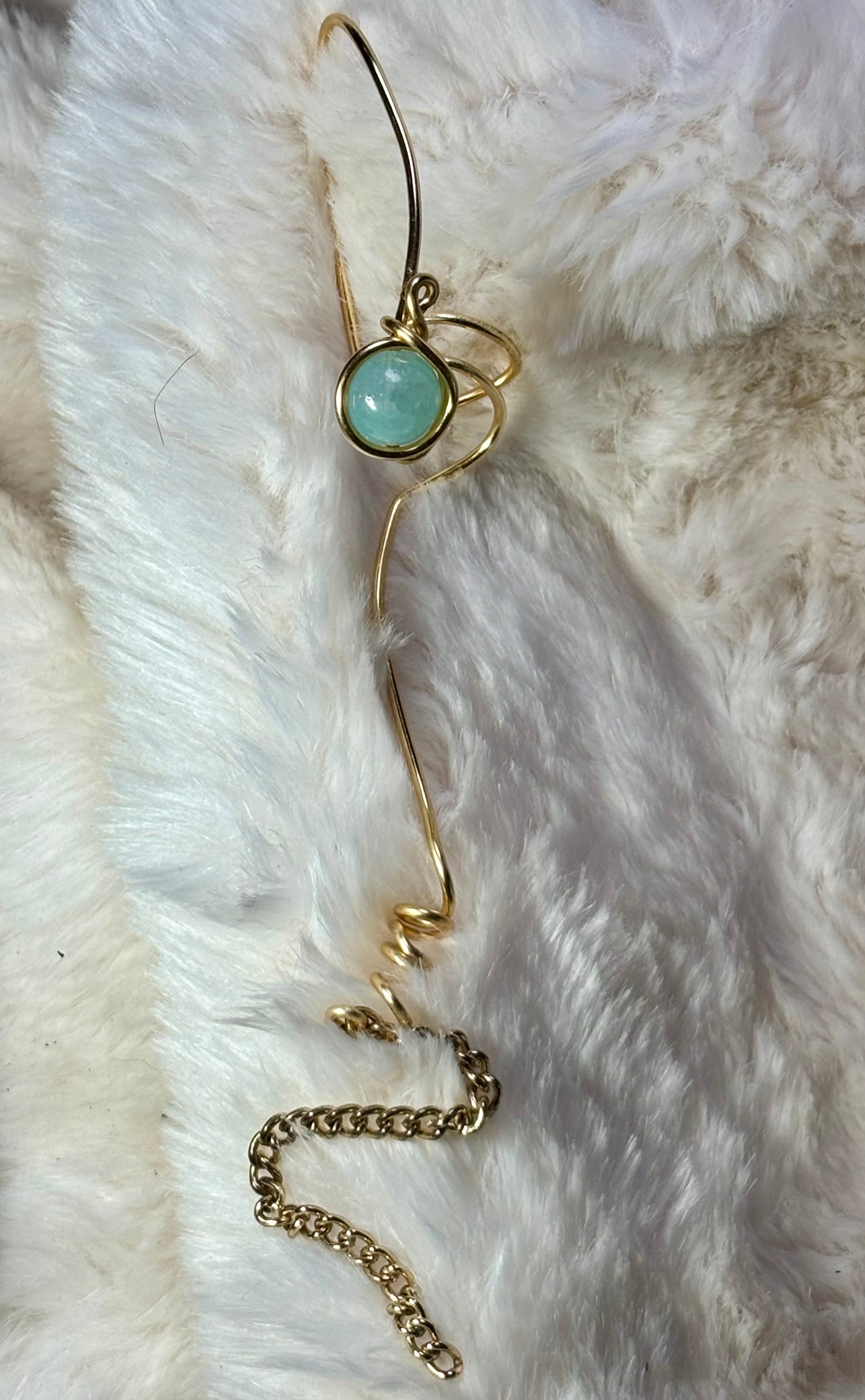 This piece was formed as a quiet invitation to slow down. The warm gold line follows the natural curve of the ear like a gentle stream of light, descending into a tranquil drop of soft aqua — a single moment of stillness suspended in motion. The delicate chain drapes freely, moving with the body as if echoing the rhythm of breath itself.