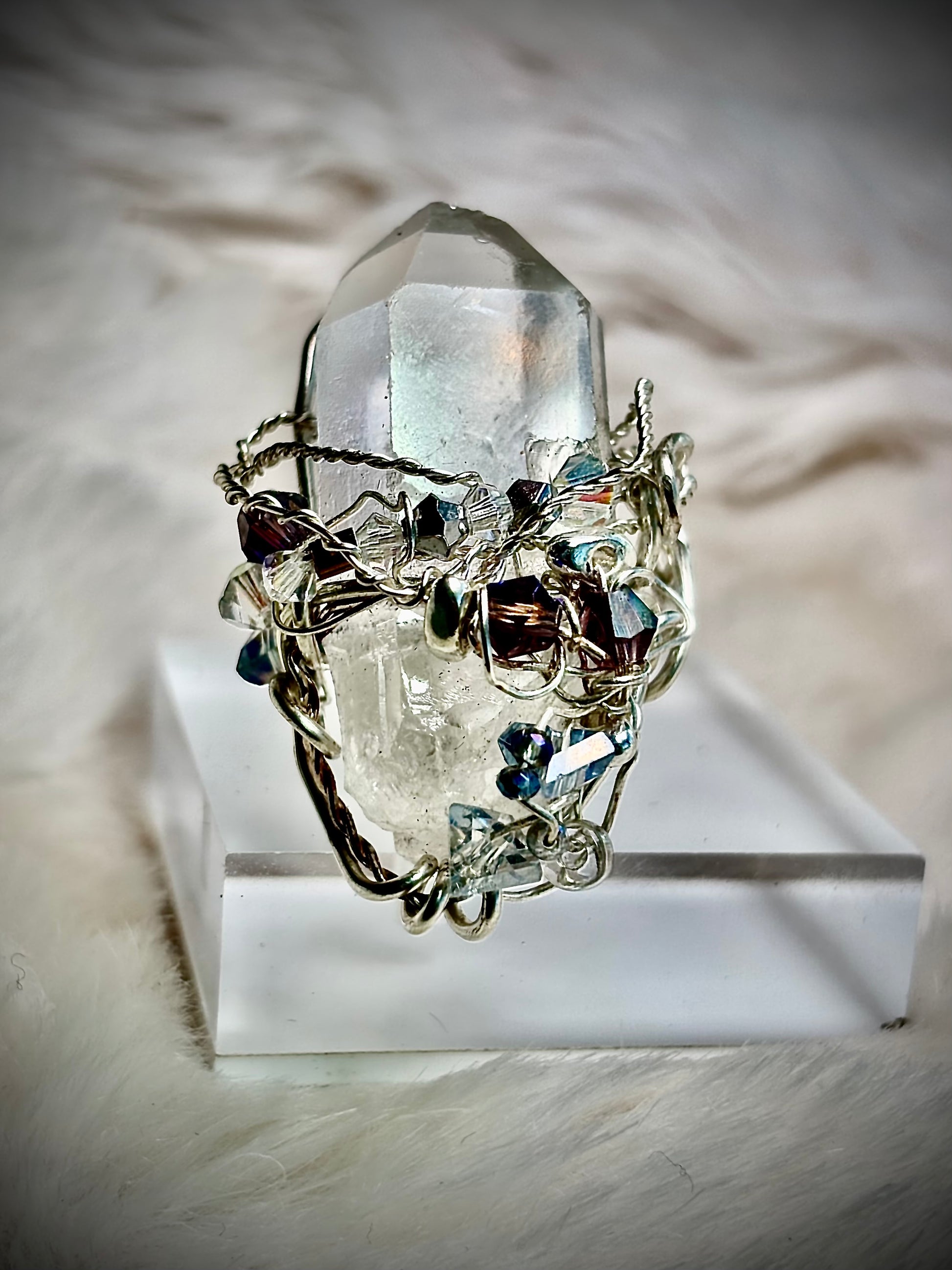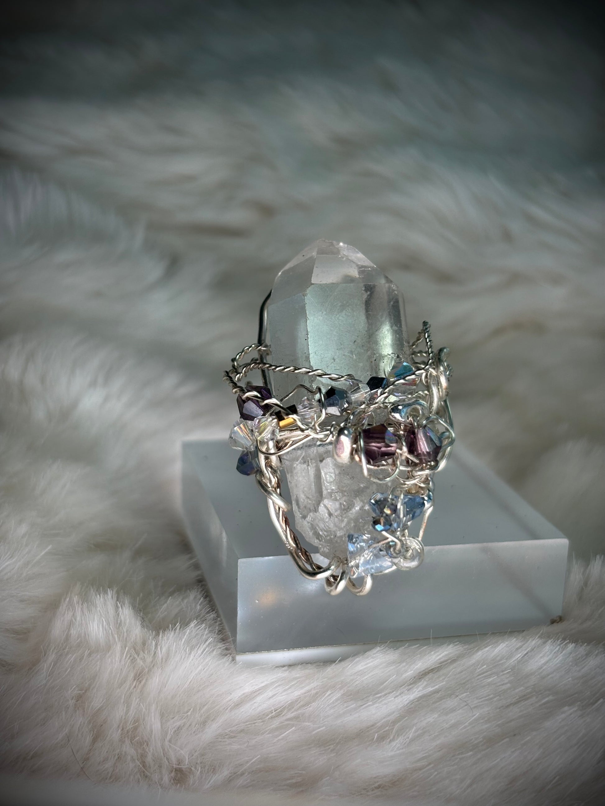 I envisioned this piece as a crystal tower rising at midnight — the moment just before transformation becomes destiny. The clear quartz point stands like a palace spire, luminous and unwavering. I shaped the silver into sweeping curves and protective arches, as though building a royal frame around a sacred kingdom. The surrounding crystals shimmer like glass slippers catching candlelight — iridescent, hopeful, touched by magic. This ring feels like the instant when a girl realizes she was always royalty.