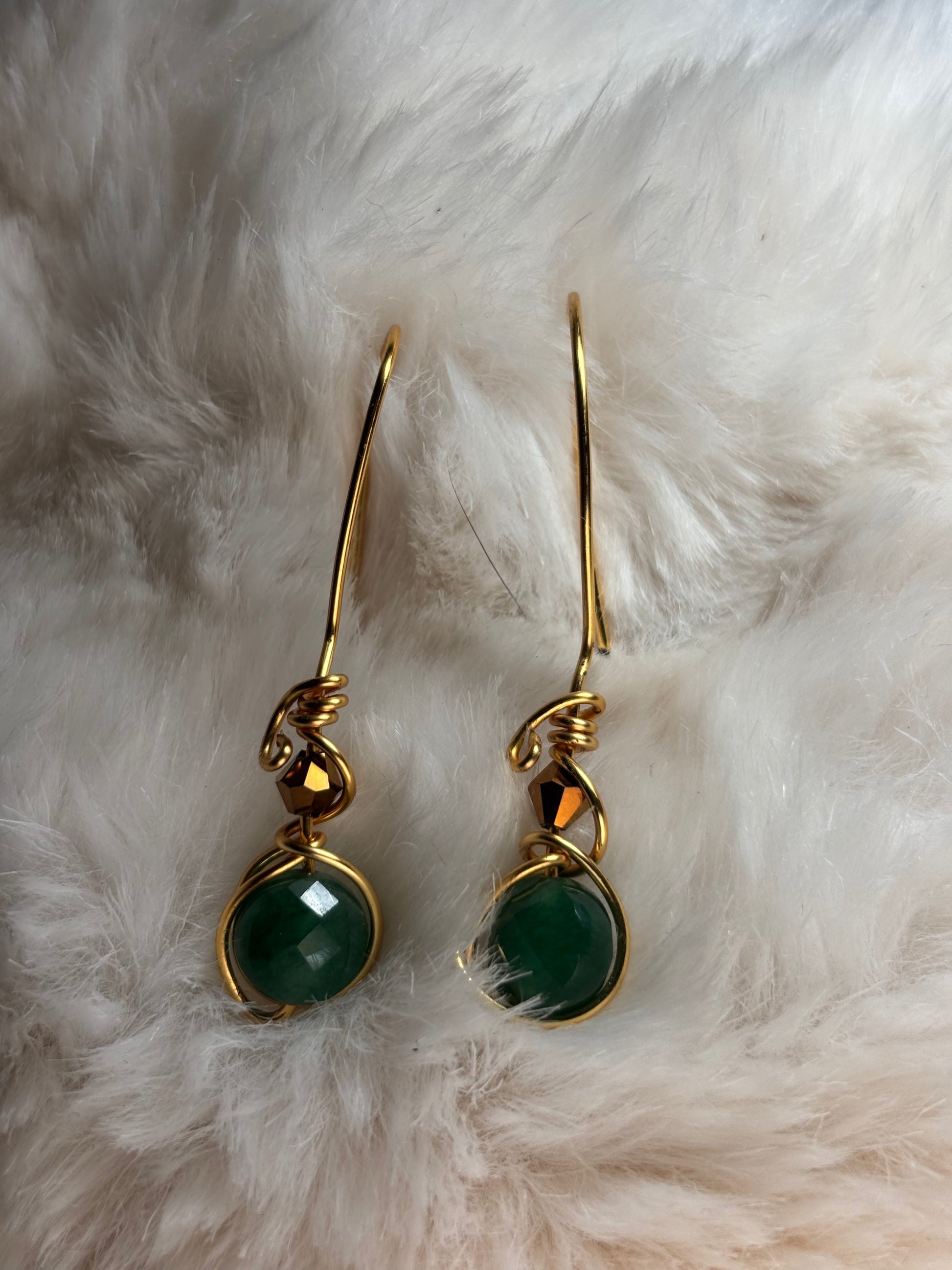 Each earring features deep green Nephrite, long treasured as a stone of protection, balance, and enduring prosperity. Its rich evergreen tone symbolizes growth, renewal, and the calm confidence that comes from standing firmly rooted in who you are. Suspended in warm gold wirework, the design feels both refined and organic — like sunlight weaving through forest leaves. Subtle crystal accents add a gentle shimmer, bringing clarity and light to the earthy depth of the jade.
