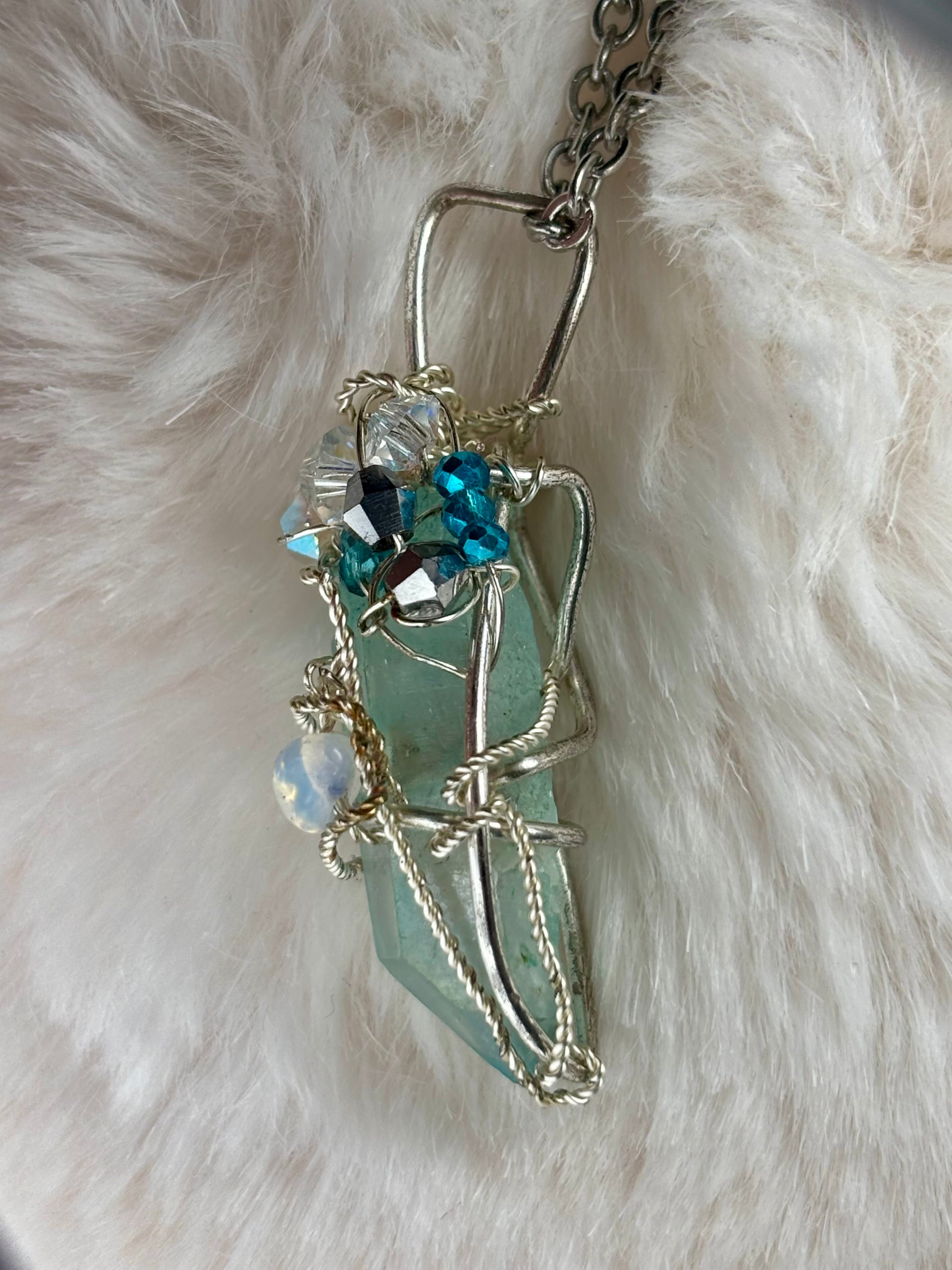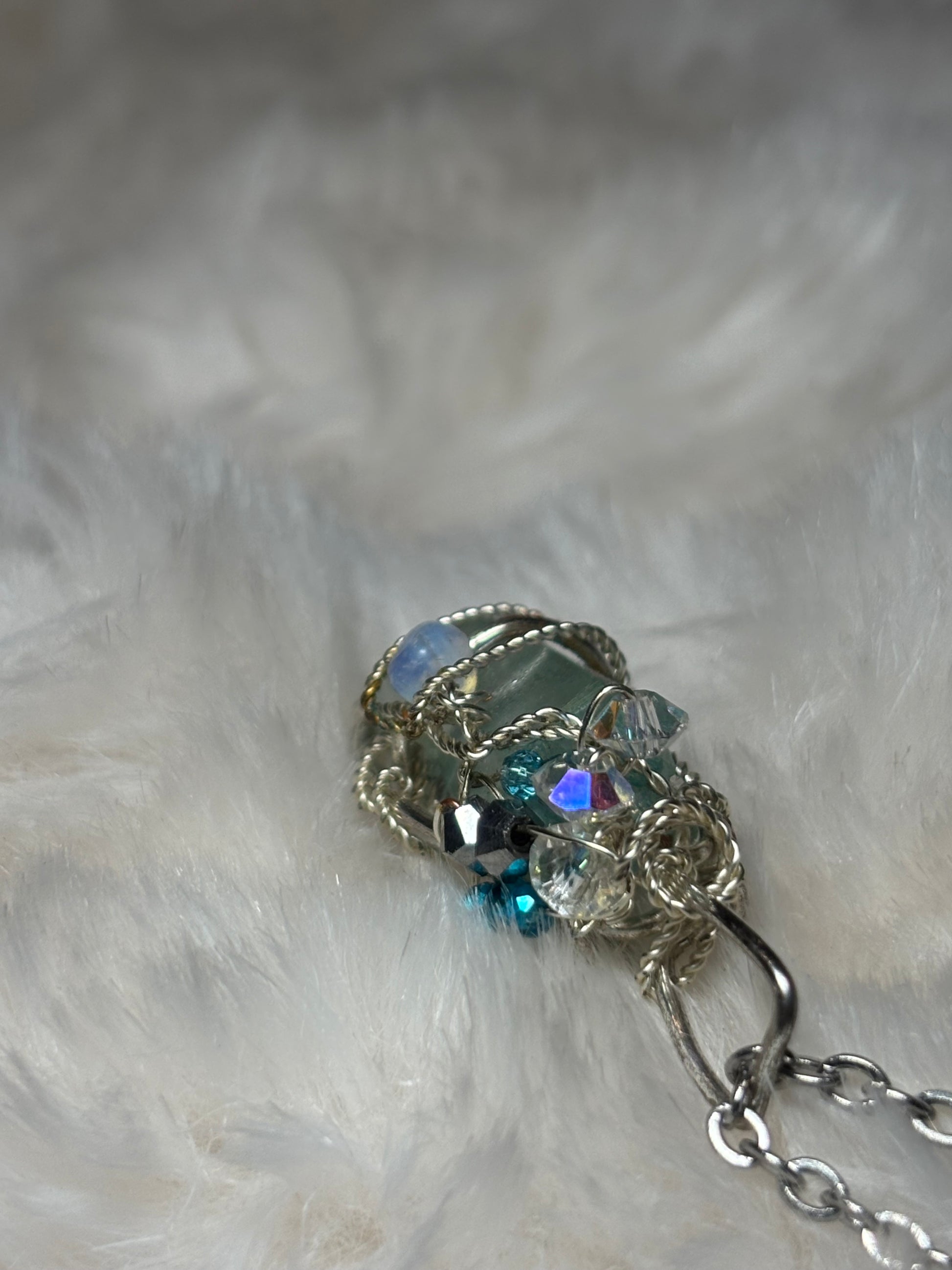 There is a quiet kind of magic that doesn’t announce itself — it waits for the light. This radiant crystal holds a secret spectrum within its depths, a hidden prism that reveals flashes of rainbow color only when the angle is just right. Wrapped in flowing silver and accented with moonstone and Swarovski crystals, this piece feels like a treasure discovered in a moment of stillness — soft, serene, and then suddenly alive with color. It is a reminder that the most powerful beauty often lives just beneath the surface.
