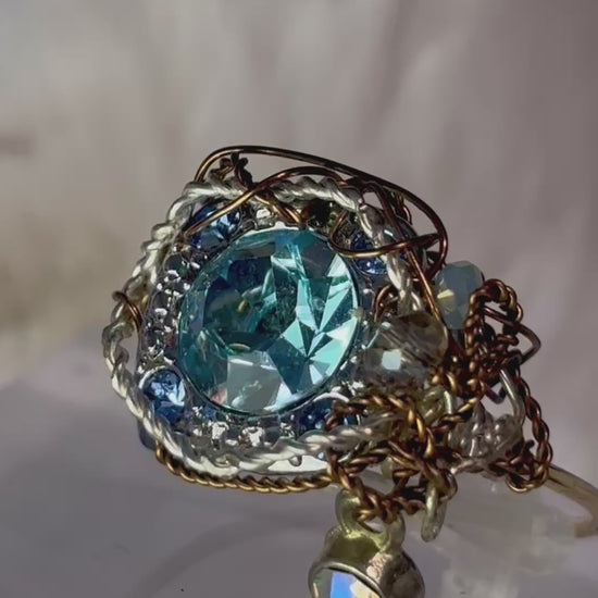 I shaped the golden framework into protective, flowing curves that cradle the luminous aqua center stone like something precious and pure. The braided detailing wraps around it as if shielding a tender heart that never hardened, even when tested.