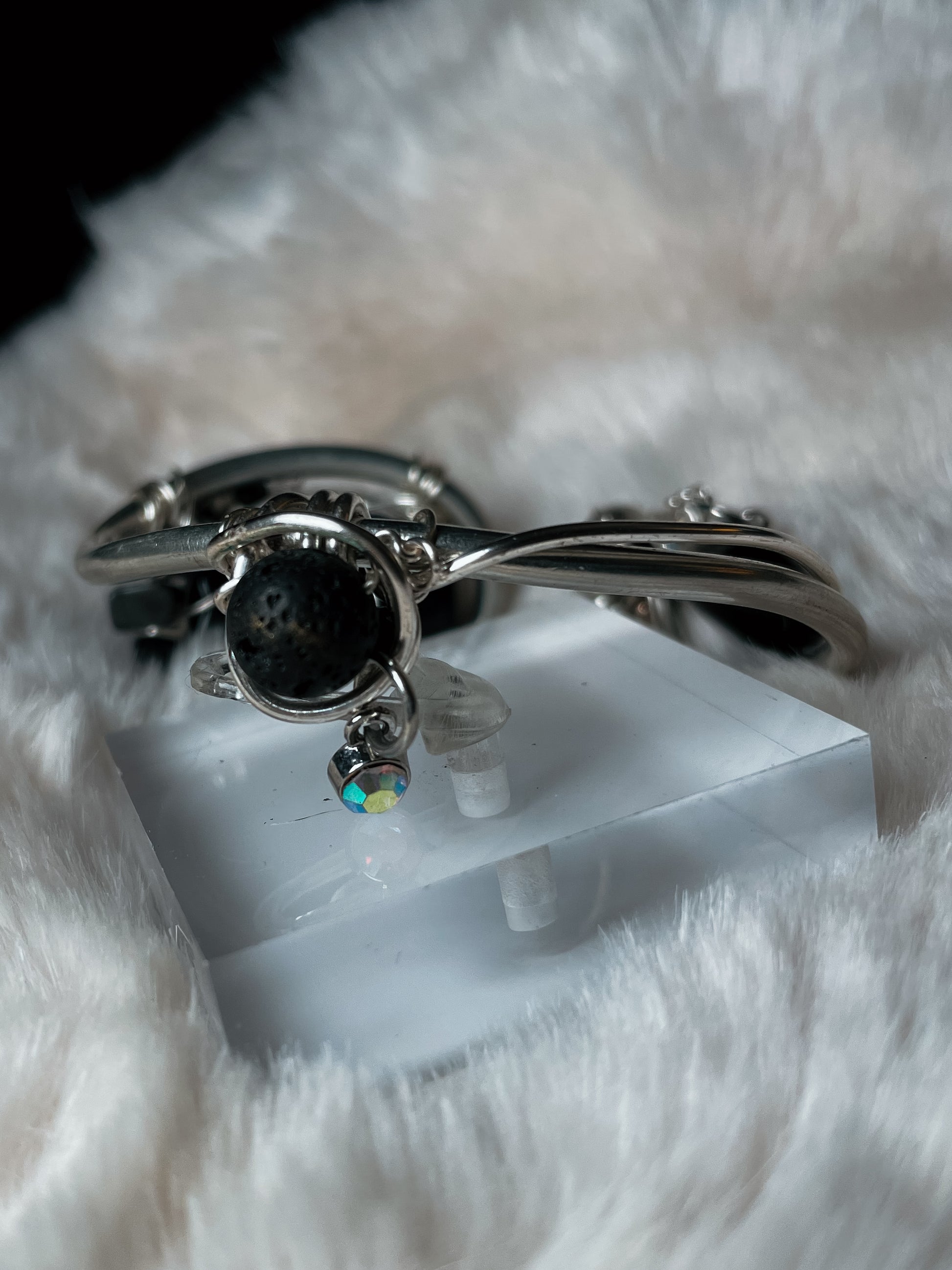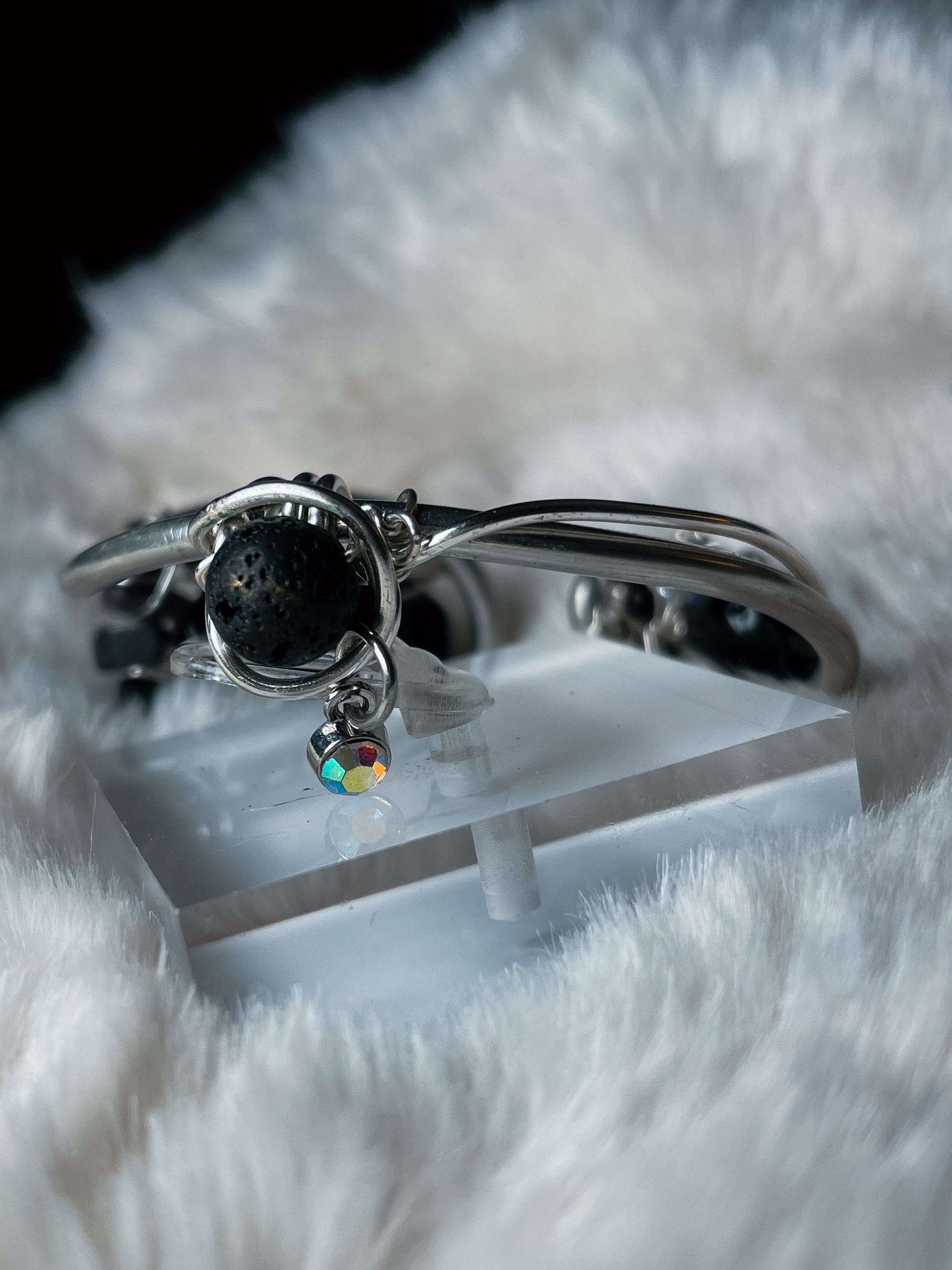 The bracelet features a bold Black Onyx focal stone, wrapped securely in silver to anchor and protect the wearer’s energy. Accented with clear quartz for amplification and Swarovski crystals for light and refinement, the design is completed with a lava rock bead on the back, allowing the bracelet to double as an aromatherapy piece—simply add a drop of essential oil for all-day grounding.