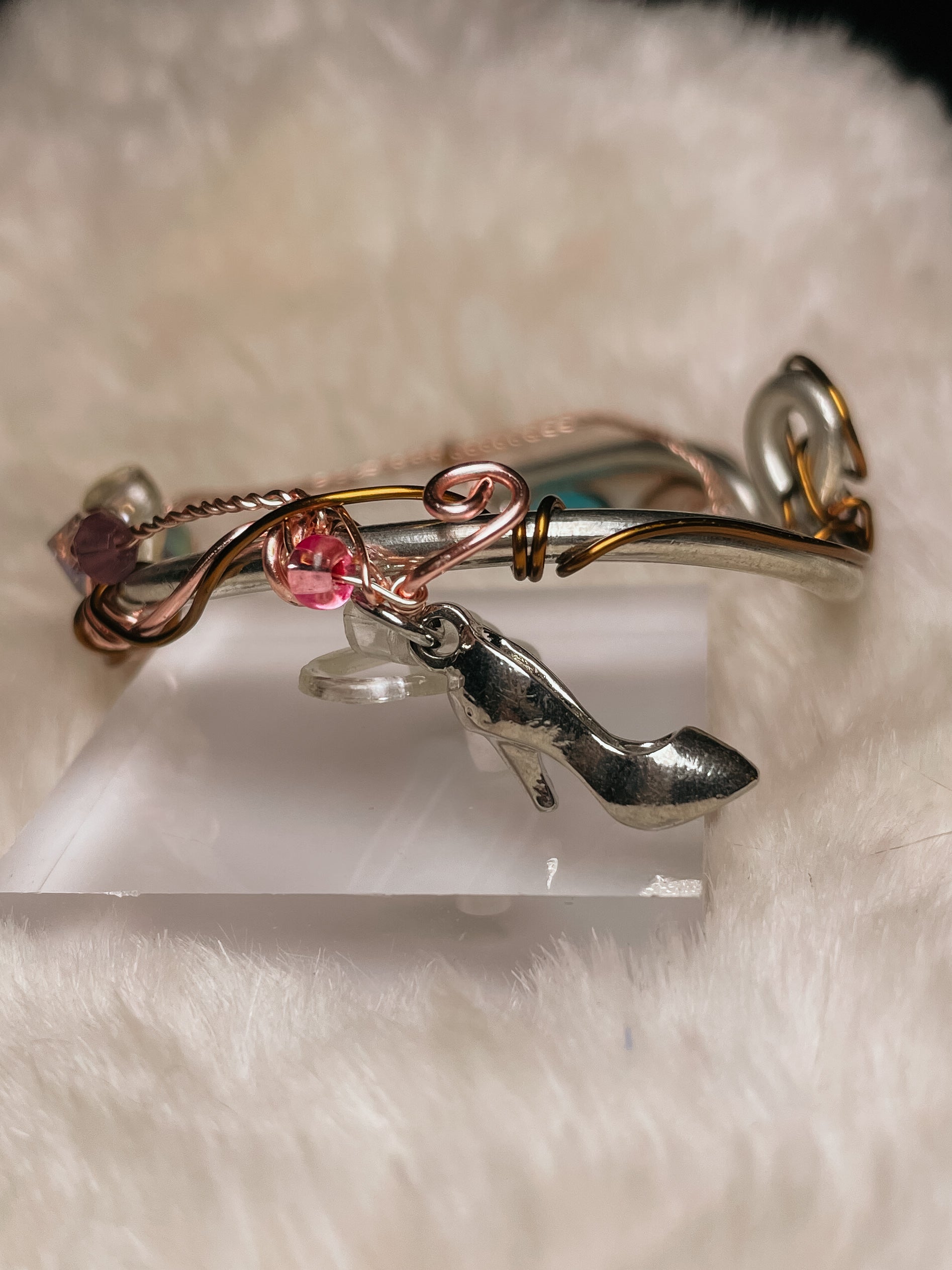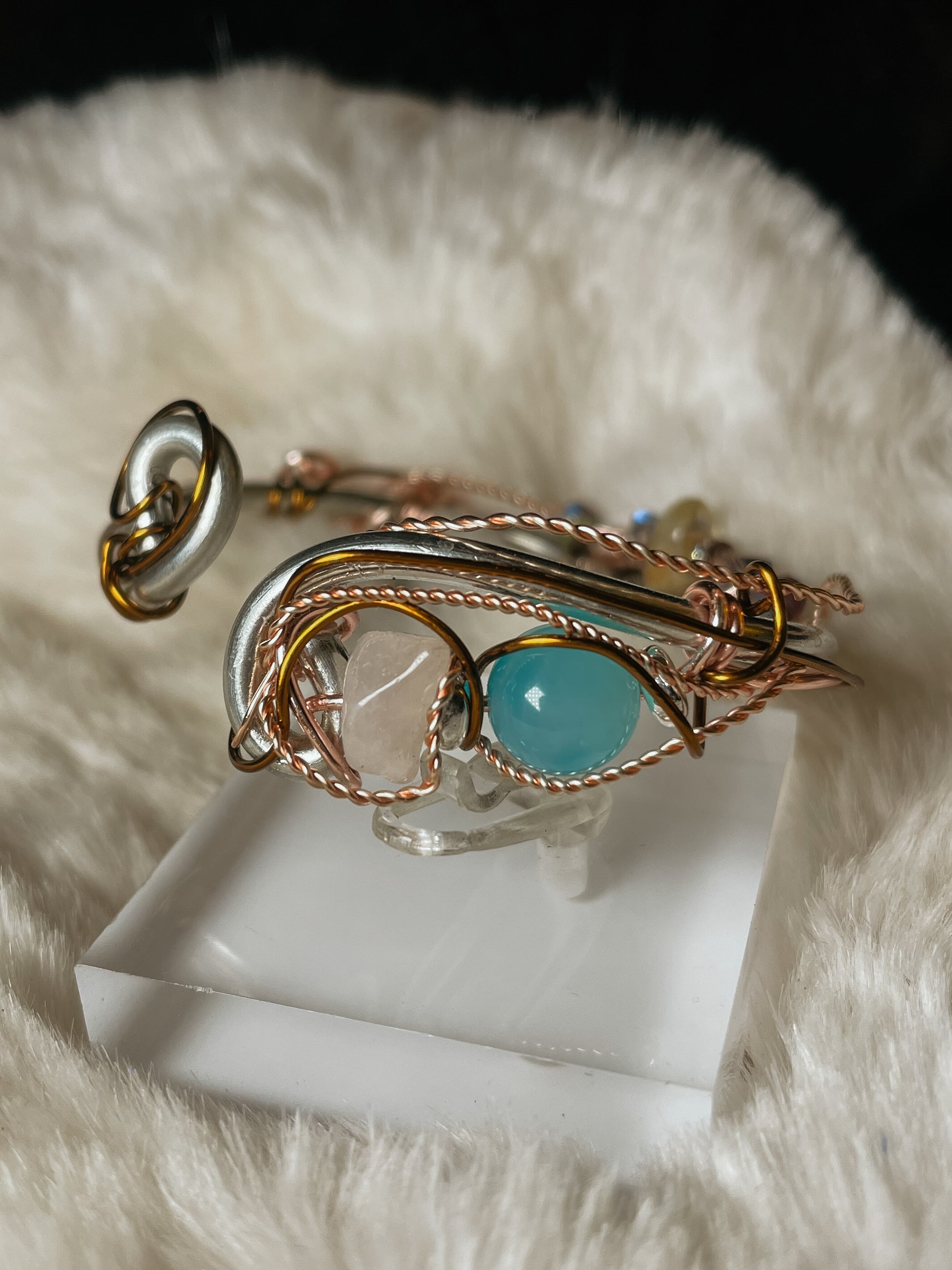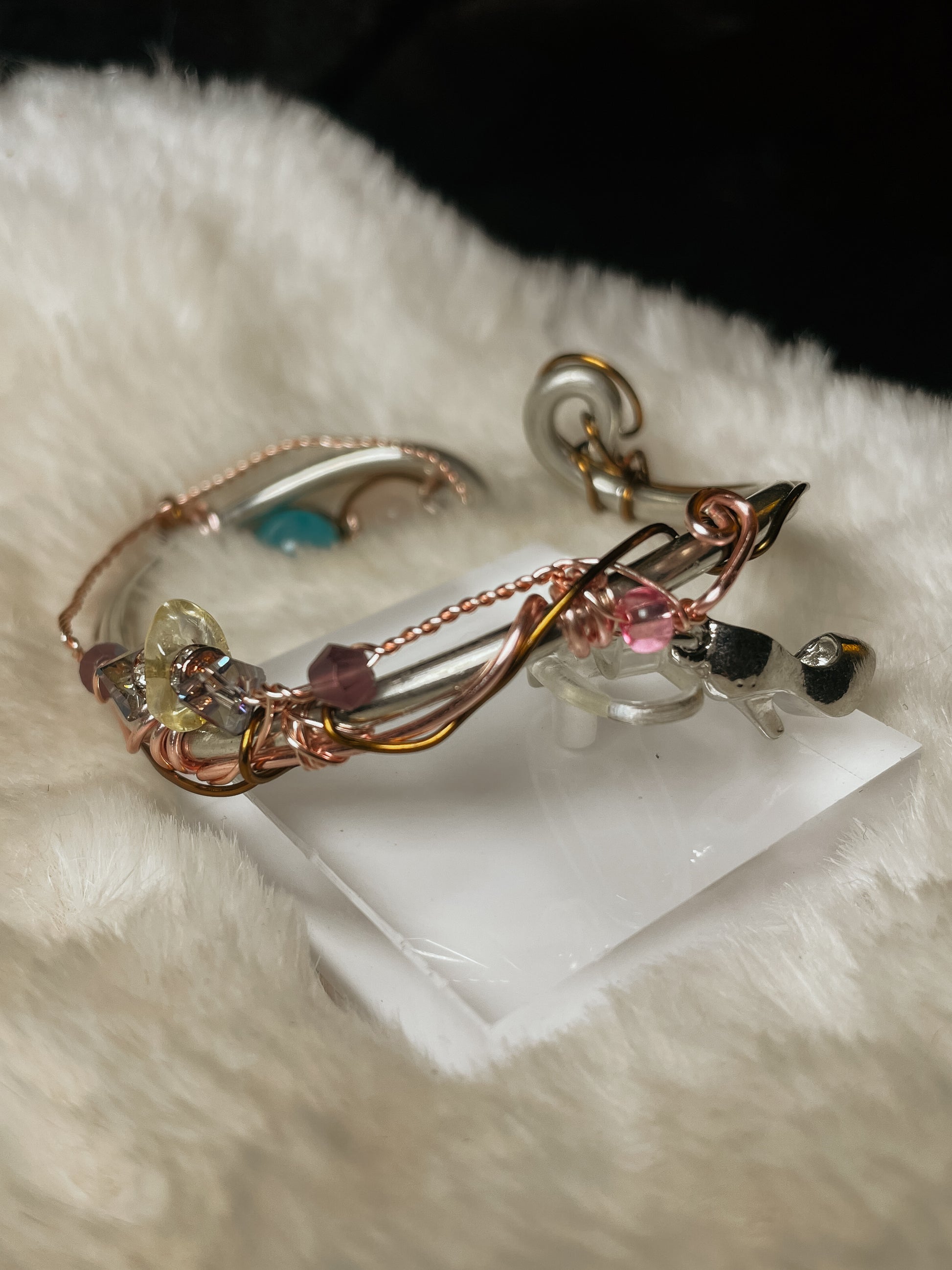 The sculptural silver framework is wrapped with intention, accented by warm copper tones and delicate stones chosen for balance, clarity, and confidence. Designed to be worn multiple ways, Once Upon a Step reveals different facets depending on how it’s styled — much like a story that changes once you step into it yourself.