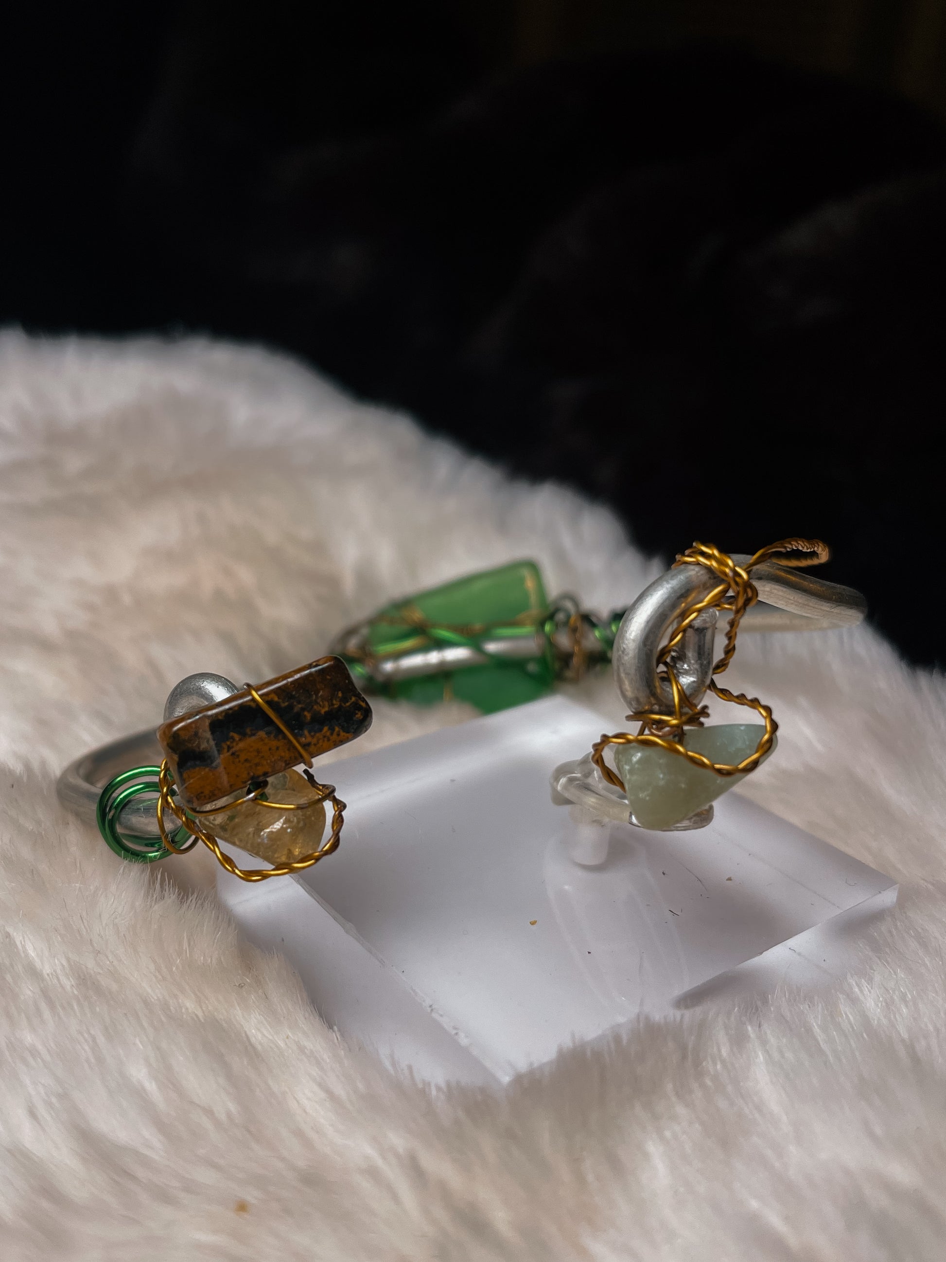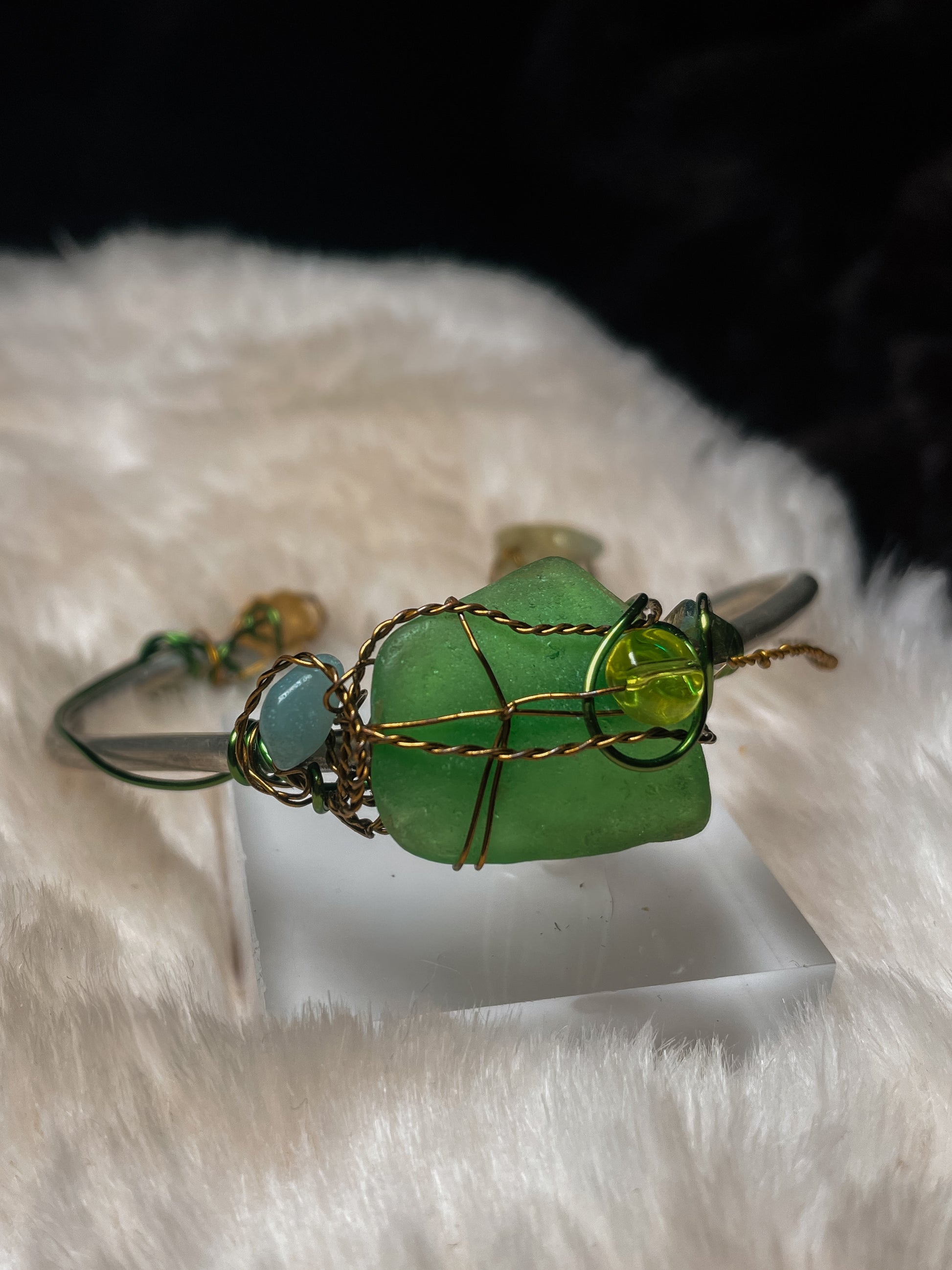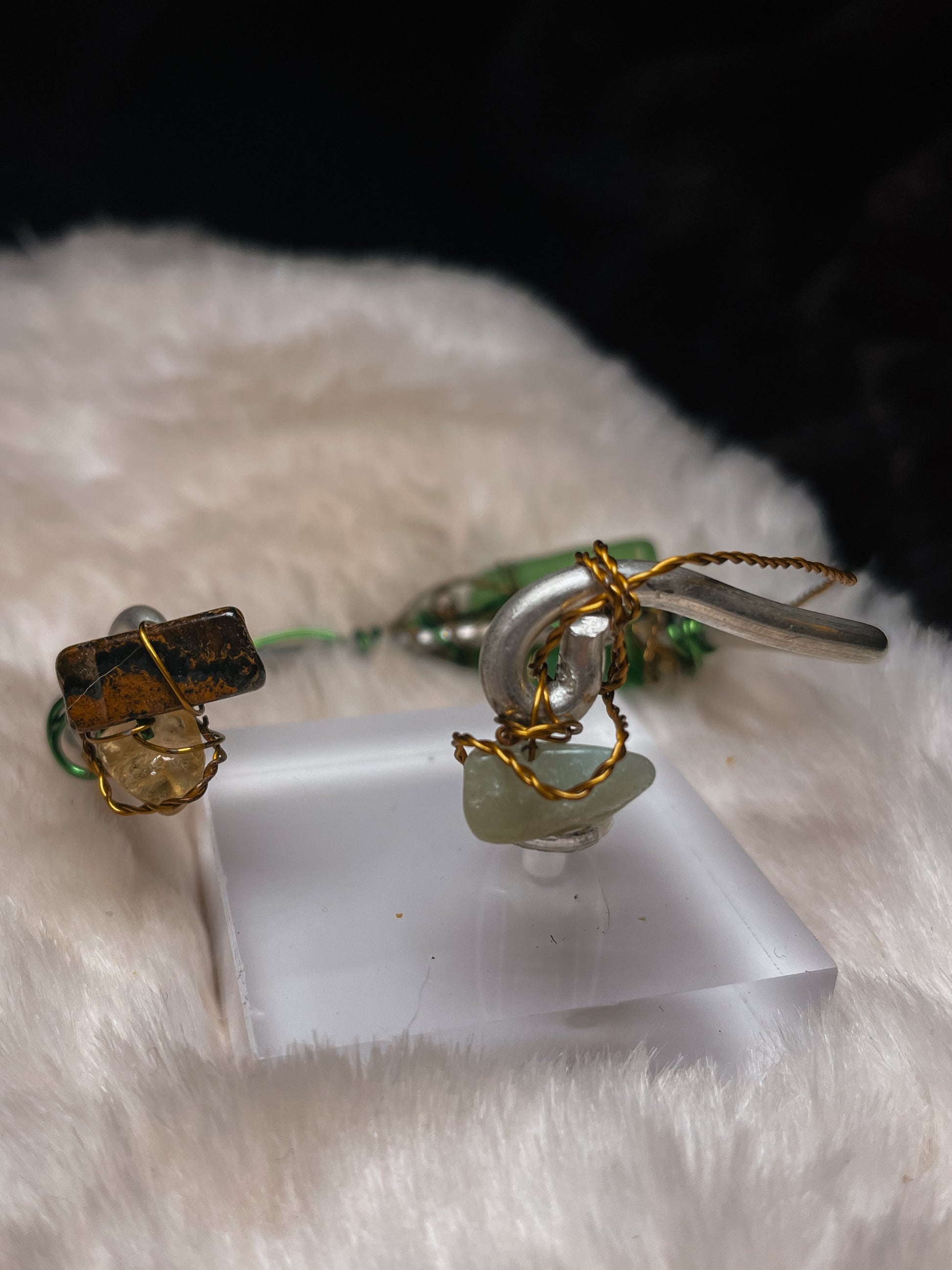 At the center is a naturally smoothed sea glass stone, shaped by water and time rather than tools. Surrounding it are carefully chosen accents of Larimar, Citrine, and Tiger’s Eye, creating a balance of calm, warmth, and grounded strength. The wirework is intentionally organic, echoing vines, shoreline curves, and relics discovered rather than manufactured.