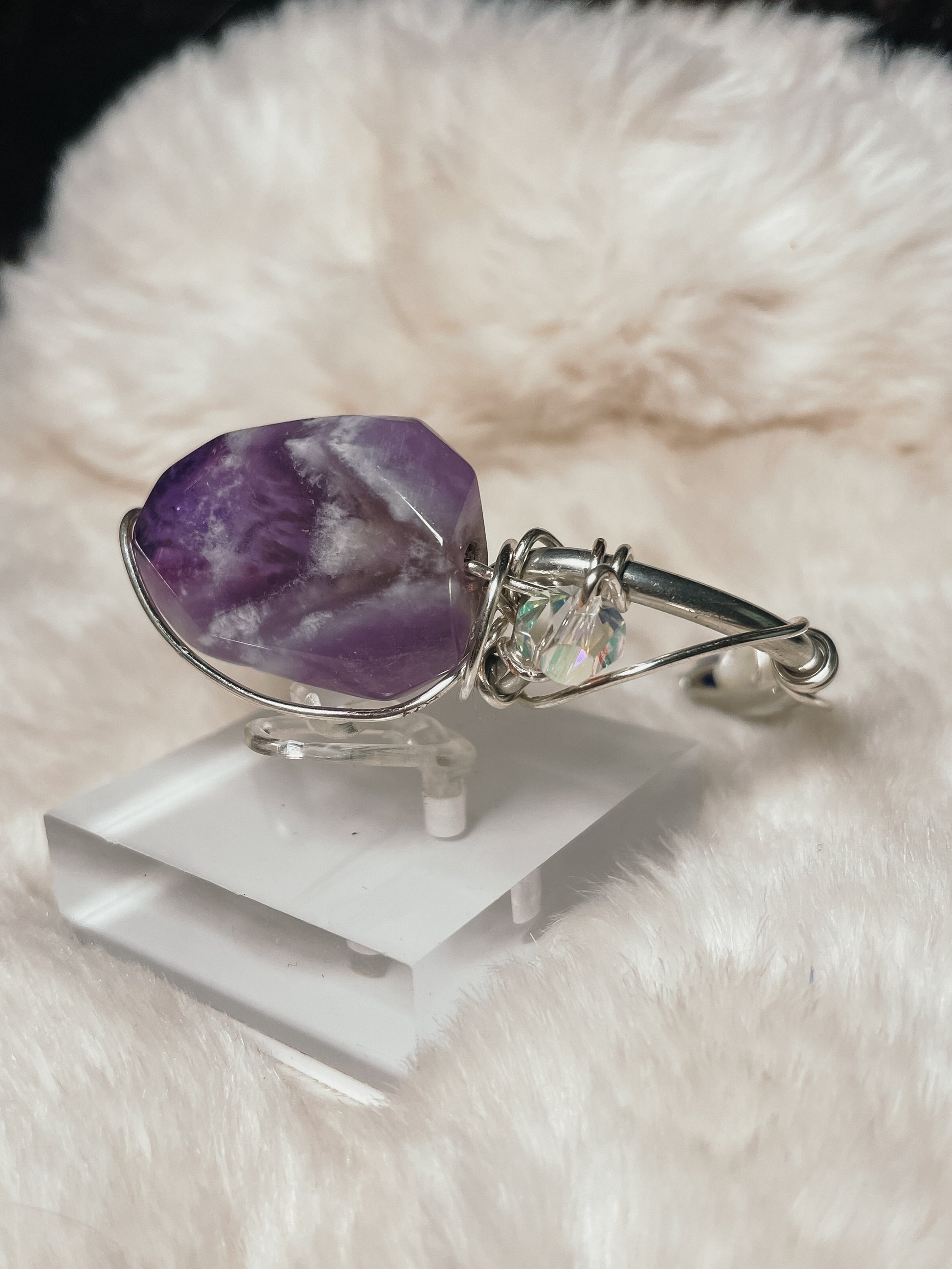 Hidden at the back, like a secret only the wearer knows, rests Mother-of-Pearl. Soft, luminous, and protective, it balances the intensity of Purple Haze with calm intuition and emotional flow — a reminder that even the boldest souls deserve gentleness.