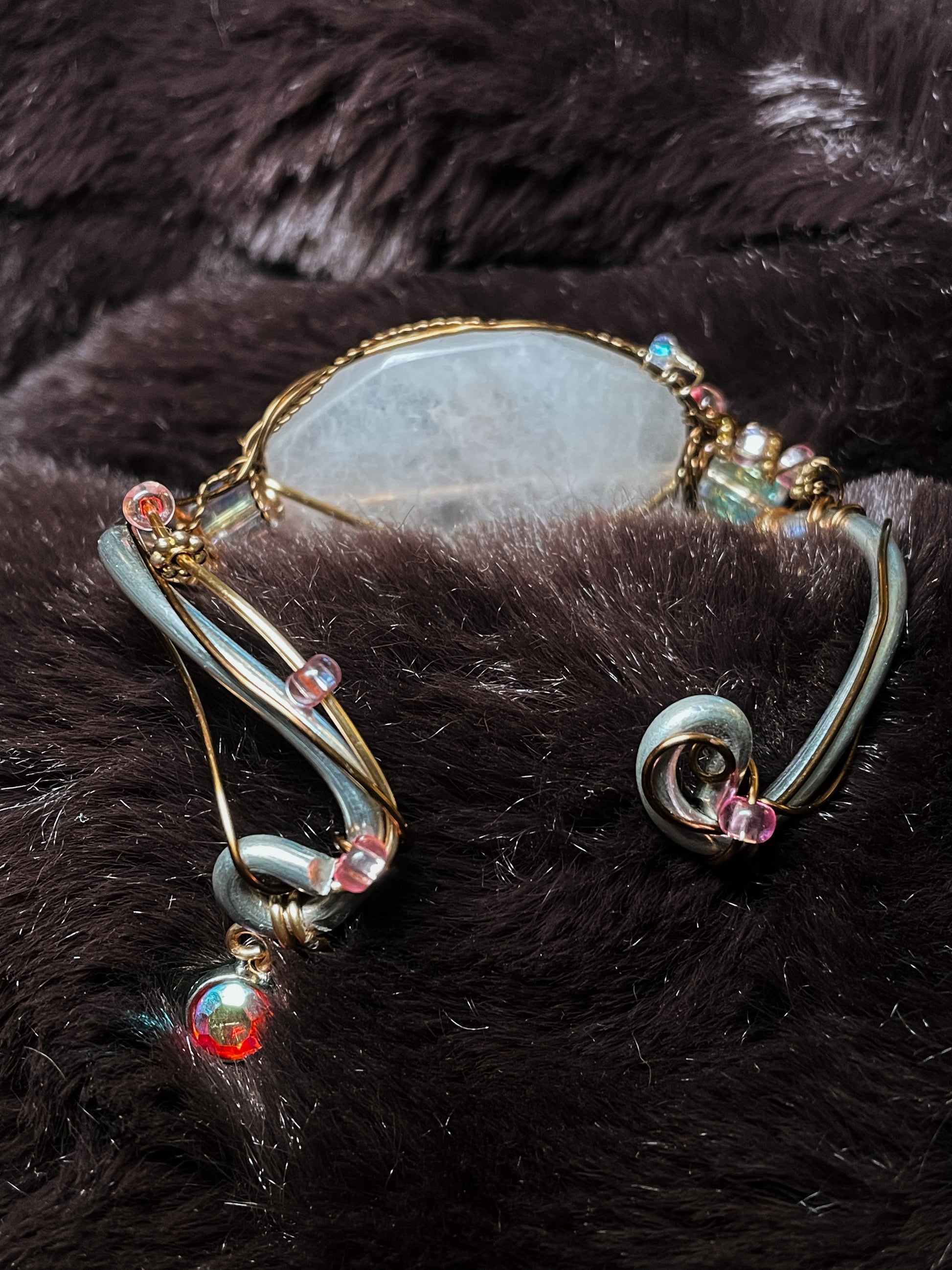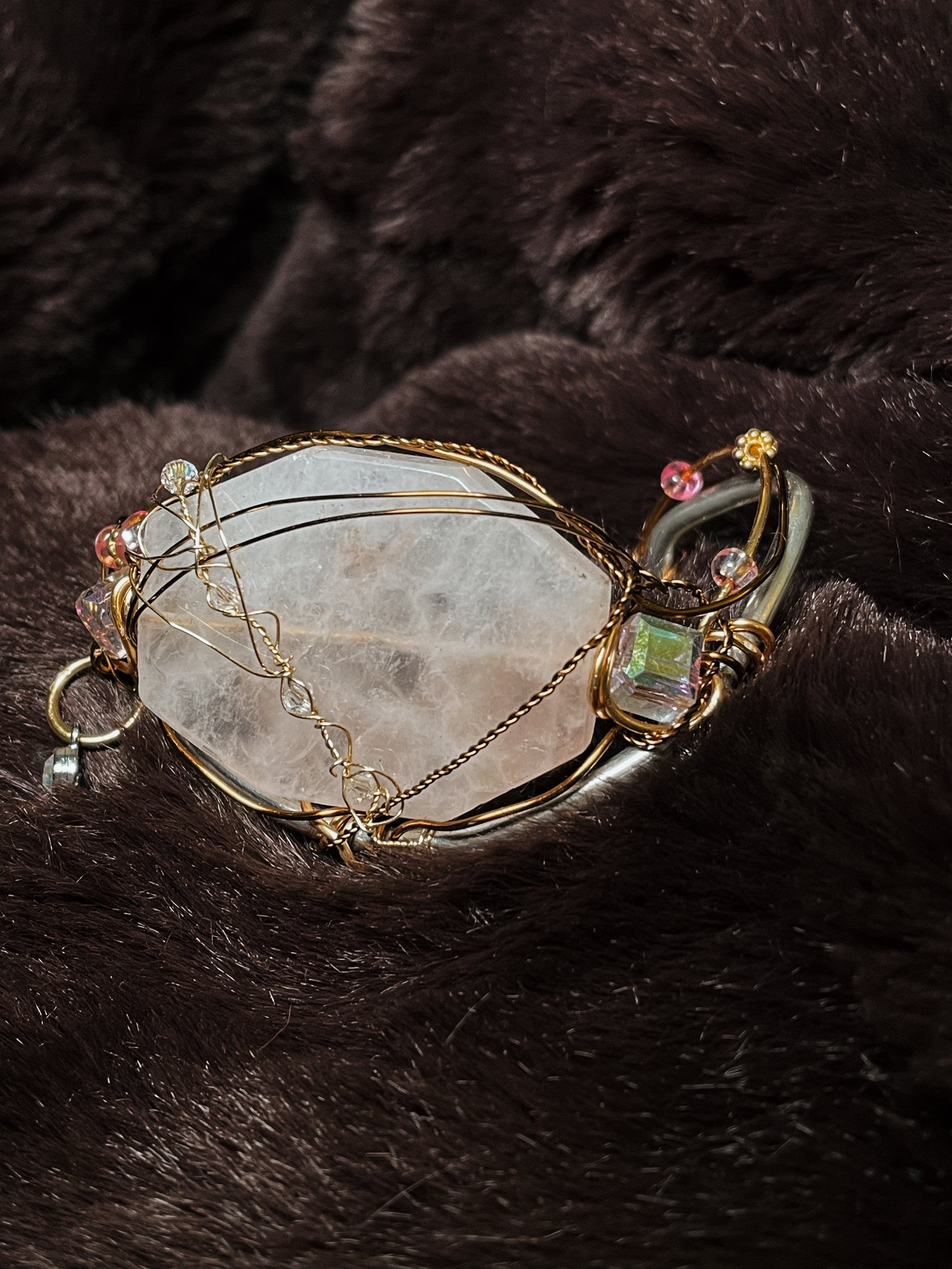 The rose quartz is cradled in sculptural silver wire, forming a protective cage that feels both delicate and powerful. Soft pink crystal accents catch the light like a blush of moonrise, while the organic wrap creates an armor-meets-romance silhouette.