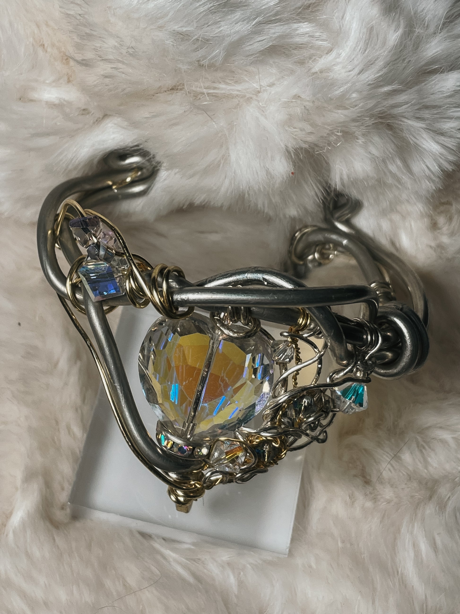 This piece is a study in contrast: raw metal tension softened by luminous clarity, structure balanced by fluidity. Every curve of wire is hand-formed, giving the bracelet an organic, sculptural presence that adapts effortlessly to the wearer. Designed to be worn multiple ways, it moves with you—bold yet intimate, expressive yet grounded.