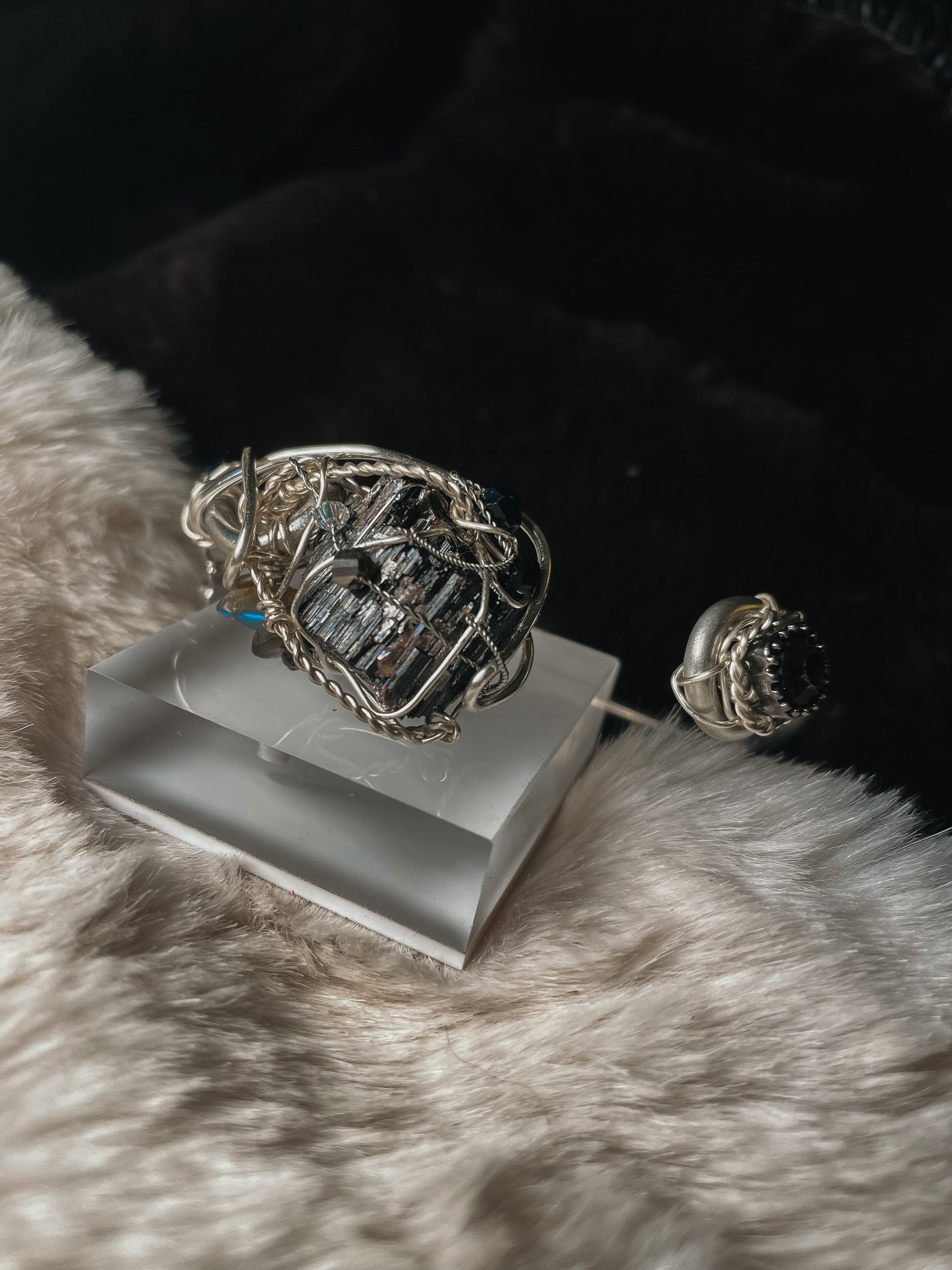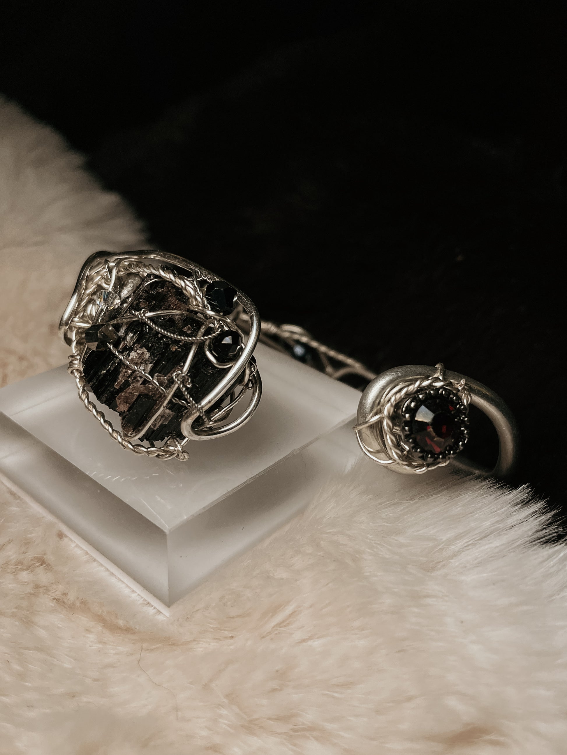 The tourmaline is secured with sculptural Argentinian silver wirework that preserves its raw texture and architectural form. Dark accent stones complement the depth of the crystal, giving the bracelet a refined, minimal presence while maintaining its powerful, talismanic character.