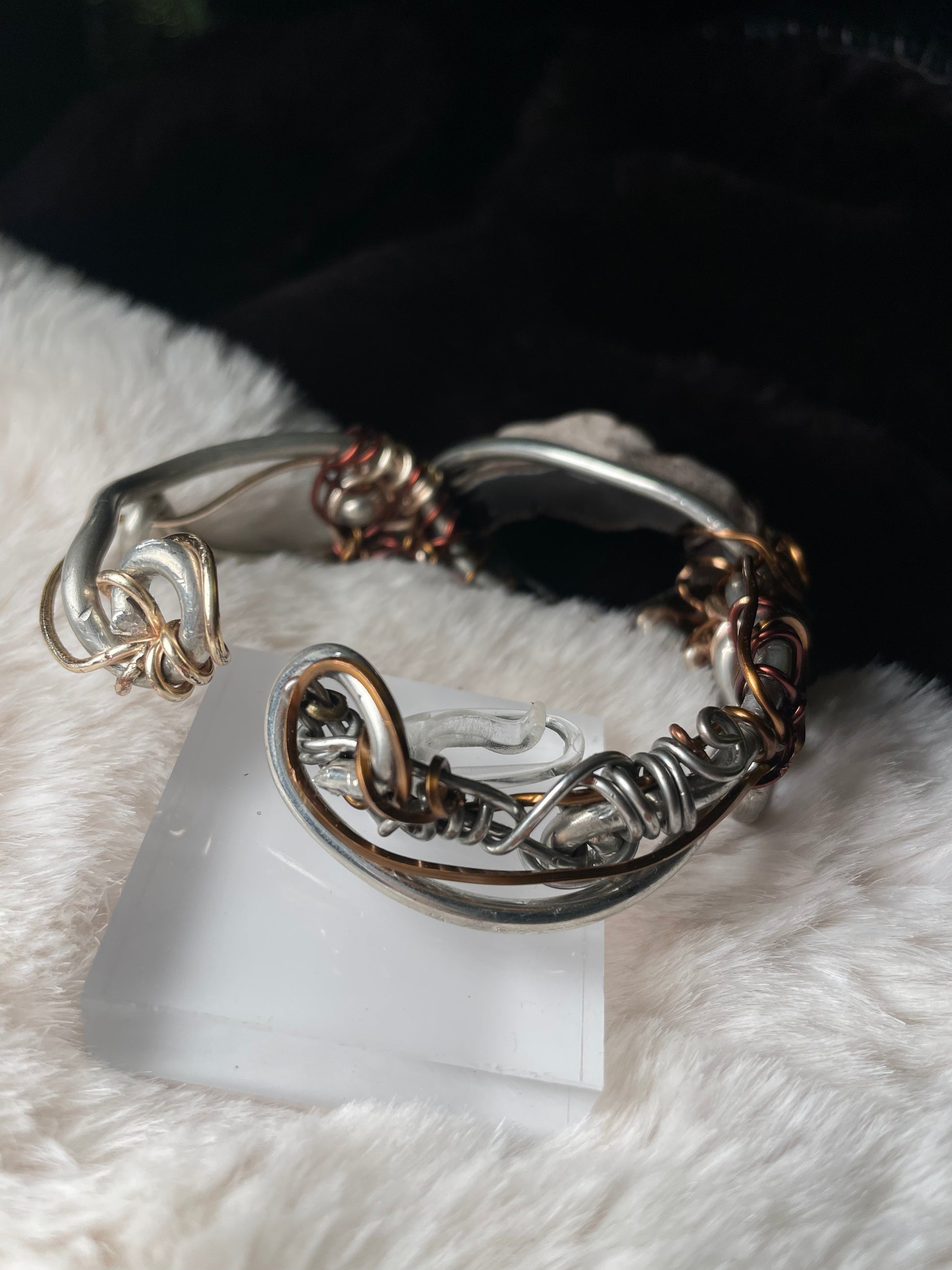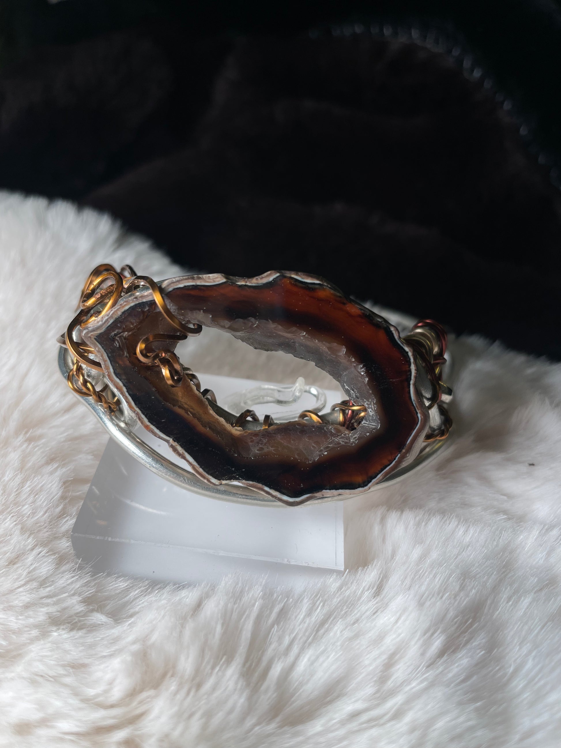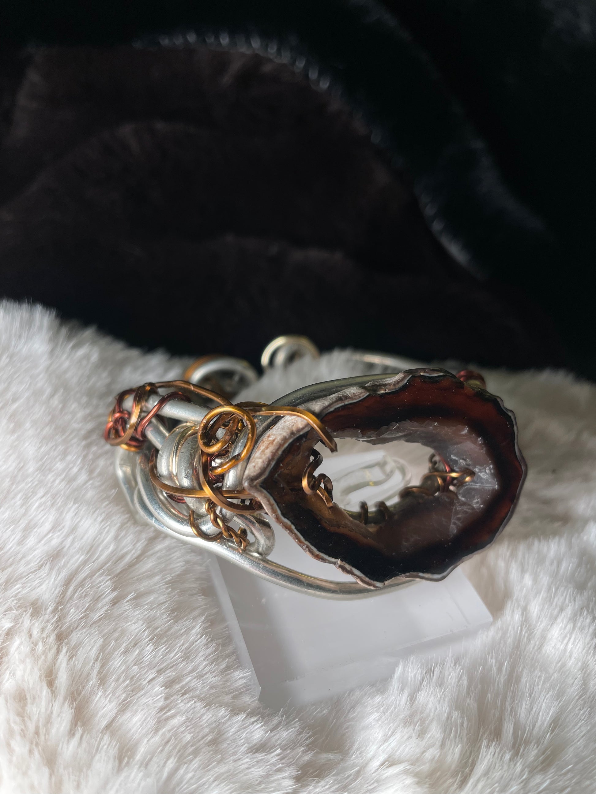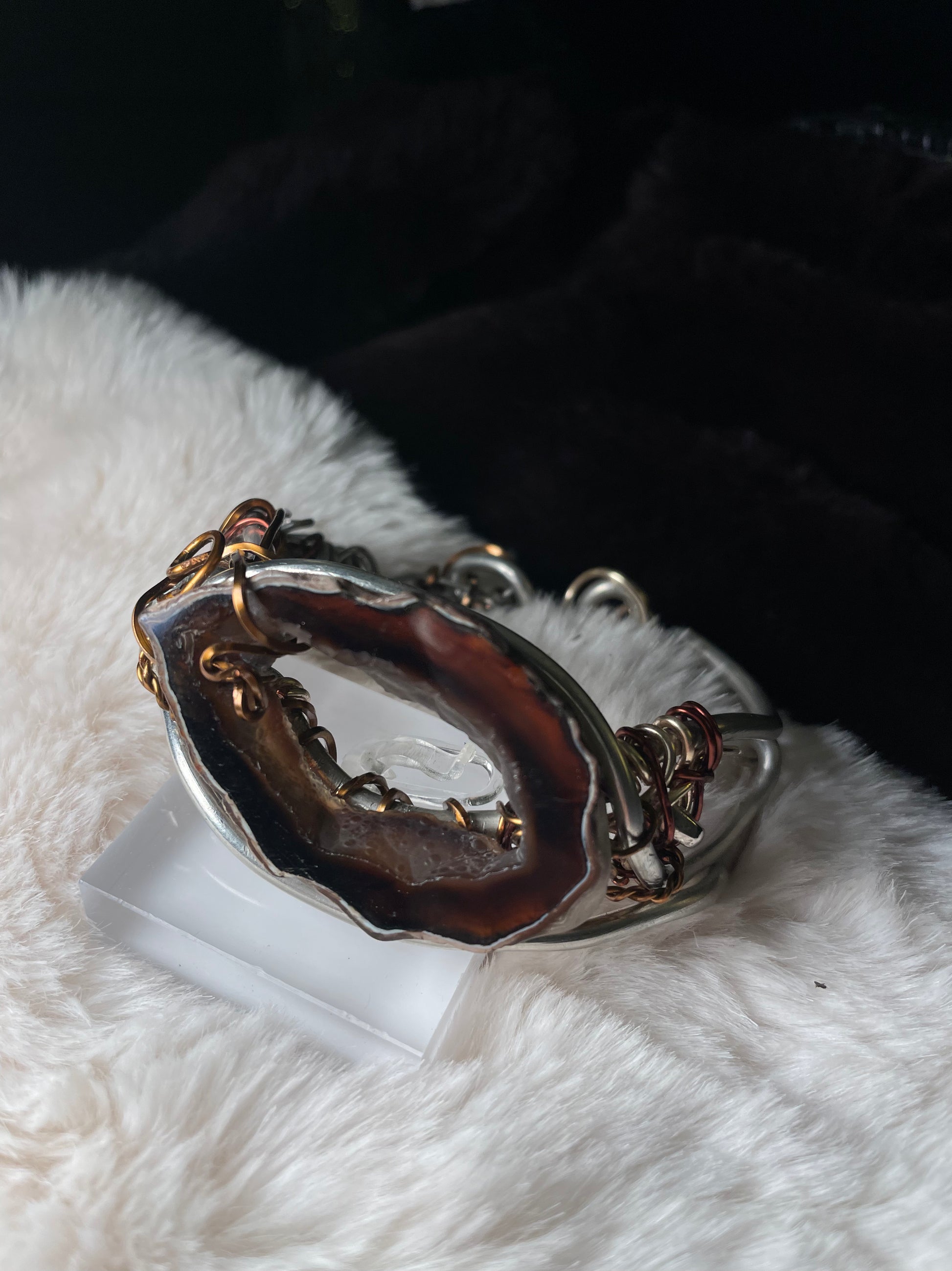 The open center of the stone evokes a symbolic portal, inviting clarity, self-reflection, and heightened perception. As light moves across its dark surface, the bracelet reveals hidden depth — a reminder that true understanding often lies beneath what first appears. Wrapped in sculptural silver wire, the form feels both shielding and expansive, offering energetic protection while encouraging personal growth and insight.