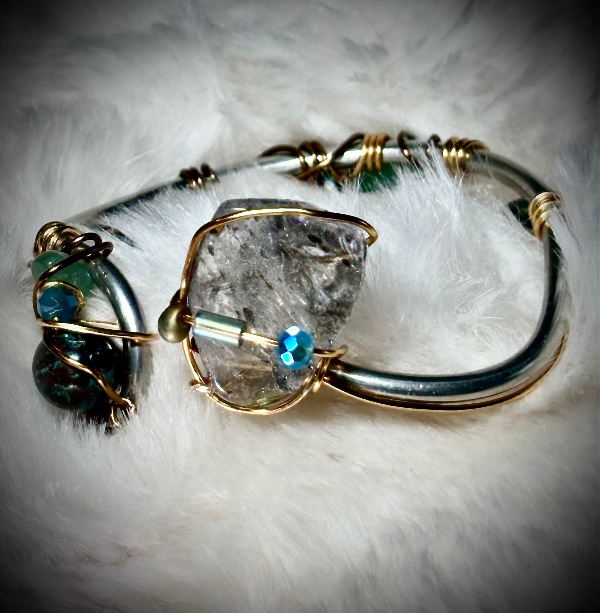 I created this bracelet around a striking piece of tourmalinated quartz — a crystal where clear quartz grew together with black tourmaline deep within the earth. Inside the stone you can see dark tourmaline rods stretching through the crystal like delicate branches suspended in light.