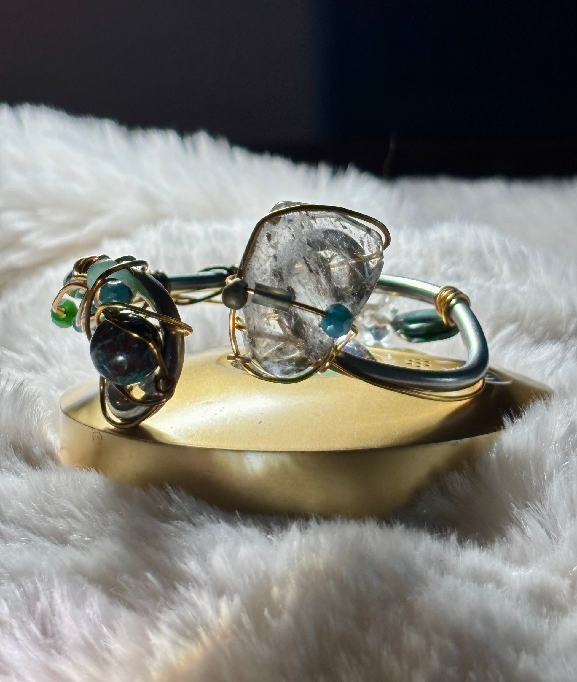 These natural mineral formations remind me of the hidden roots and branches of an ancient forest, growing quietly within the stone itself. Rather than altering its natural form, I shaped the gold around the crystal so it could remain wild and authentic, allowing the inner landscape of the stone to remain visible.