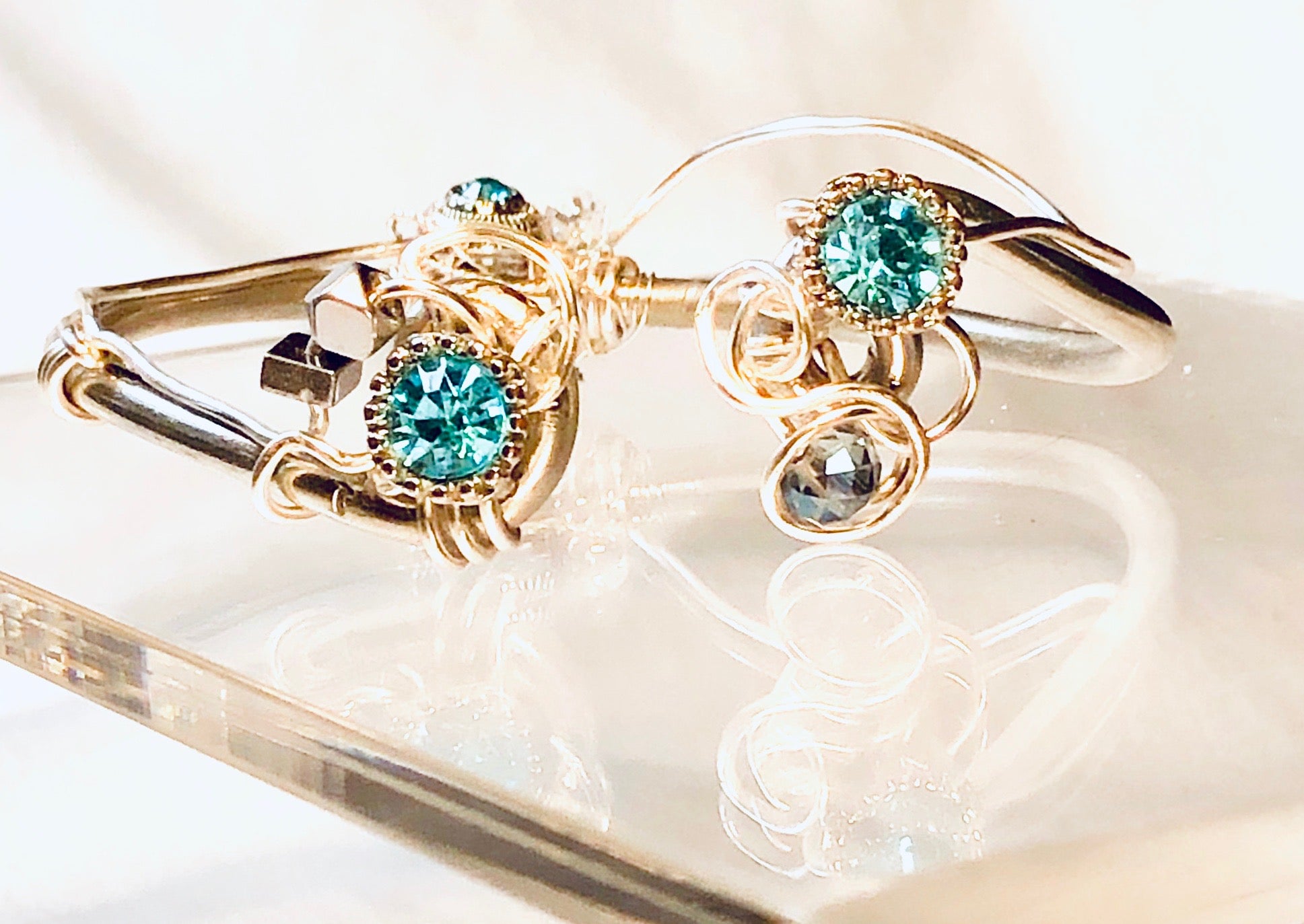 Aqua Maiden, from the Jewels Of Atlantis Collection. Rhinestones of aqua marine set in flowing setting of silver. This versatile piece can be worn with the closure in the front or back. Will not tarnish, does not contain lead, copper or nickel. Each item is a unique, hand-made creation, please allow for subtle differences that solidifies the distinctiveness of each piece.