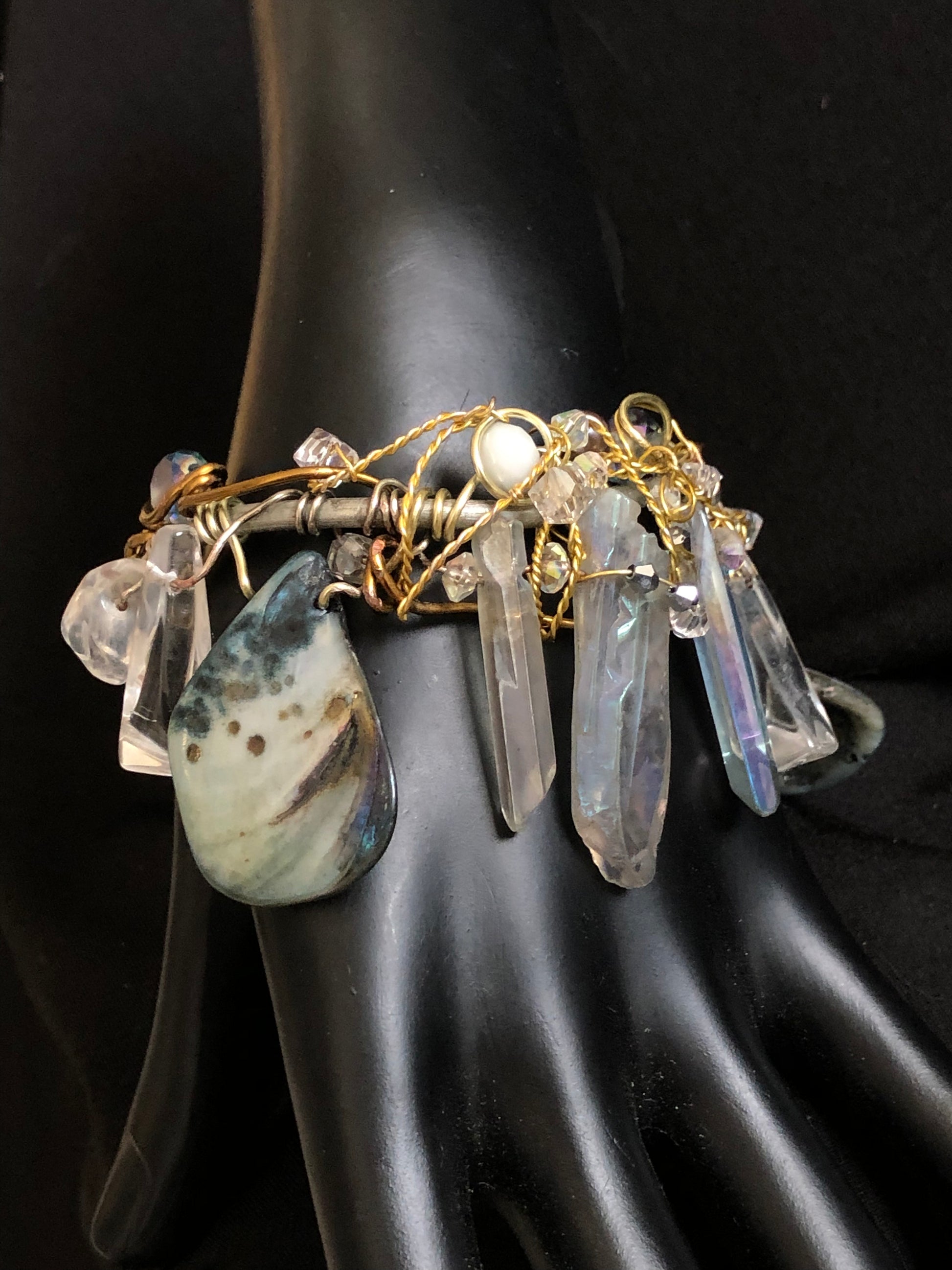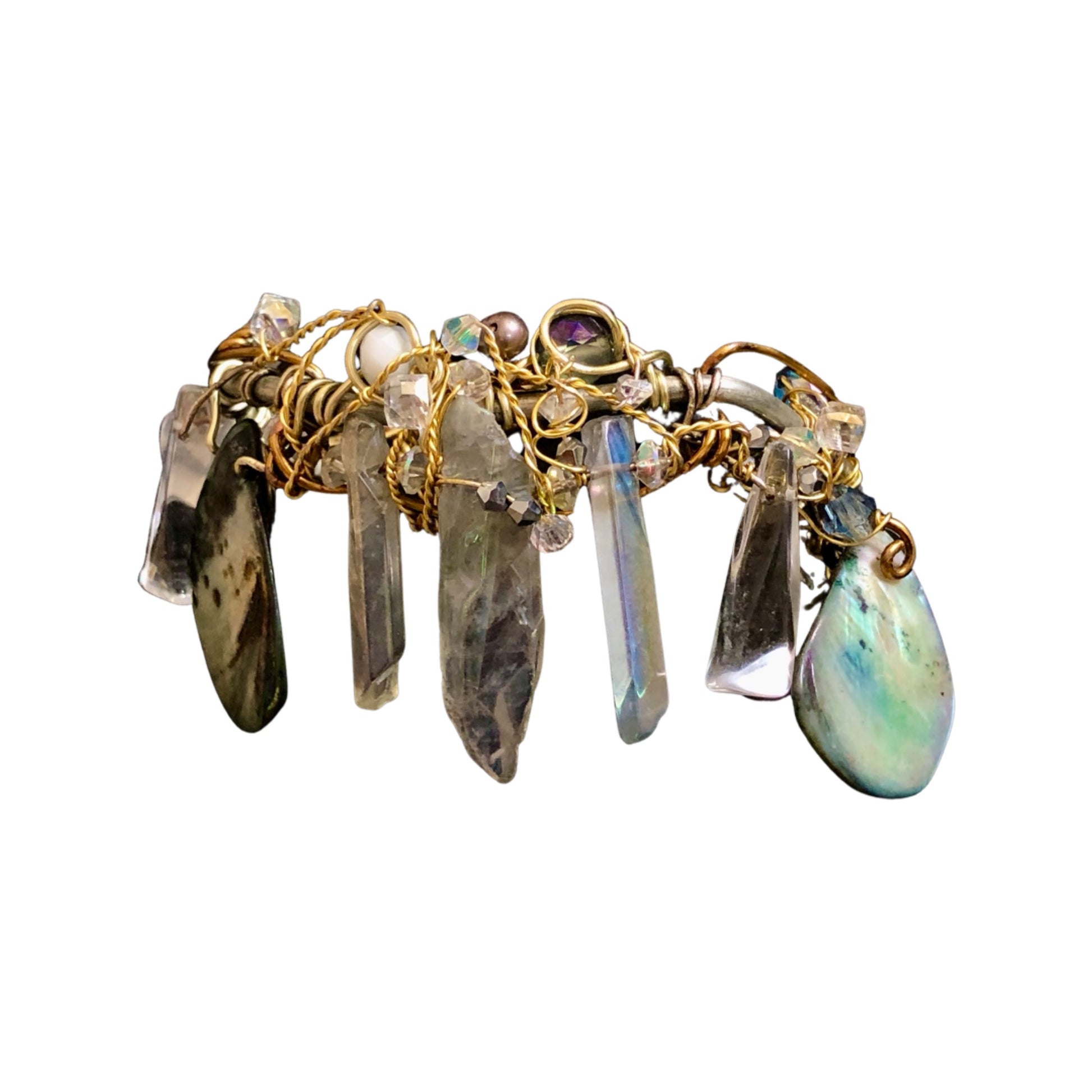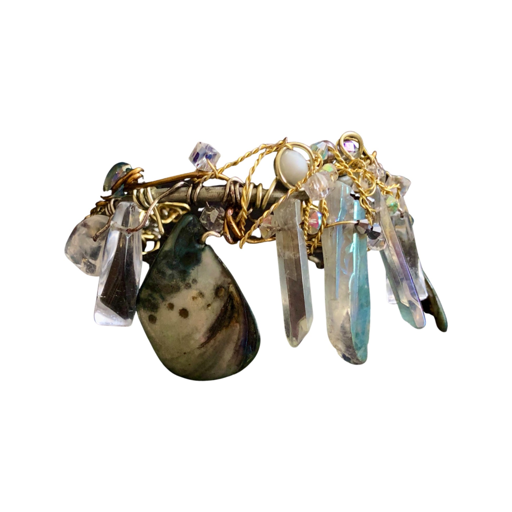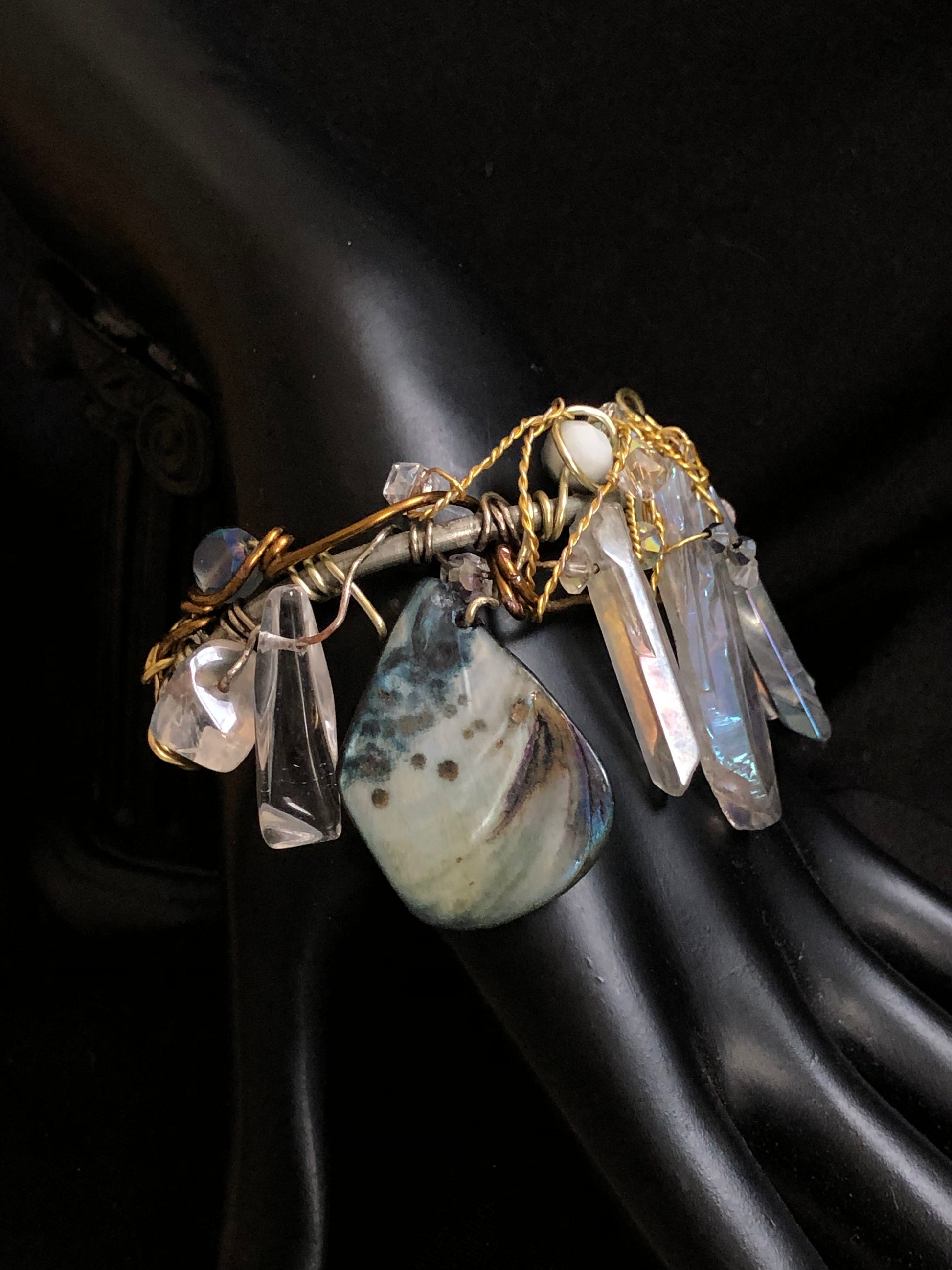 Introducing the Mystic Seas bracelet, a stunning piece of jewelry crafted with labradorite, abalone, and crystal beads. This bracelet is not only beautiful but also has several healing properties. Labradorite is the birthstone for those born in February and is associated with the zodiac sign of Aquarius. It's believed to reduce anxiety and stress, promote intuition and spiritual awareness, and balance hormones. Abalone is known for its calming energy and is thought to enhance compassion, love, and peace. It's also believed to help with emotional issues and promote harmony within relationships. Crystal beads are often used for their healing properties, including enhancing clarity and focus, promoting positive energy, and aiding in spiritual growth and development.