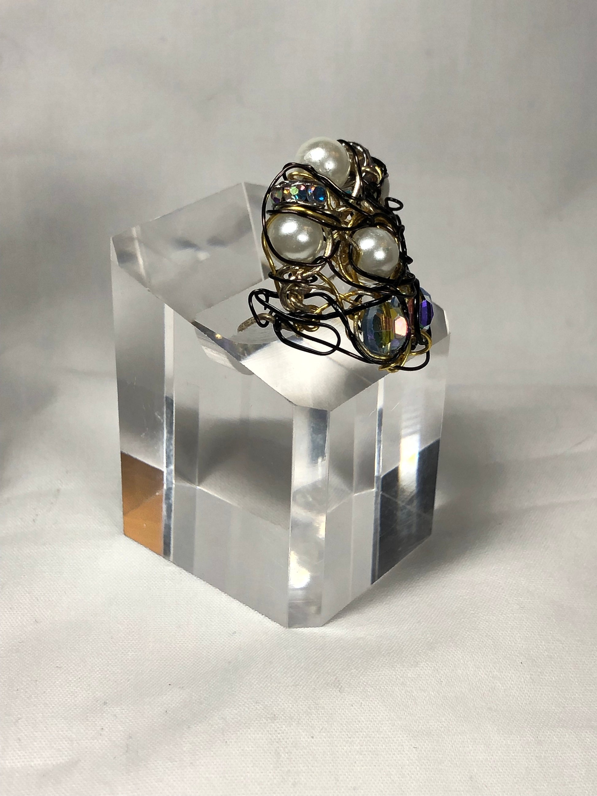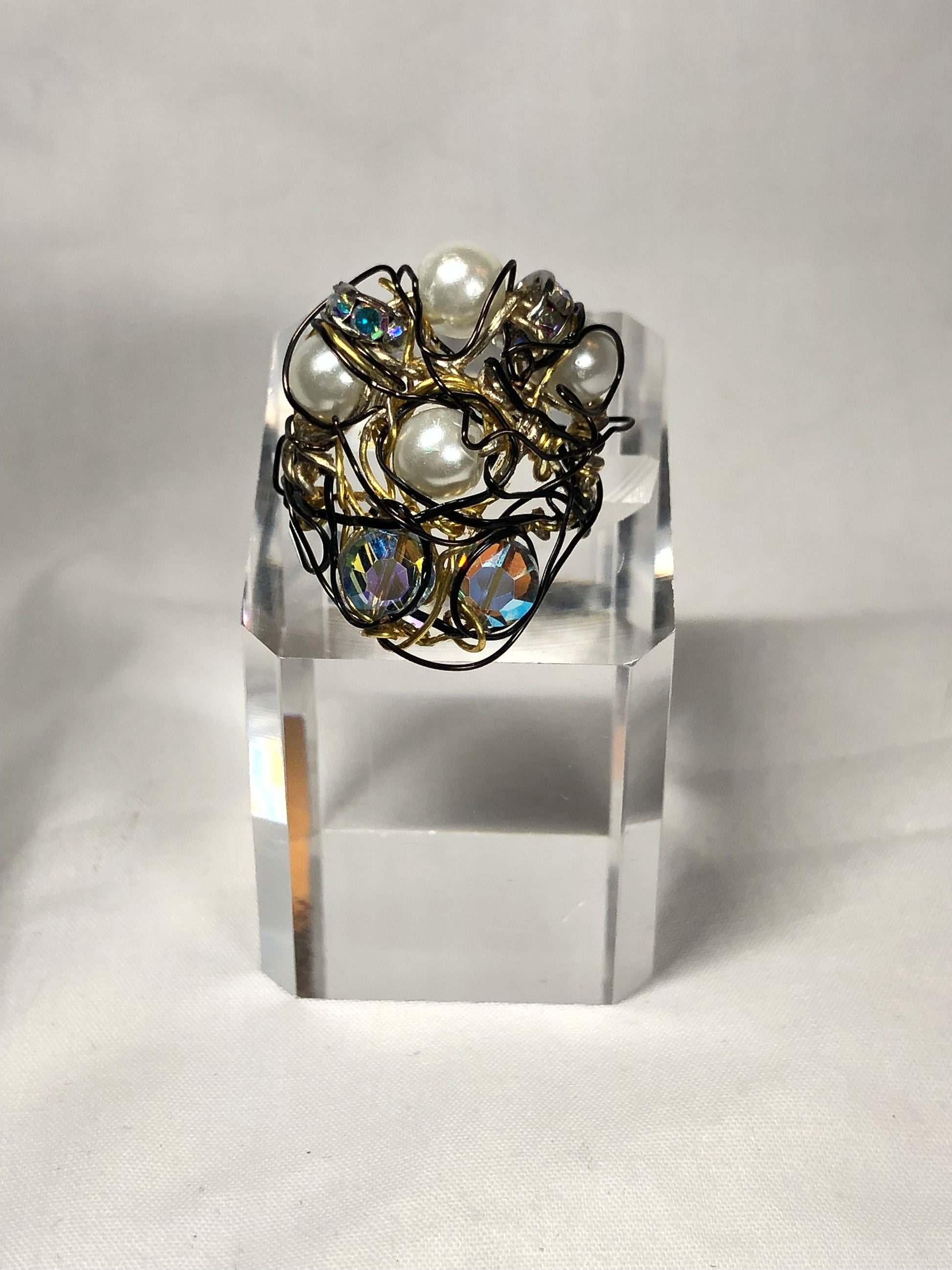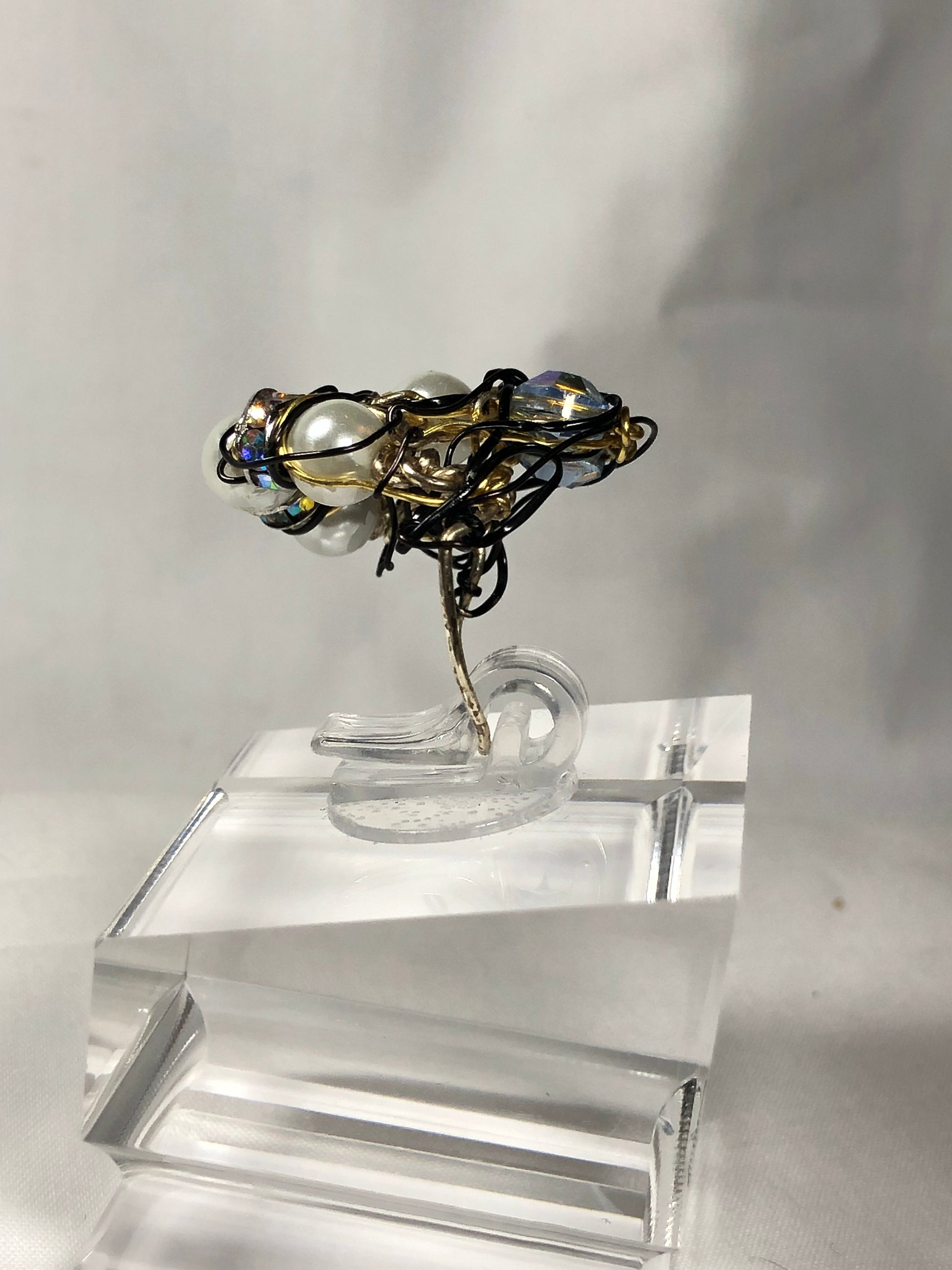 Presenting the enchanting "Ethereal Harmony" ring, a mesmerizing adornment that beautifully combines the elegance of four lustrous Pearls and the brilliance of two Swarovski crystals, delicately encased in intertwining gold and black wire. This unique ring exudes an aura of grace and sophistication, sure to captivate the hearts of all who behold it.