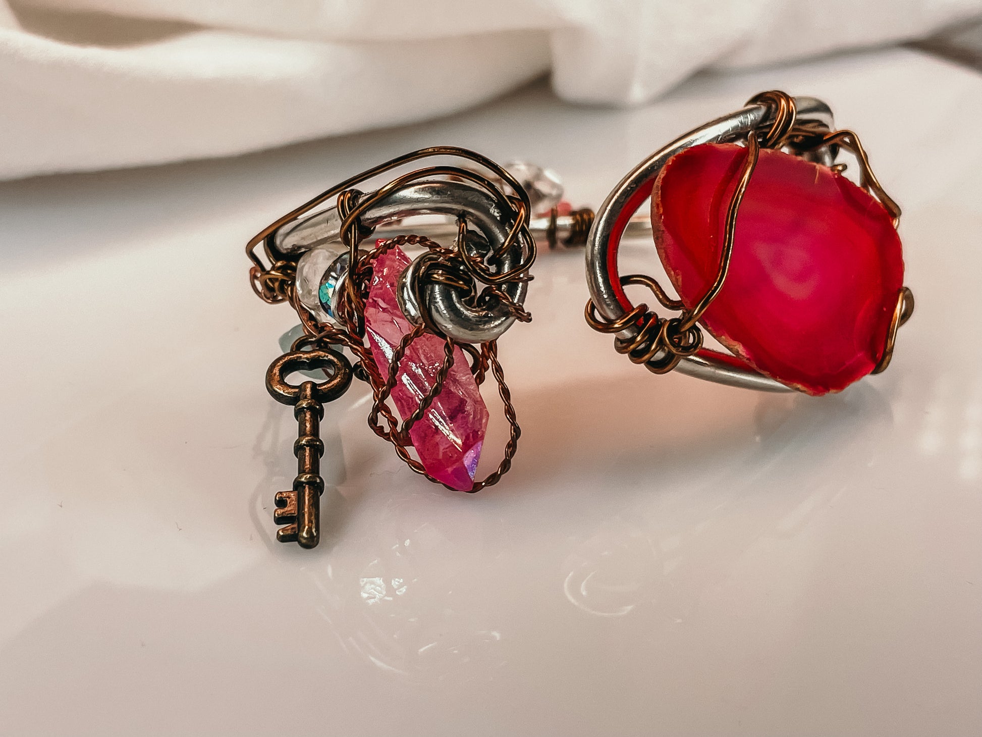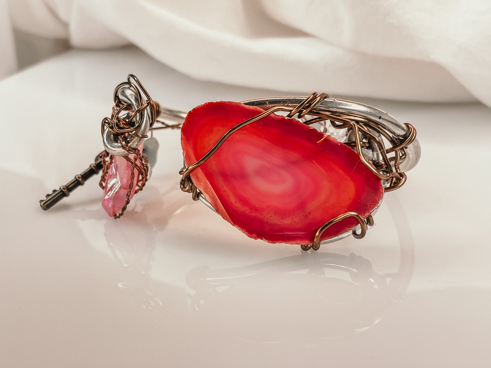 Introducing Aura! This stunning bracelet, featuring a vibrant hot pink agate, irradiated crystal, and larimar gemstones, set in hypoallergenic artesian silver. The hot pink agate is the birthstone for May, and is believed to promote balance and stability. The irradiated crystal is the birthstone for April, and is said to enhance clarity and spiritual awareness. The larimar stone is associated with the zodiac sign of Leo, and is believed to encourage inner peace and tranquility. Wear this beautiful bracelet for a pop of color and to harness the healing properties of these powerful gemstones.