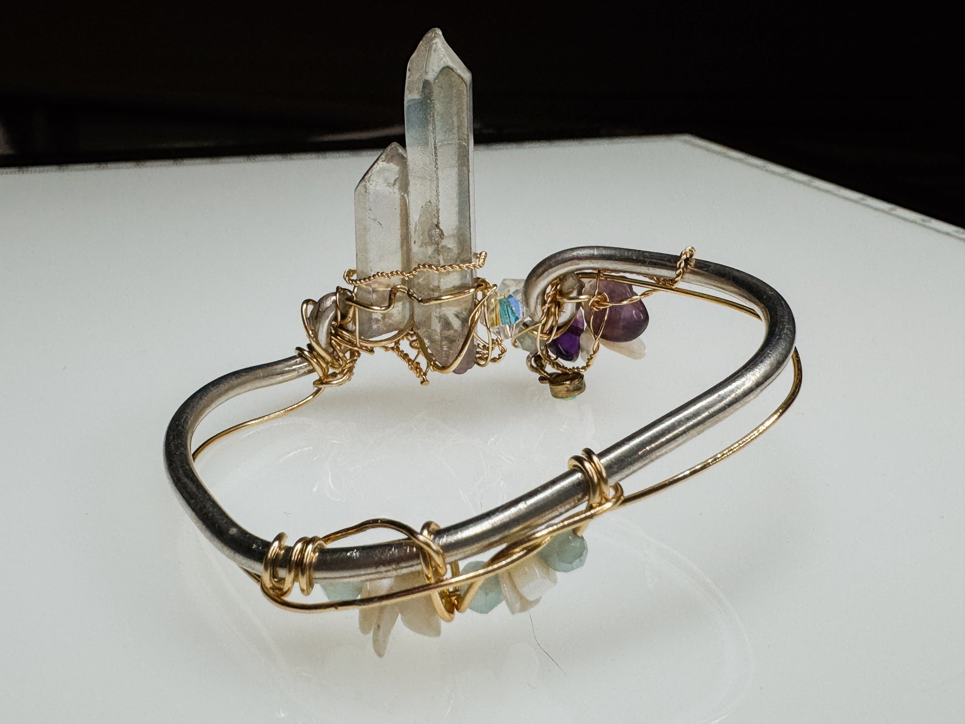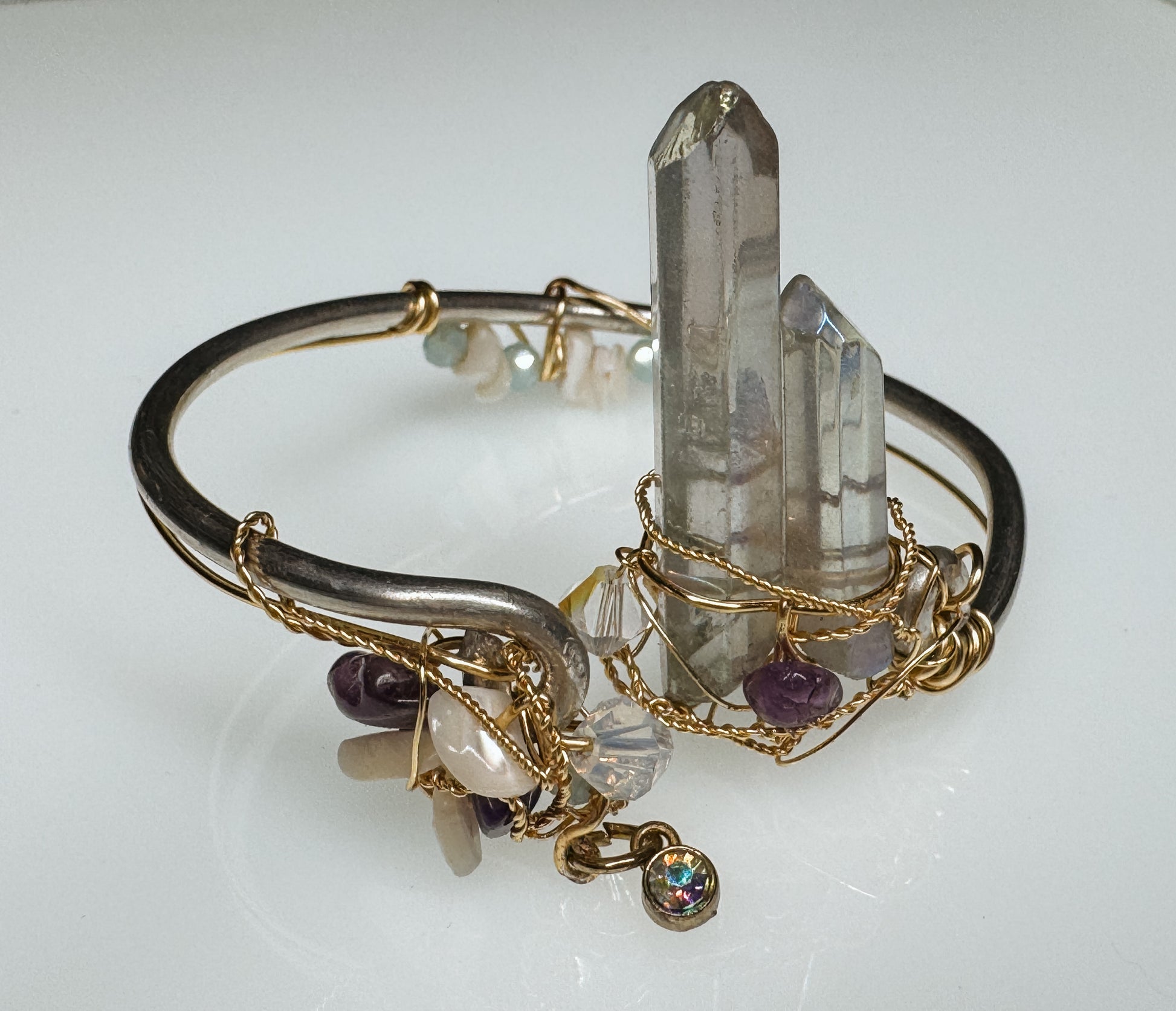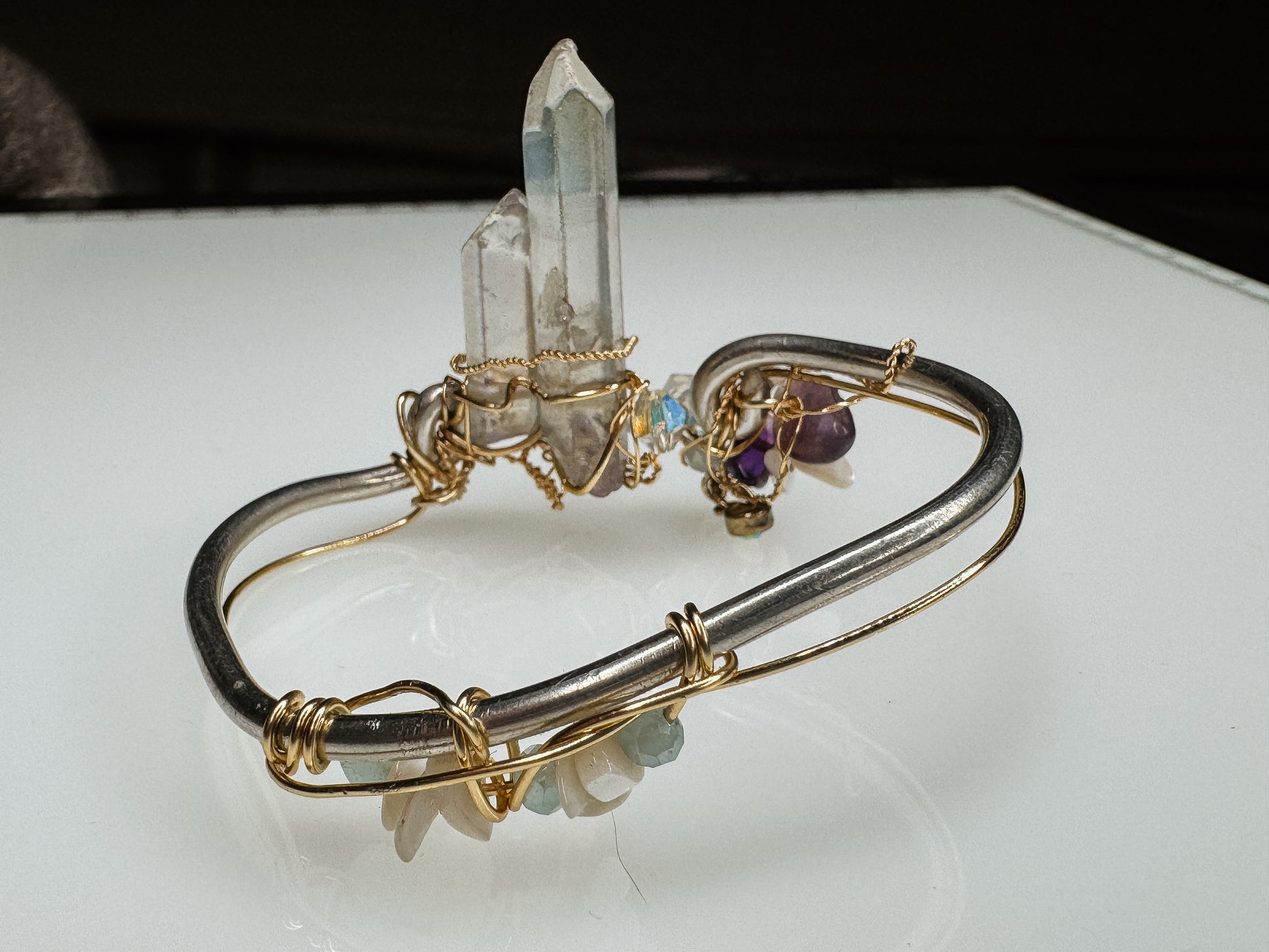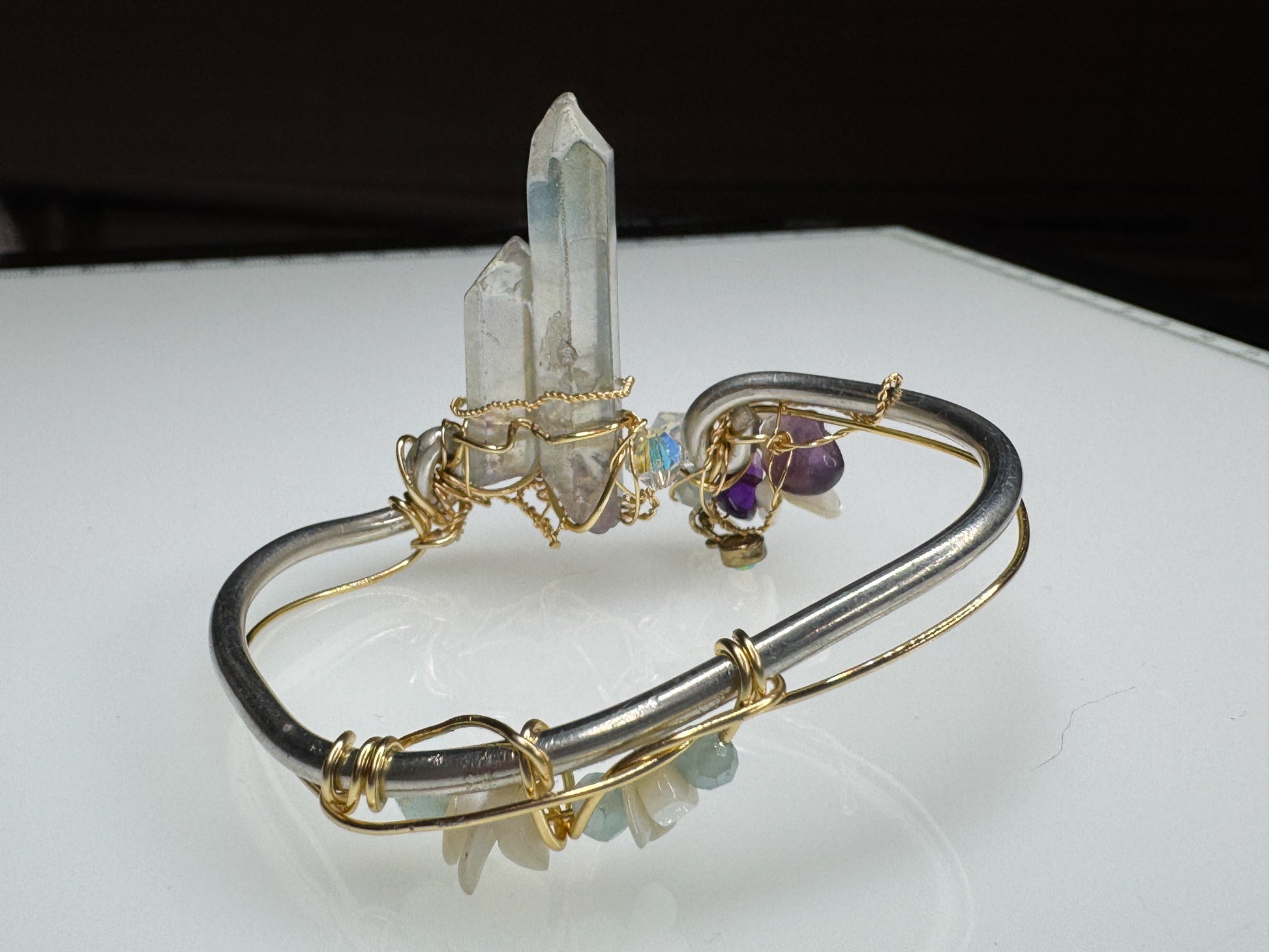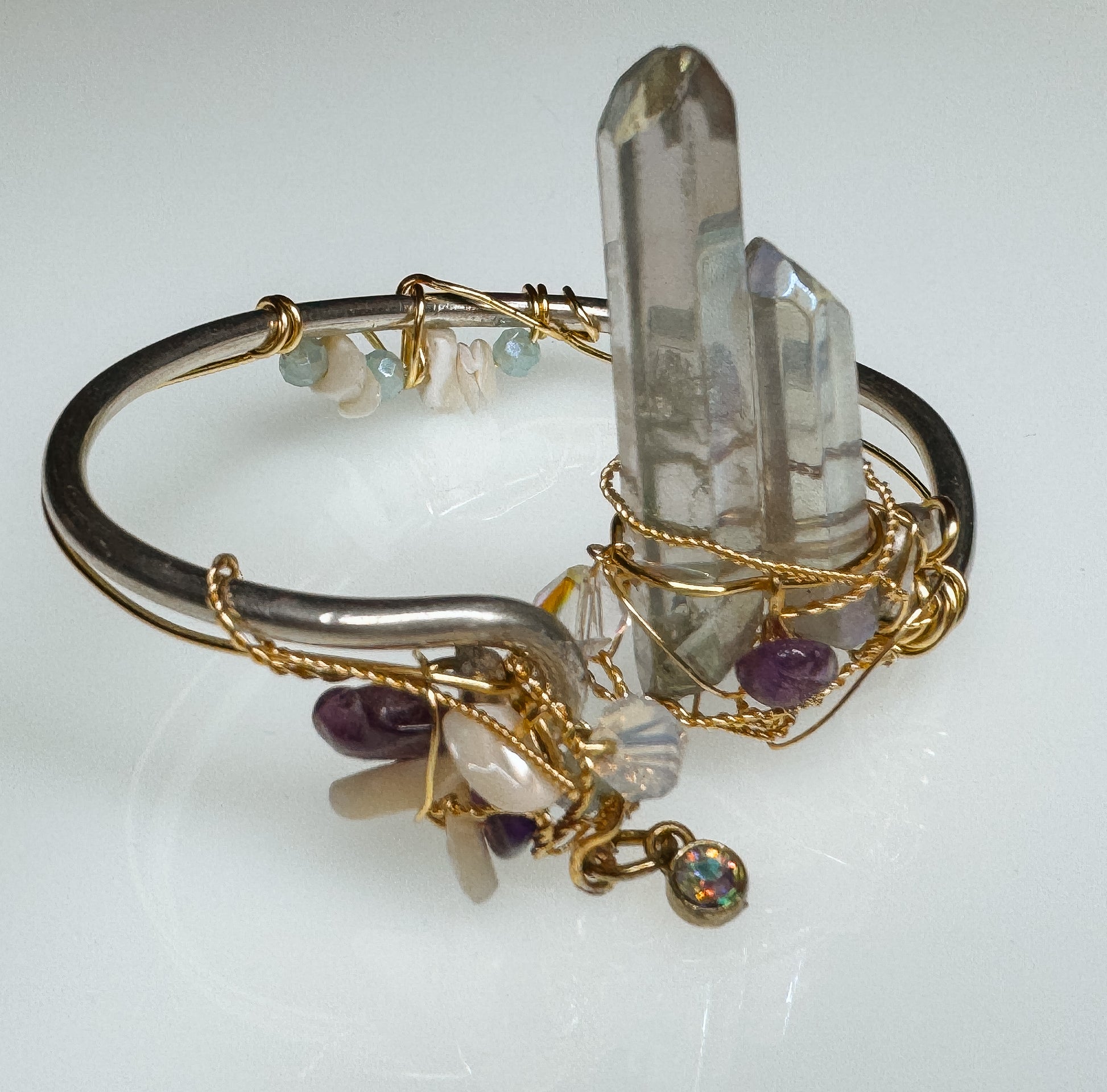 Explore the allure of our exquisite Argentinian silver bracelet, where elegance meets the ethereal. This hypoallergenic piece showcases the harmonious blend of Mother of Pearl, offering calming energy and emotional balance, and Larimar, known for its tranquil vibes, enhancing relaxation and communication. The hand-carved moonstone bead is celebrated for boosting intuition and emotional stability, while the radiated crystal amplifies energy, promoting clarity and spiritual growth. Crafted with precision, this bracelet is more than just an accessory; it's a statement of grace and spiritual harmony. Perfect for those who seek beauty with a deeper meaning.