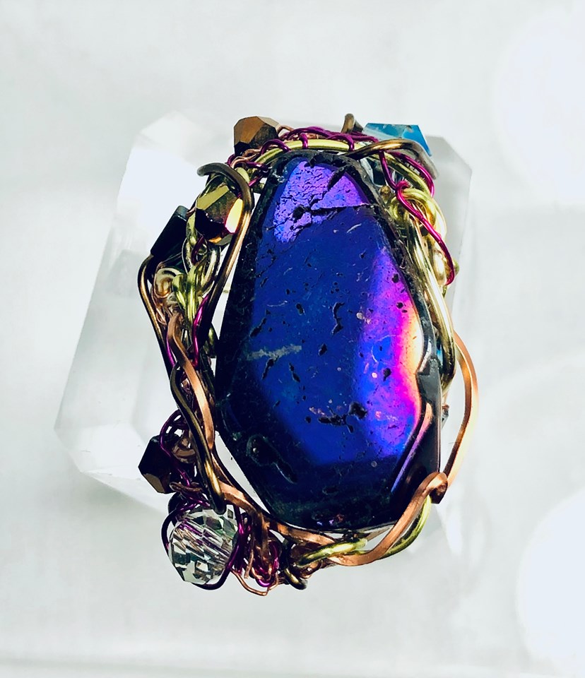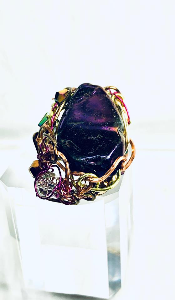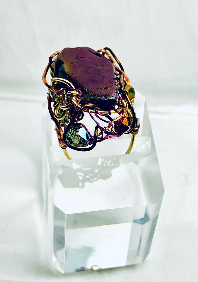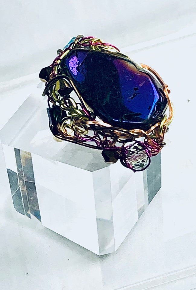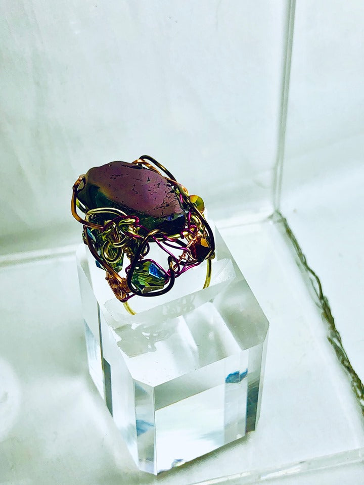 Enjoy the attention this ring demands, Iridescently shifting shades of purple, before your eyes. New Zealand Lucille, set in a one of a kind, fashioned by hand, filigree setting in gold and pink, embellished with crystals. Presenting "Avalon", from the Jewels of Inner Earth collection.  Will not tarnish, does not contain lead, copper or nickel.  Each item is a unique, hand-made creation, please allow for subtle differences that solidifies the distinctiveness of each piece.