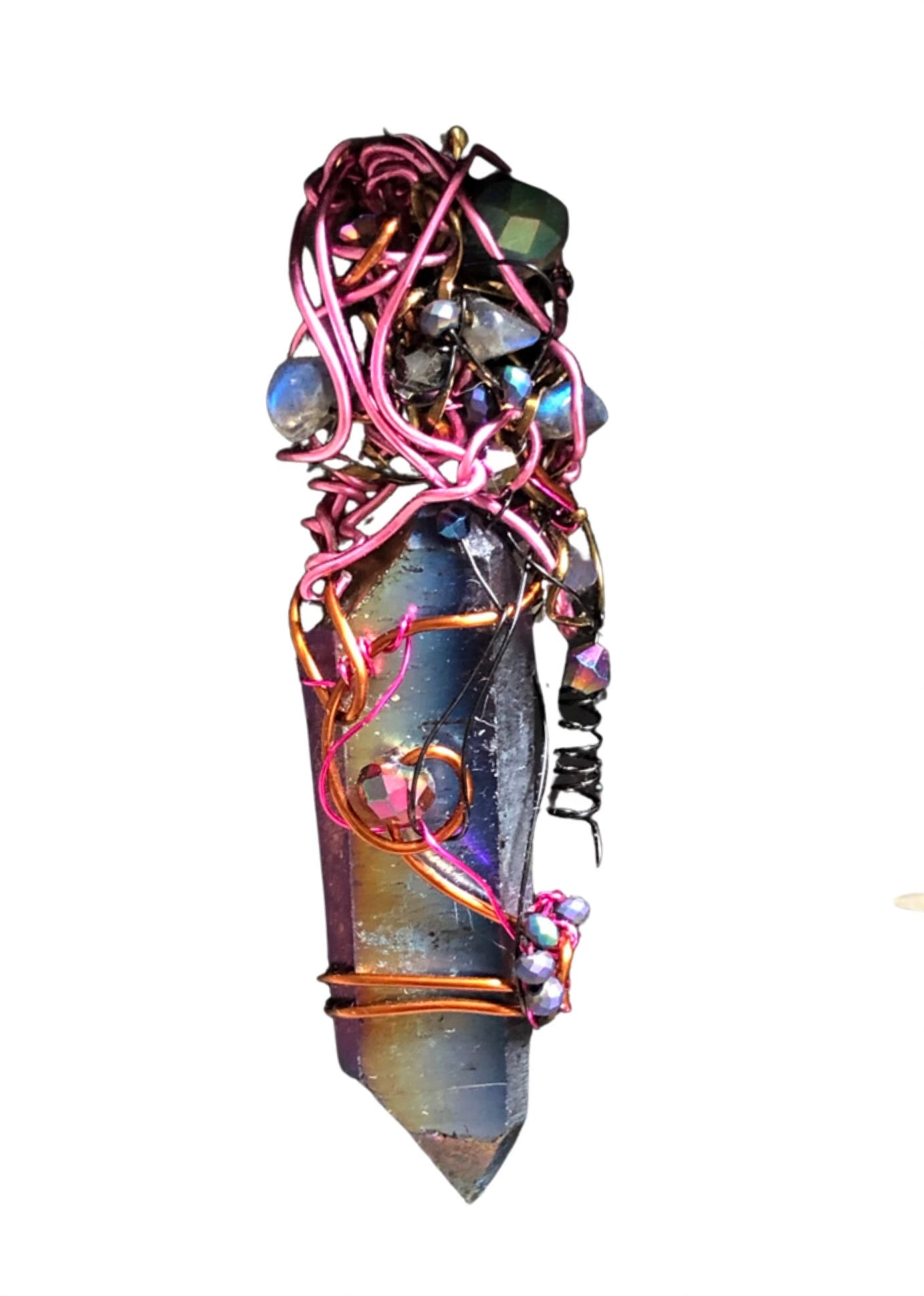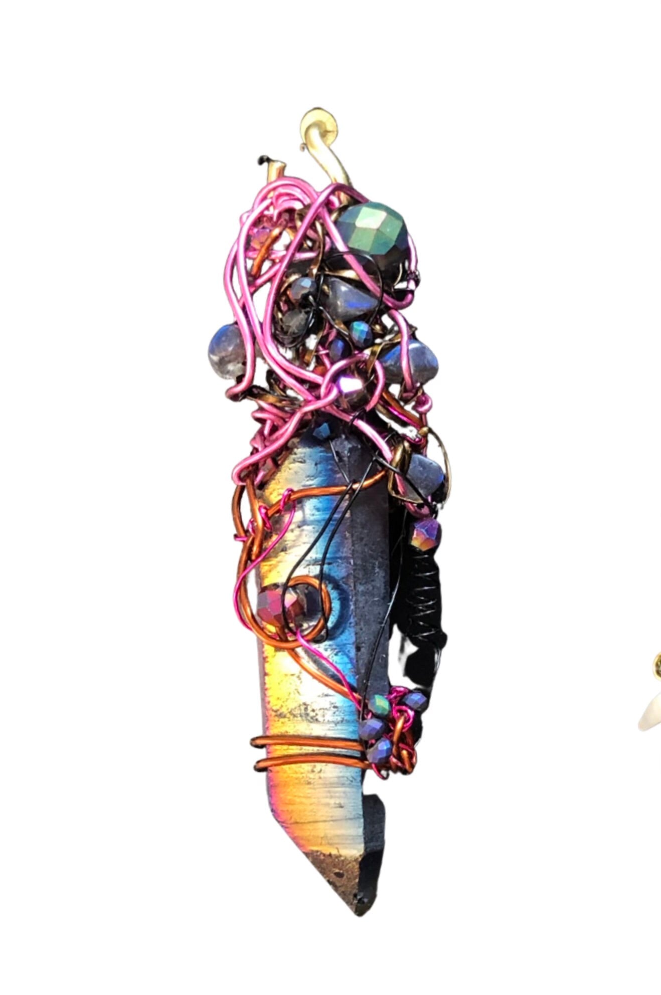 This bismuth pendant encased in pink and burnt orange abstracts. Which encircle labradorite bits of crystals and sand blasted peacock ore, accented in Avent garde black.