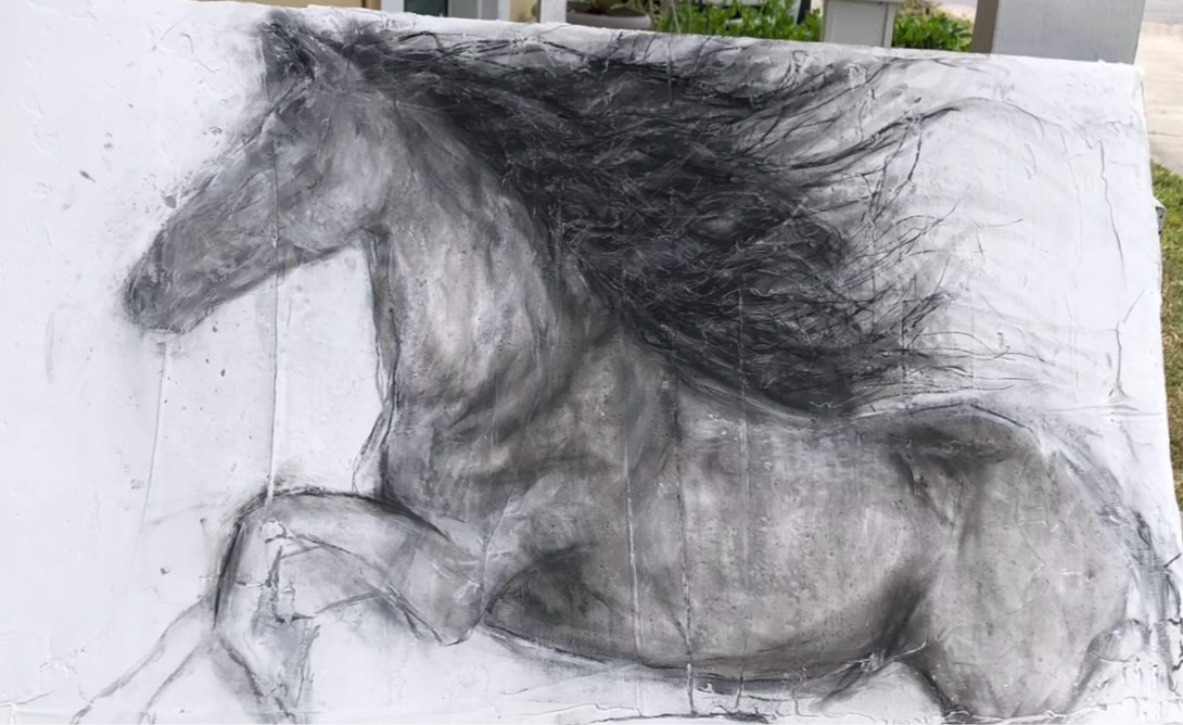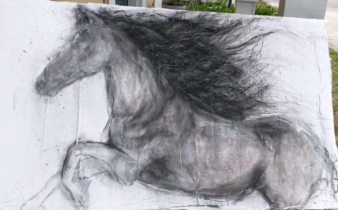 The fresco on wood titled "Black Caviar" is an evocative portrayal of the legendary Australian racehorse, masterfully rendered in charcoal. This monochromatic piece harnesses shades of black and gray to convey the dynamic essence of the unbeaten champion.