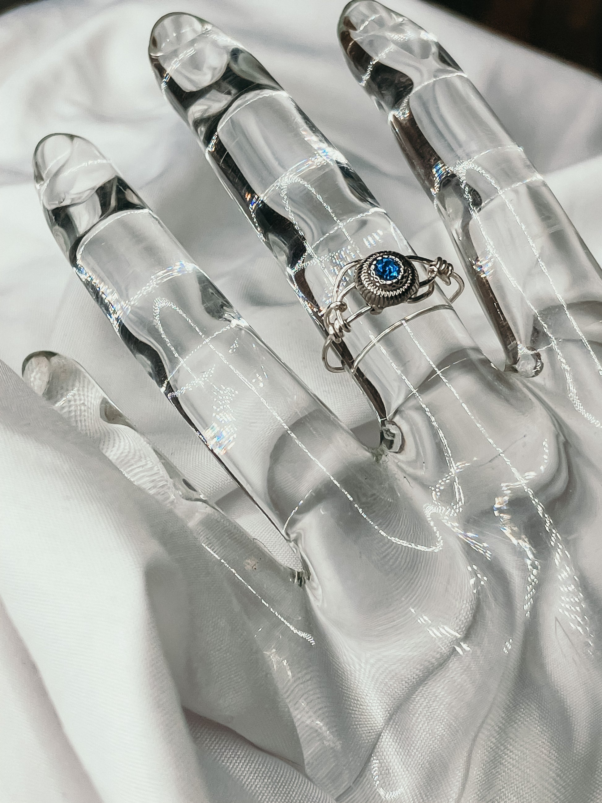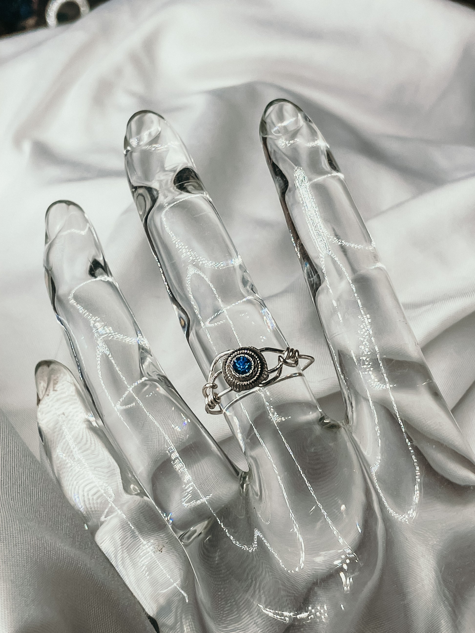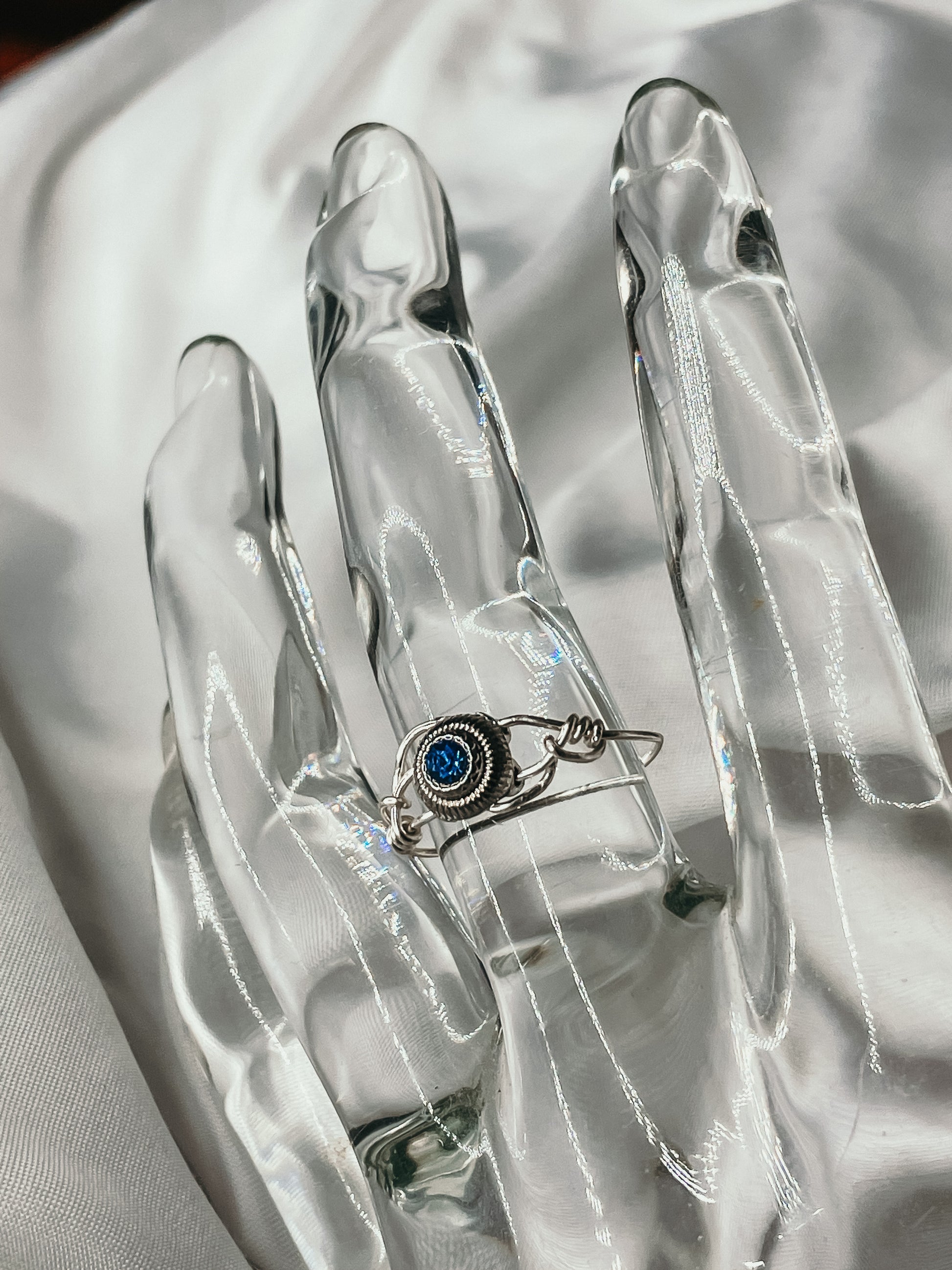 Crafted with hypoallergenic materials, this ring ensures a comfortable and irritation-free wearing experience for all. The delicate silver wire intricately weaves around the blue topaz rhinestone, enhancing its celestial beauty. Whether worn as a statement piece or a daily accessory, the "Celestial Serenity" ring radiates elegance and charm.