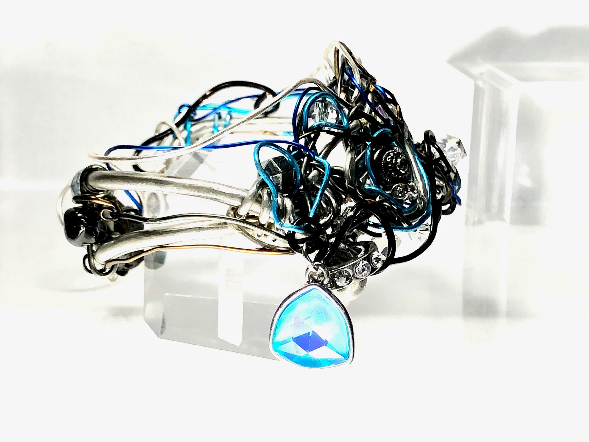 This stunning bracelet features intricate wire wrapping that is both delicate and bold. The centerpiece of the bracelet is a beautiful gemstone that is carefully nestled in the wirework. The bracelet is made of hypoallergenic artesian silver, making it the perfect accessory for those with sensitive skin.