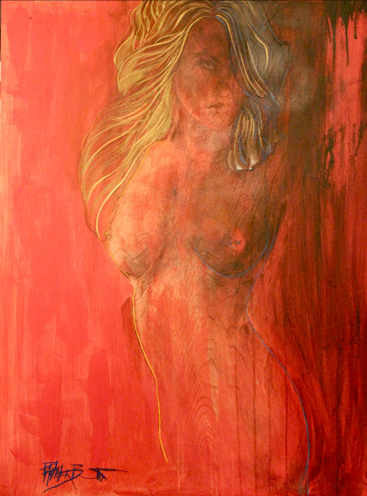 The composition is set against a bold red background, symbolizing intensity and passion—a fitting representation of the fiery courage that fuels Captain Marvel's mission. The artist skillfully employs charcoal to create depth and texture, allowing the figure to emerge dramatically from the wood canvas. The use of gold leaf metallics and gold highlights enhances the sense of heroism, giving the artwork an ethereal glow that captures the viewer's attention and reflects the character's superhuman powers.