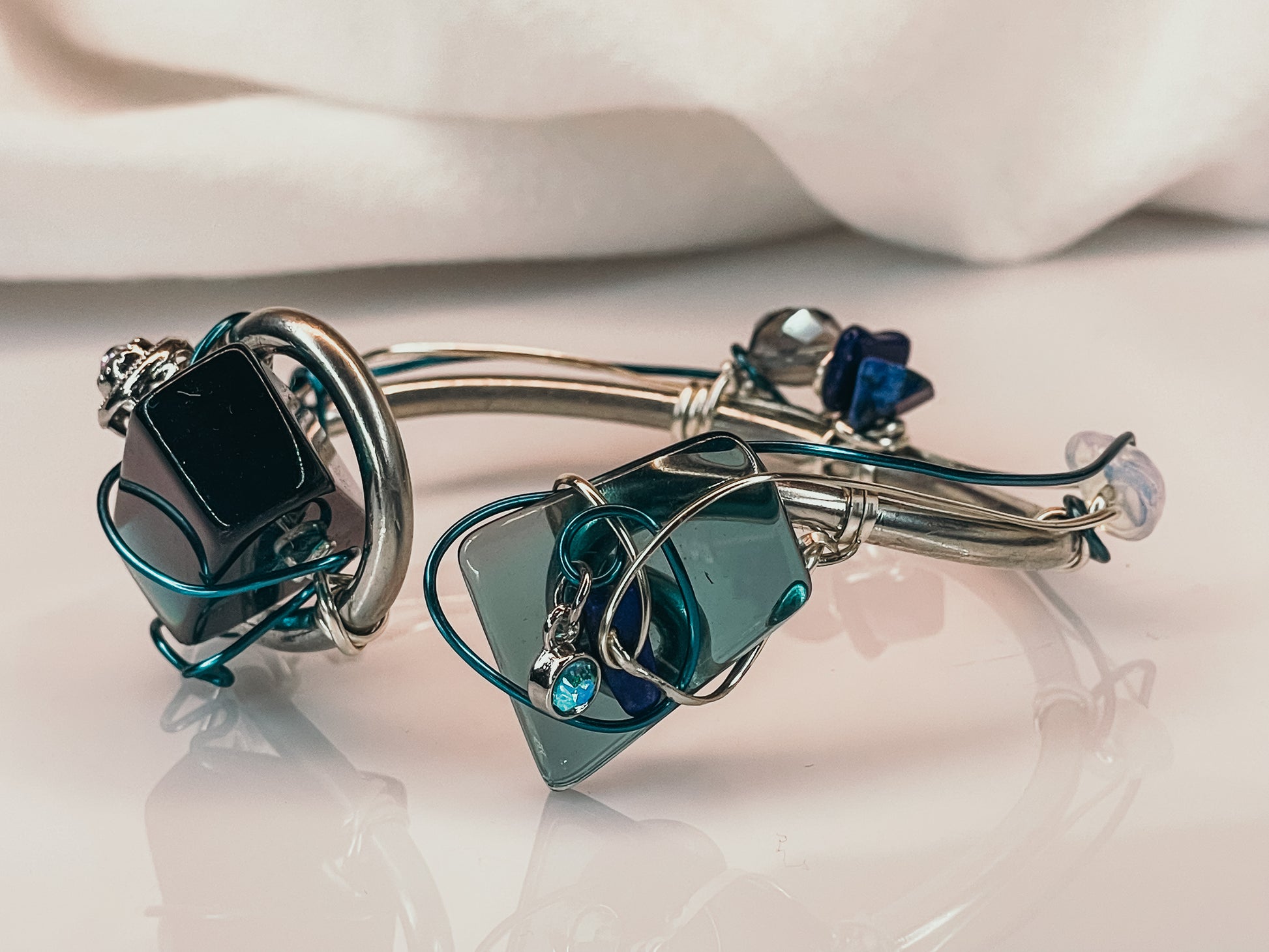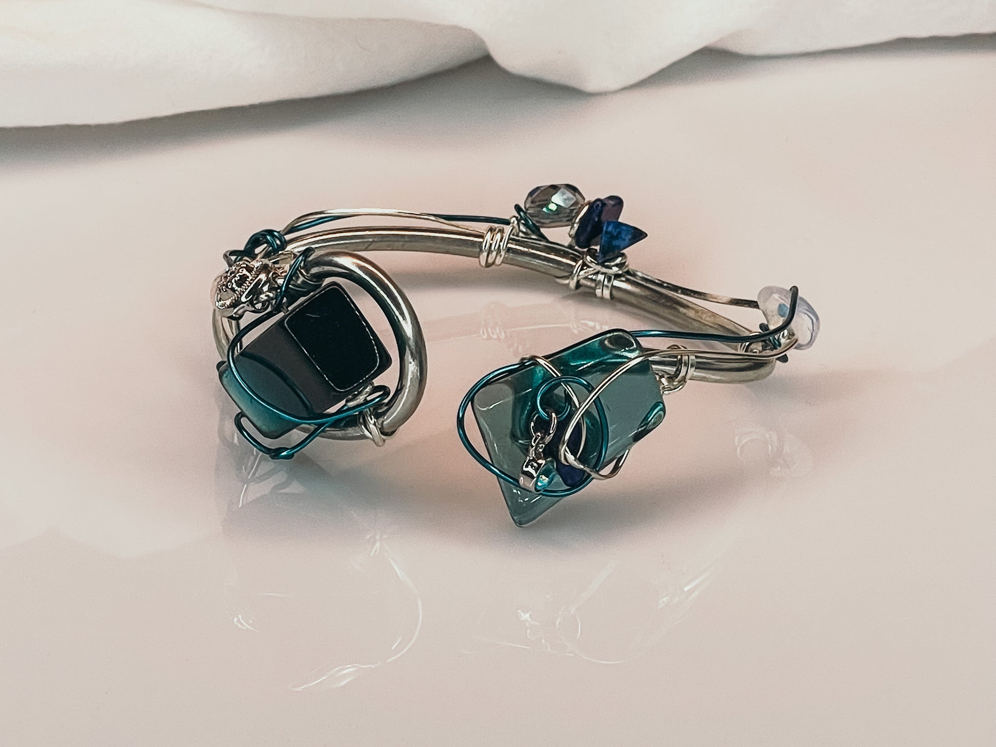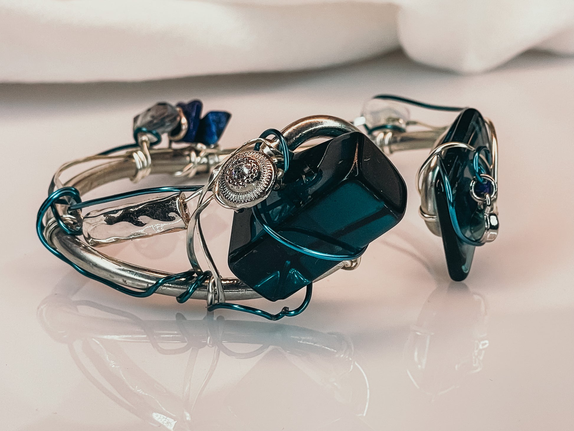 Introducing the resplendent "Celestial Charm" bracelet, a stunning piece of jewelry that exudes an unparalleled radiance. Adorned with the finest Lapis, Moonstone, and irradiated crystal, this bracelet is a true work of art that is sure to captivate the senses.