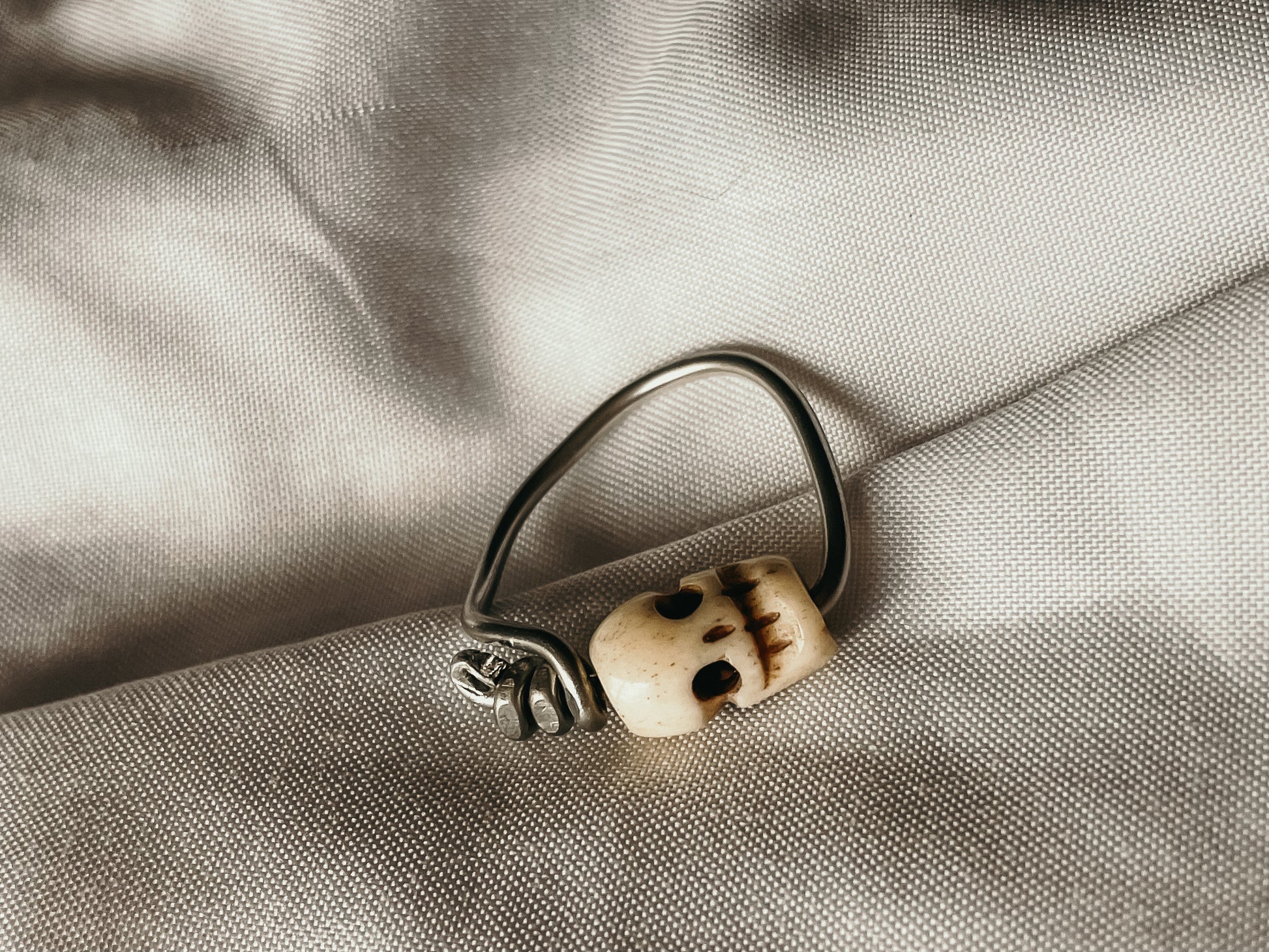 Introducing the captivating "Corsair's Legacy" ring, a remarkable treasure from "The Johnny Collection" that embodies the swashbuckling essence of pirates and the allure of hidden riches. This extraordinary ring showcases a mesmerizing ivory-colored skull bead delicately adorned on a single silver band, reminiscent of legendary pirate tales and untold fortunes.
