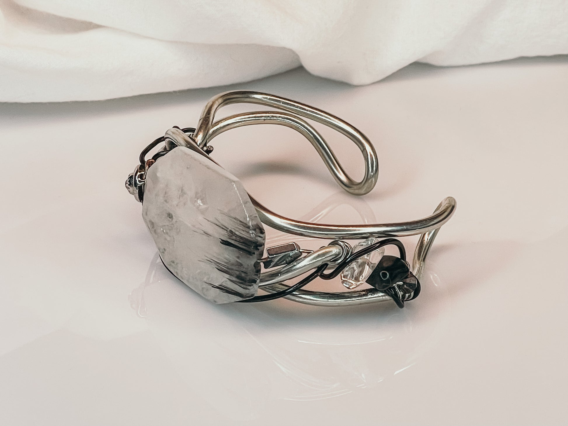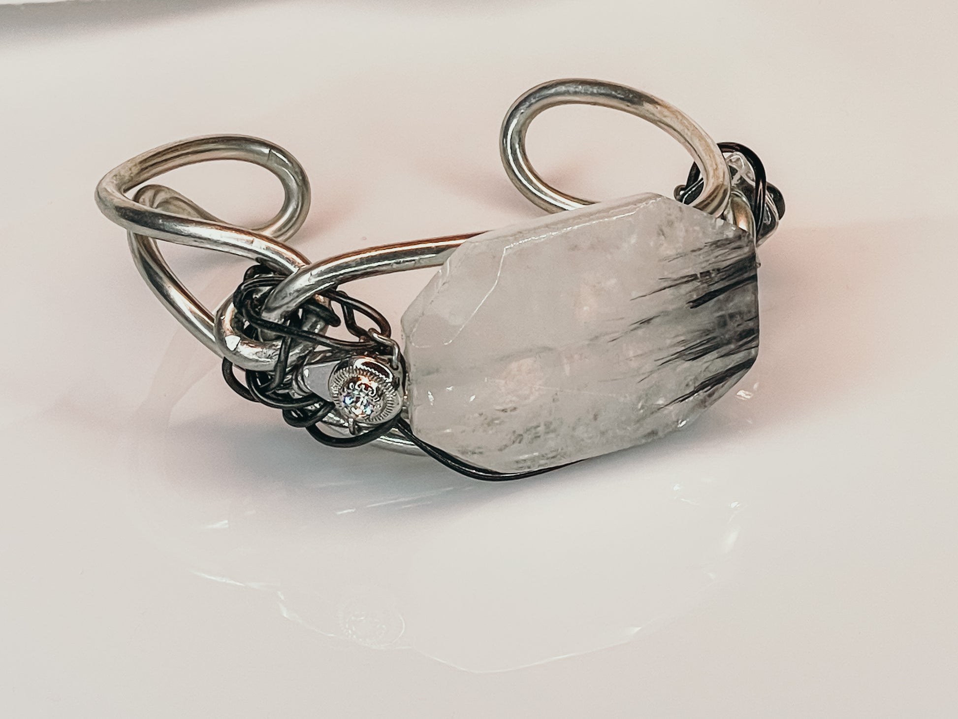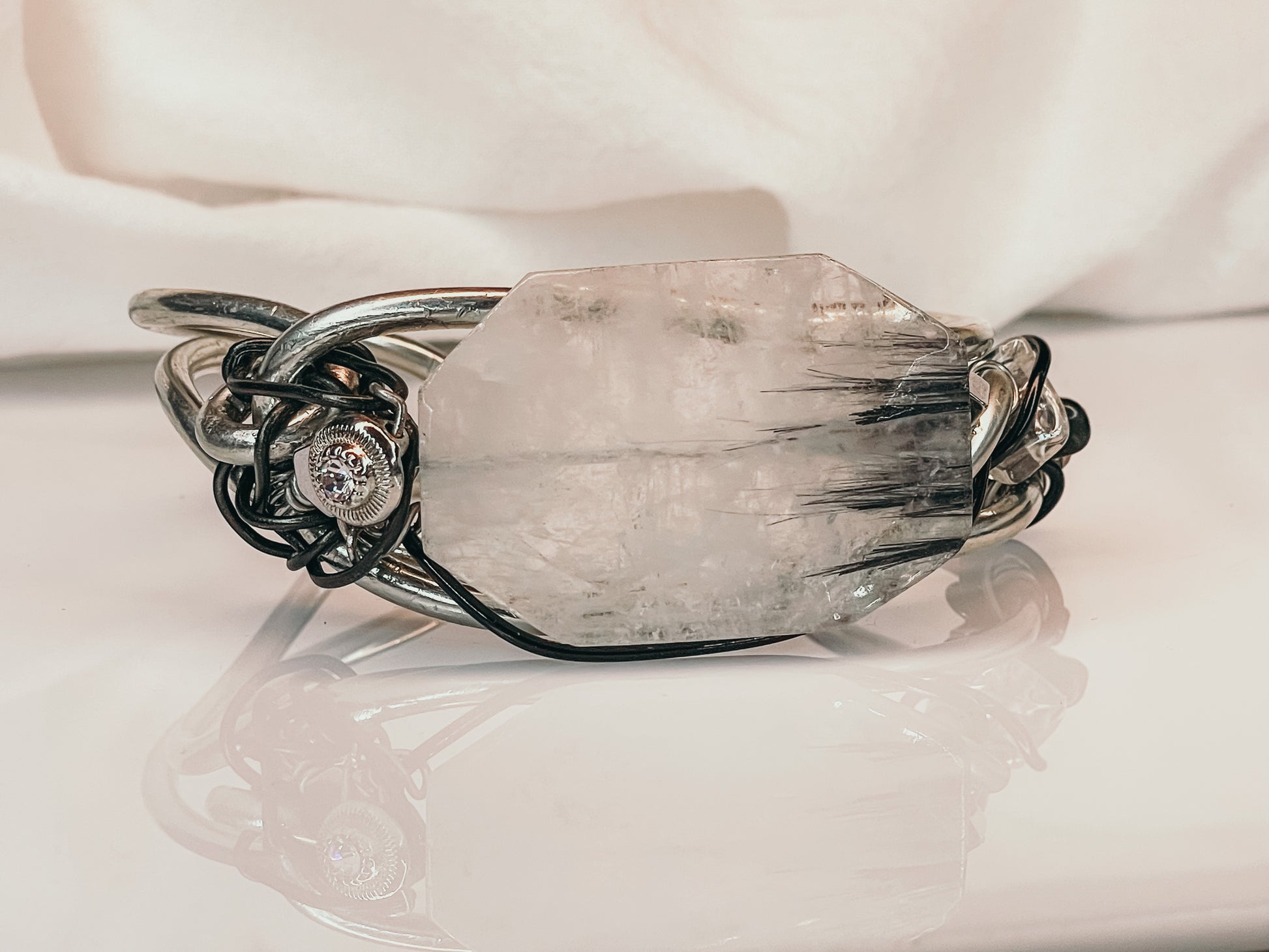 Introducing the "Cruella" bracelet, adorned with the finest needlenose quartz, this bracelet is a true masterpiece handcrafted by the Artist Panther. Inspired by the fierce and determined villainess from Disney. This bracelet is a true masterpiece that will leave you spellbound with its exquisite beauty.