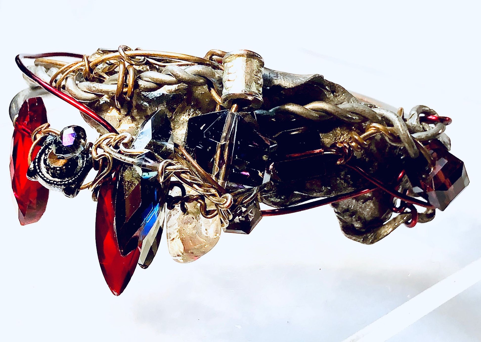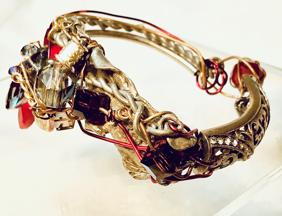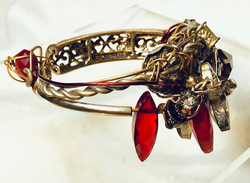 Embrace the red crystals of Dragon Blood, a piece that evokes power and virility, dripping with precious crystals of red, purple and green hues. Will not tarnish, does not contain lead, copper or nickel.  Each item is a unique, hand-made creation, please allow for subtle differences that solidifies the distinctiveness of each piece.