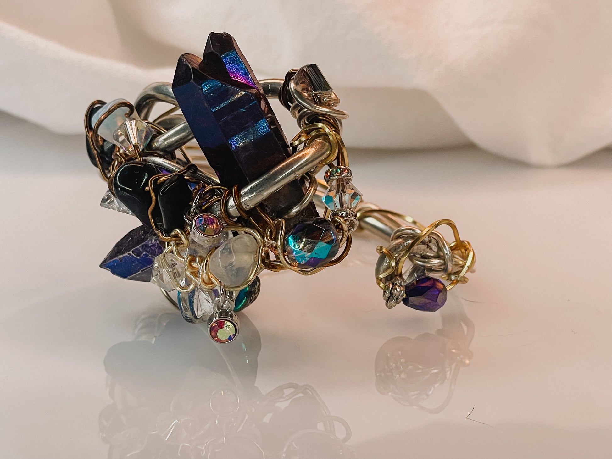 Introducing the Enchanted bracelet, featuring peacock ore, crystal, and moonstone. This stunning bracelet is believed to be the birthstone for those born in June and is associated with the zodiac sign of Gemini.