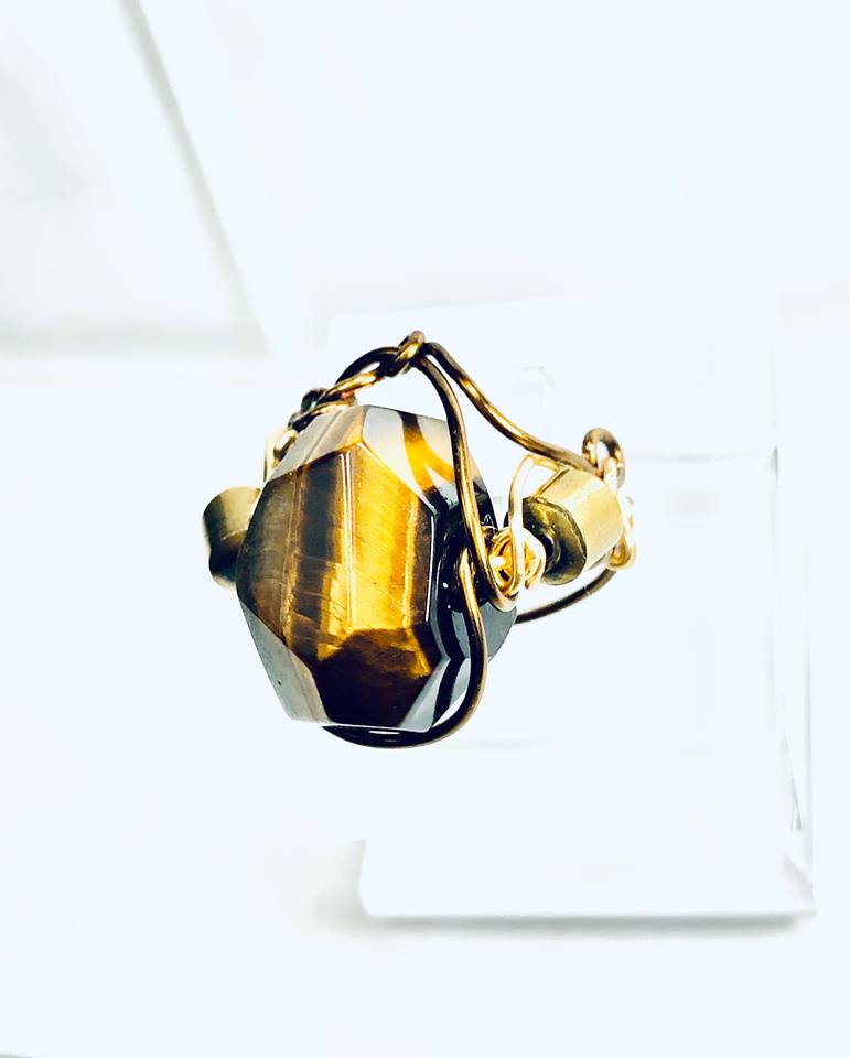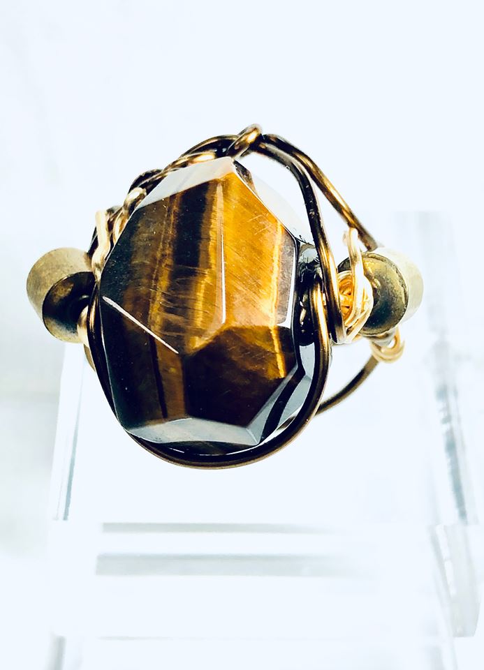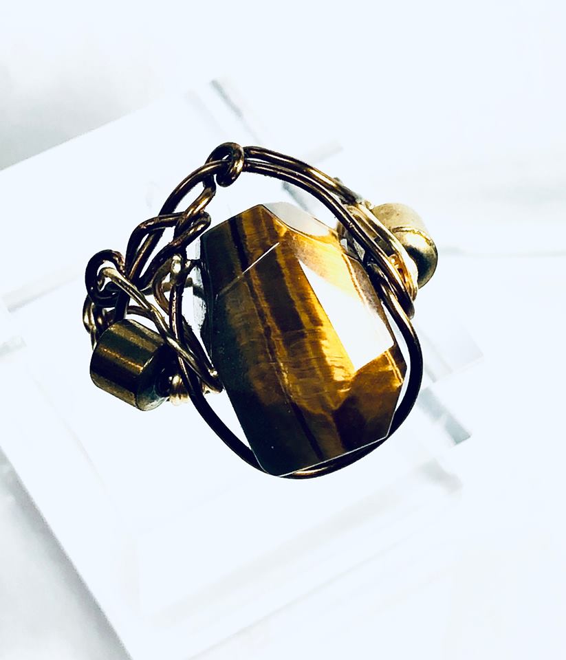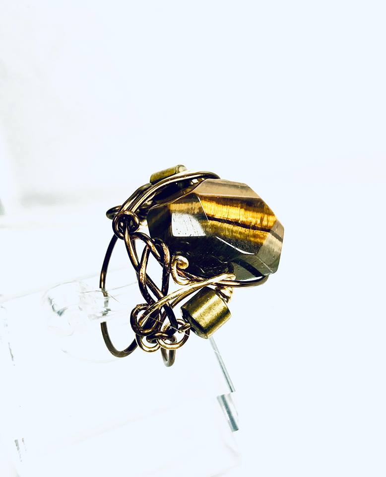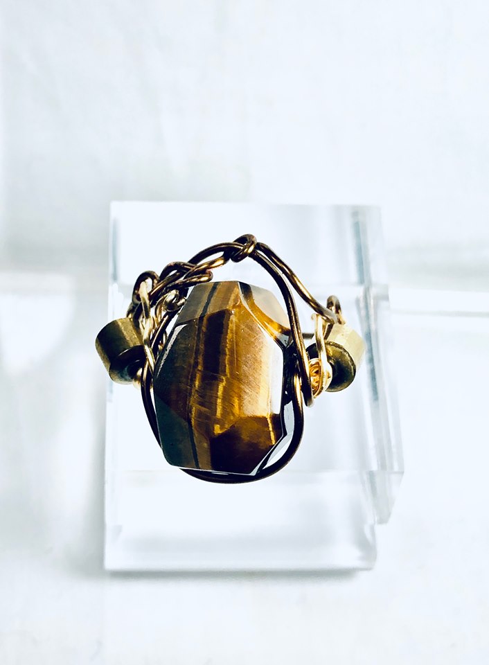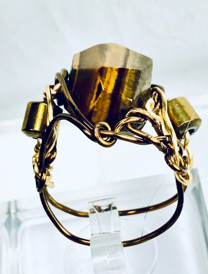 Jewels of the Jungle.  Help fight against procrastination with The Eye of the Tiger.  Oversized Tiger Eye nugget, in bronze and gold. Size 10 1/4, adjustable. Will not tarnish, does not contain lead, copper or nickel.  Each item is a unique, hand-made creation, please allow for subtle differences that solidifies the distinctiveness of each piece.