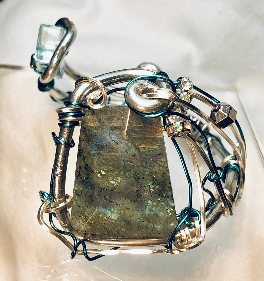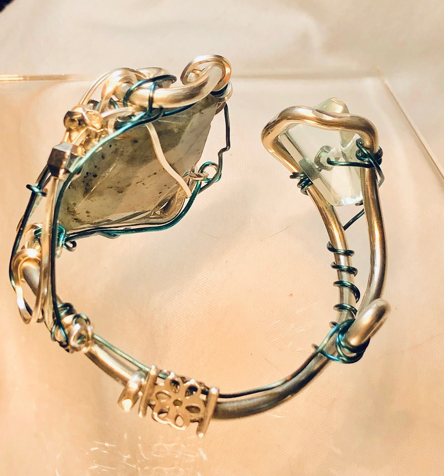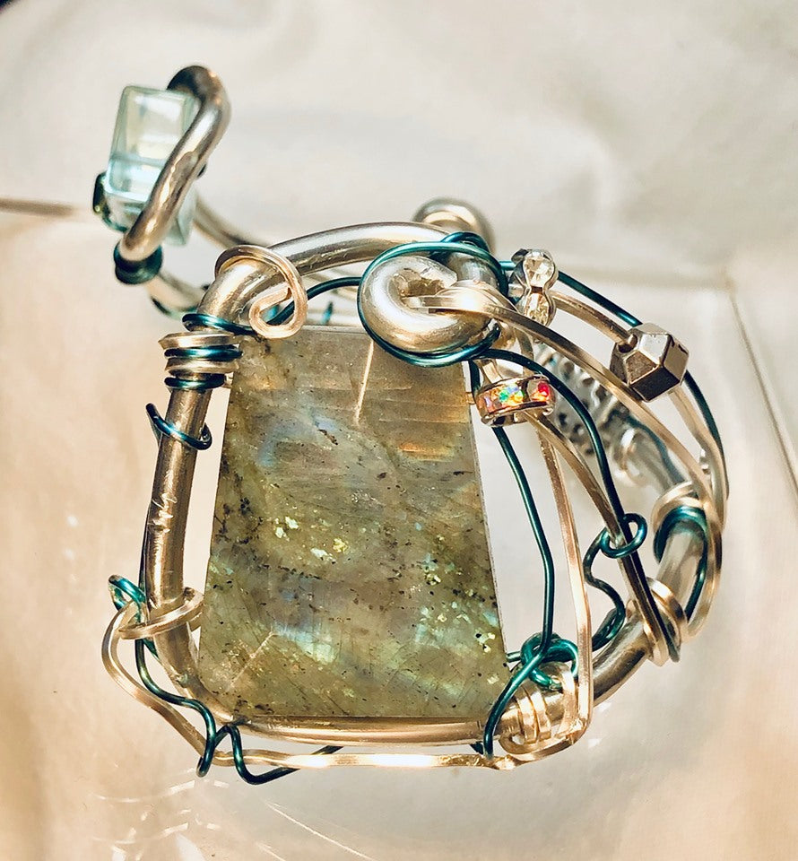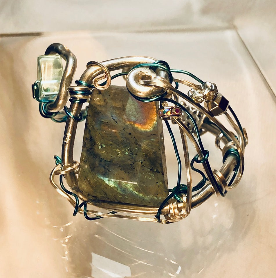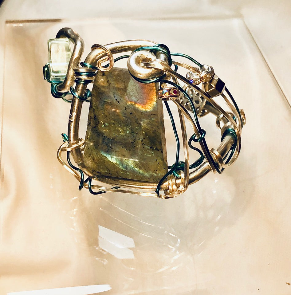 Fire Labradorite set in organized chaos, showering smoldering embers burning inside the stone, encircles the wrist with an irradiant polished crystal with the color of aquamarine, offering clarity of vision.