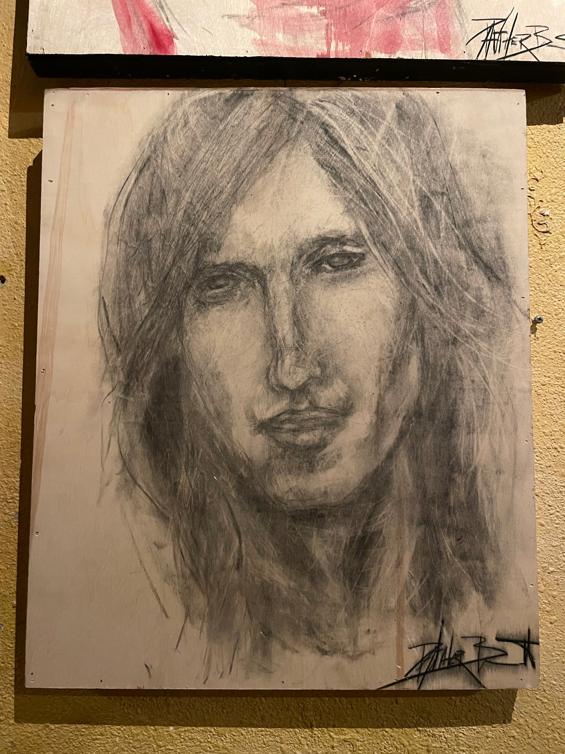 “Free Falling” is a captivating charcoal portrait that pays homage to the legendary musician Tom Petty, capturing the essence of his spirit and artistry. Rendered on wood, this piece evokes a sense of nostalgia and reverence, inviting viewers to reflect on the profound impact Petty had on the music world and the hearts of his fans.