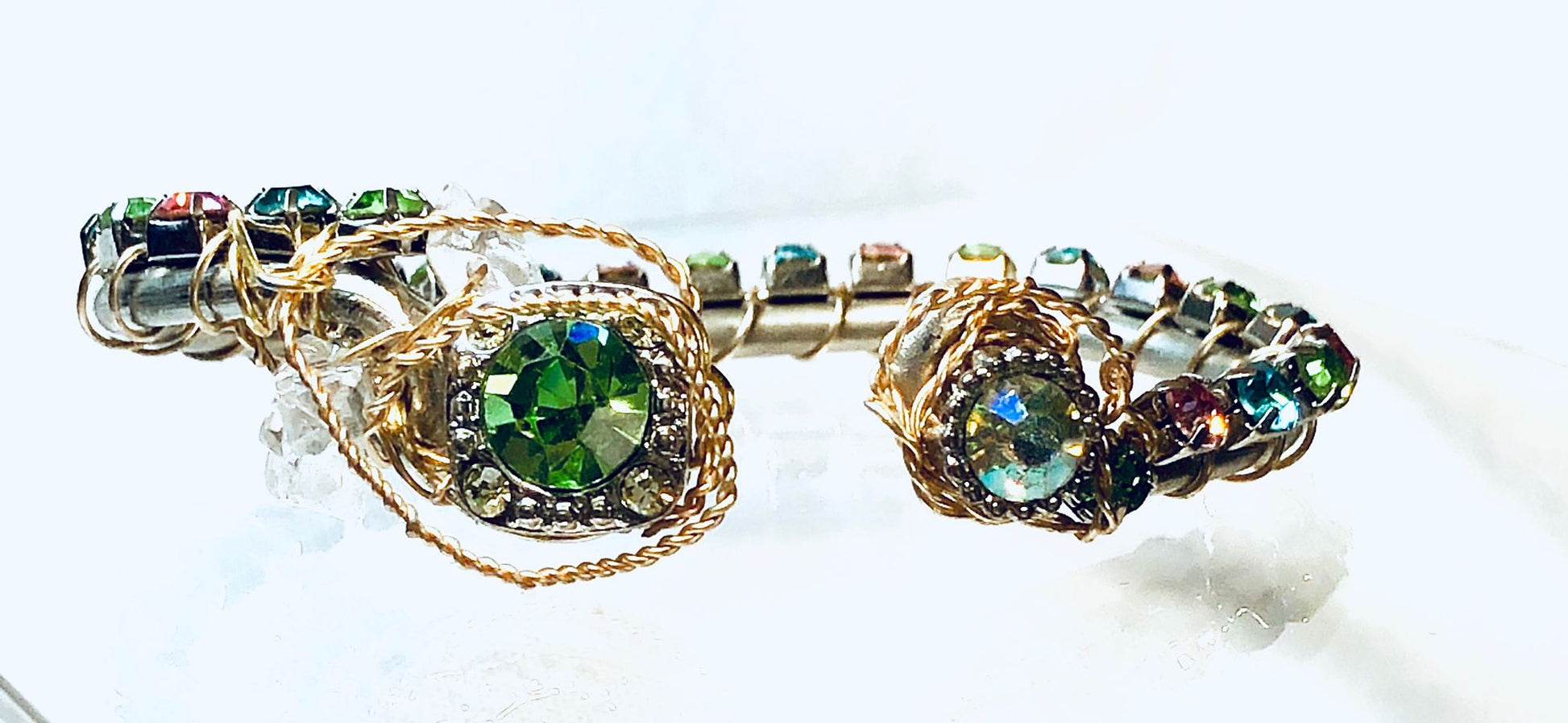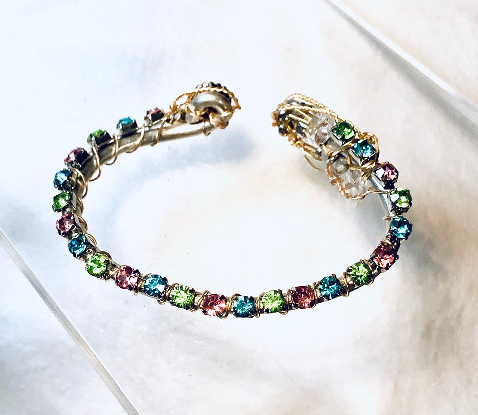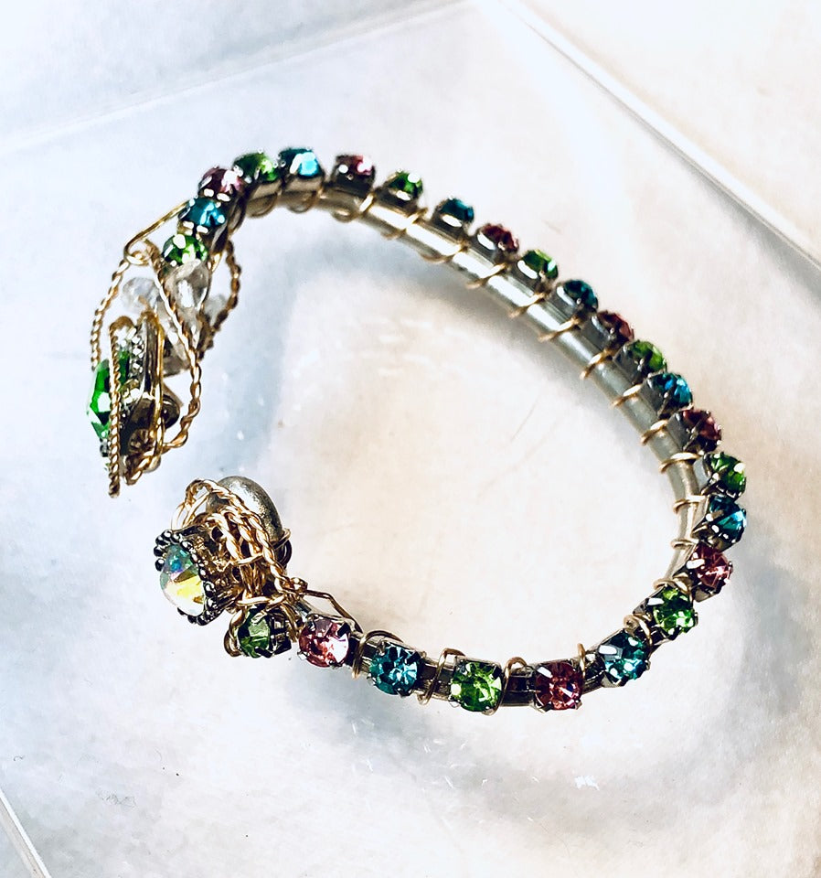 Feel the thrill of magic, of the Frog Princess Piece from The Jewels Of Disney collection. As the pastel multi-color rhinestones daintily decorate one's wrist, showcasing focal settings in pastel green and opalescence, makes one dream that fairytales do come true! Will not tarnish, does not contain lead, copper or nickel. Each item is a unique, hand-made creation, please allow for subtle differences that solidifies the distinctiveness of each piece.