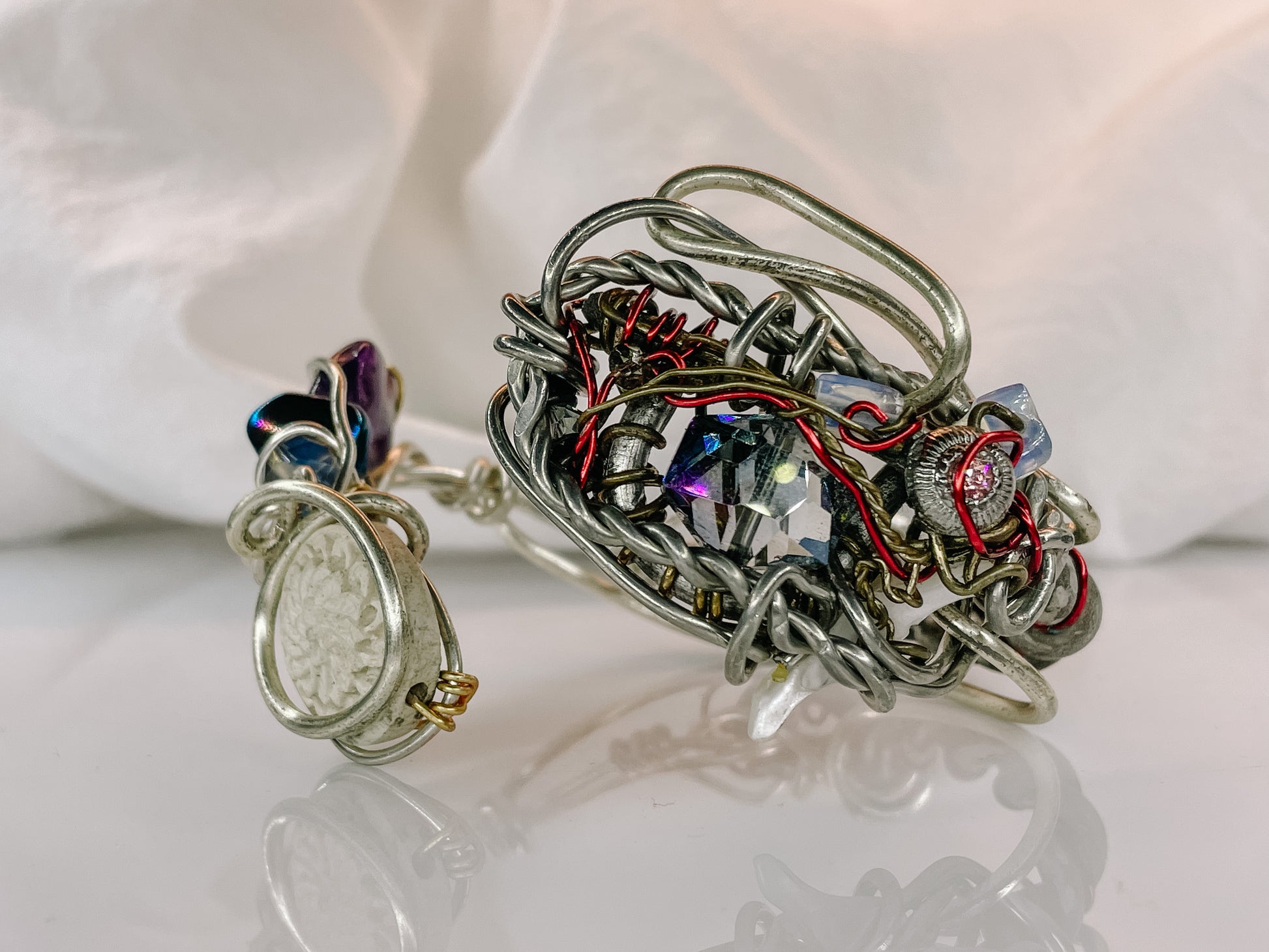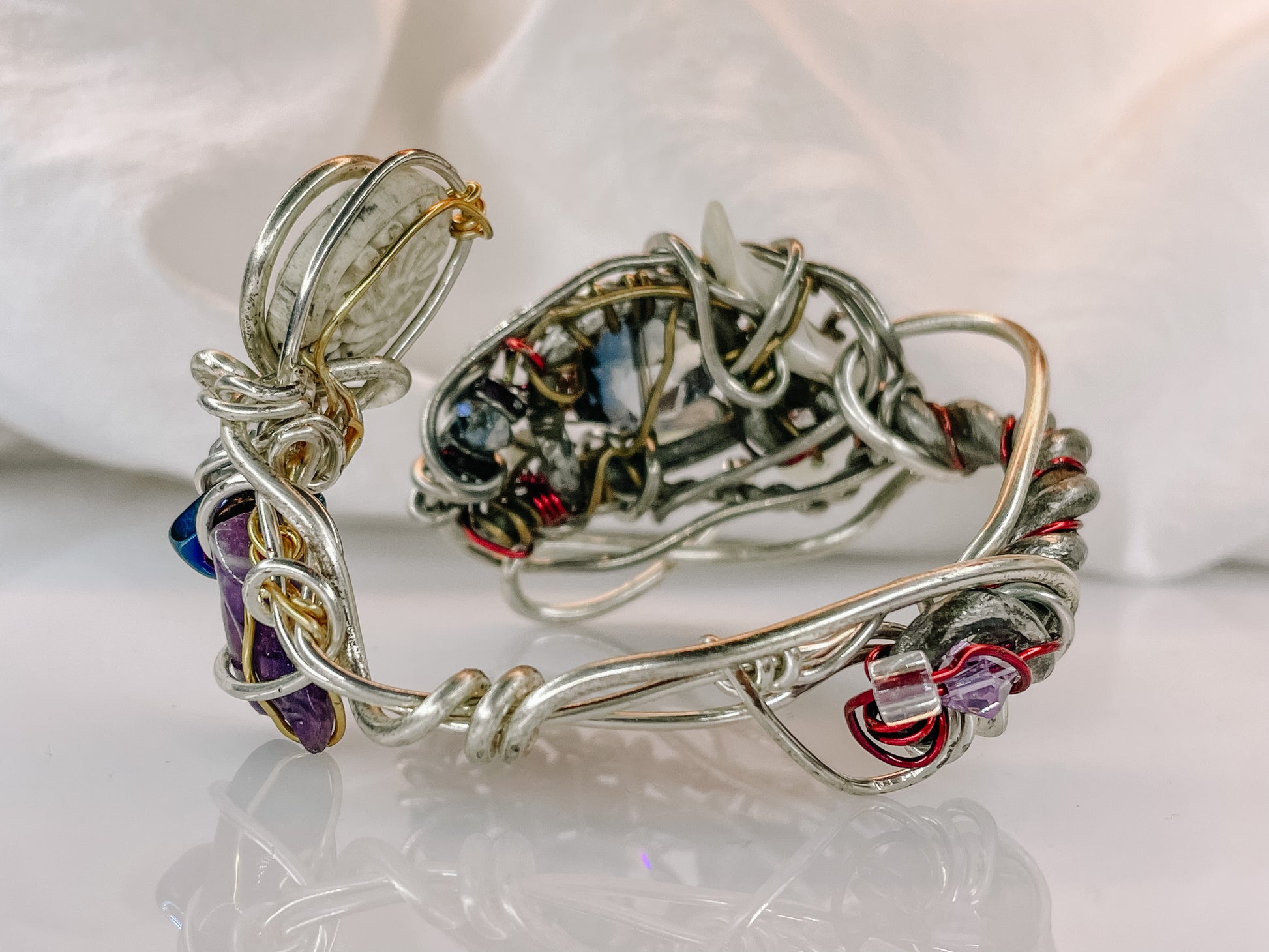 This stunning vintage hand-carved floral stone bracelet boasts a combination of hematite, mother of pearl, moonstone, and amethyst, all set in hypoallergenic artesian silver. The amethyst, a birthstone for February, is believed to promote a sense of calmness and tranquility, while the moonstone, a birthstone for June, is said to enhance intuition and emotional balance. Hematite is known for its grounding and protective properties, while mother of pearl represents purity and innocence. The intricate floral carving adds a touch of elegance to this already gorgeous piece. The combination of these healing stones and the unique design make this bracelet a must-have for any zodiac sign, especially those born under the signs of Aquarius, Pisces, Gemini, Cancer, and Libra.