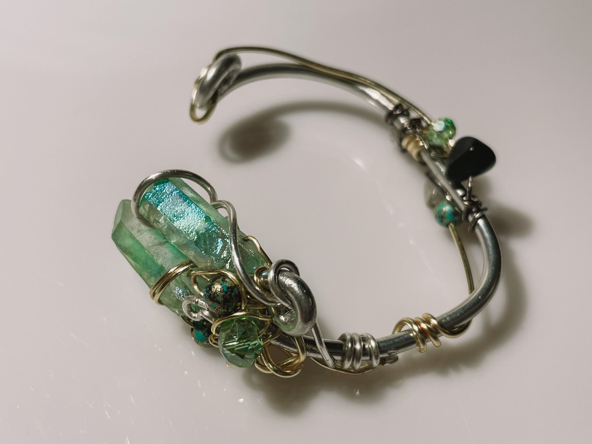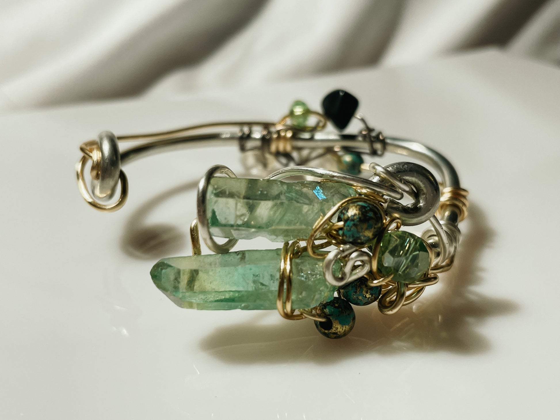 The Green Dream Bracelet is a stunning piece of jewelry that is designed for those who seek growth, abundance, and prosperity in their lives. This bracelet is made with irradiated green crystals, black onyx, and turquoise, which are known for their healing properties and ability to bring new beginnings. The hypoallergenic artesian silver setting adds a touch of elegance to this beautiful bracelet, making it the perfect accessory for any occasion.