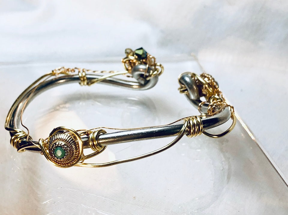 Delicate wrist circulate from the Aladdin Collection, silver bracelet showcasing light green rhinestones. Will not tarnish, does not contain lead, copper or nickel. Each item is a unique, hand-made creation, please allow for subtle differences that solidifies the distinctiveness of each piece.