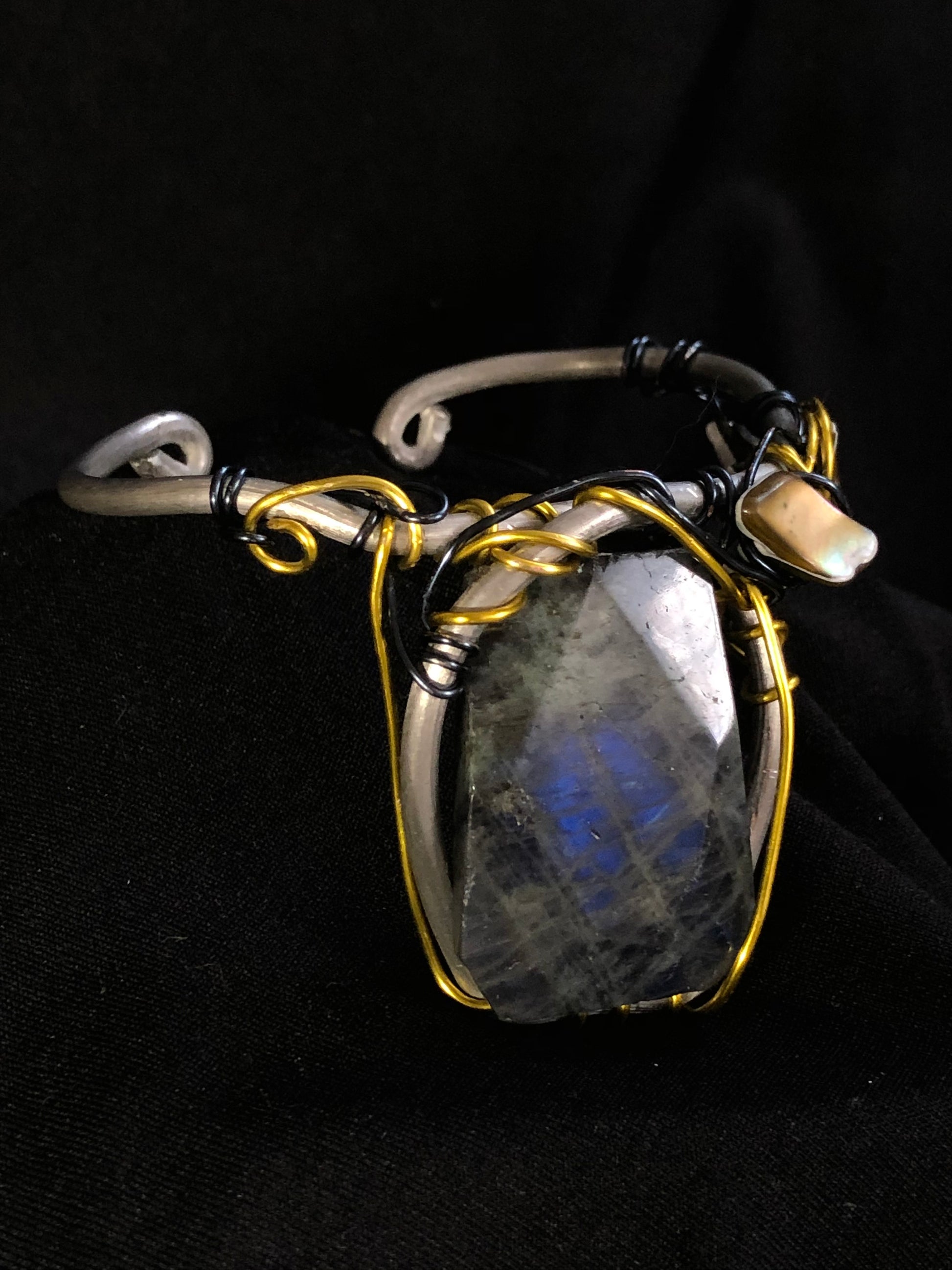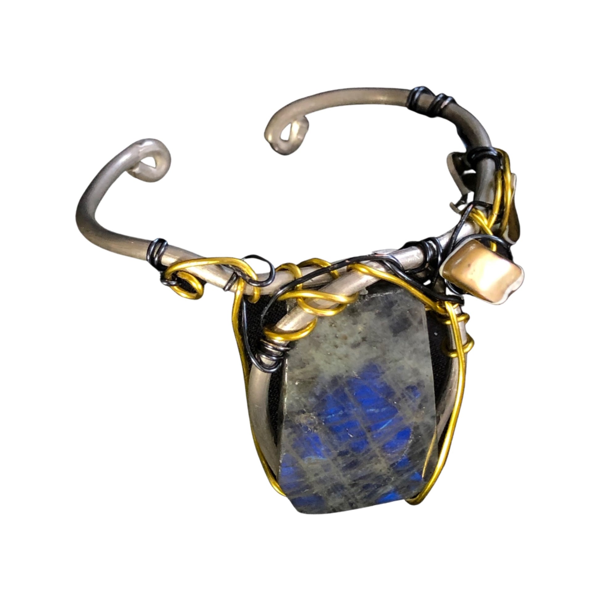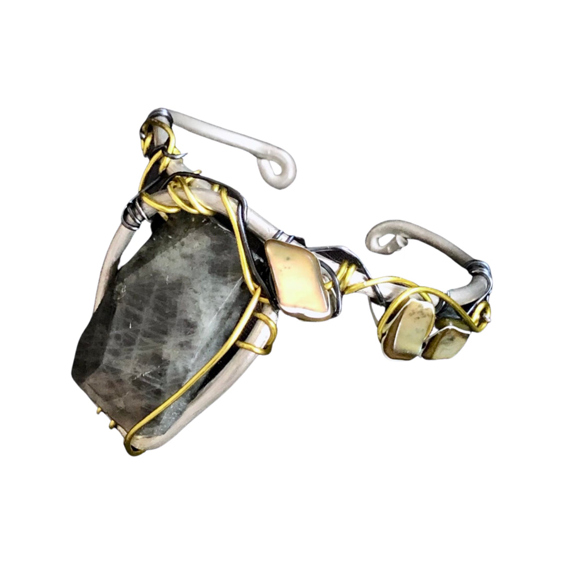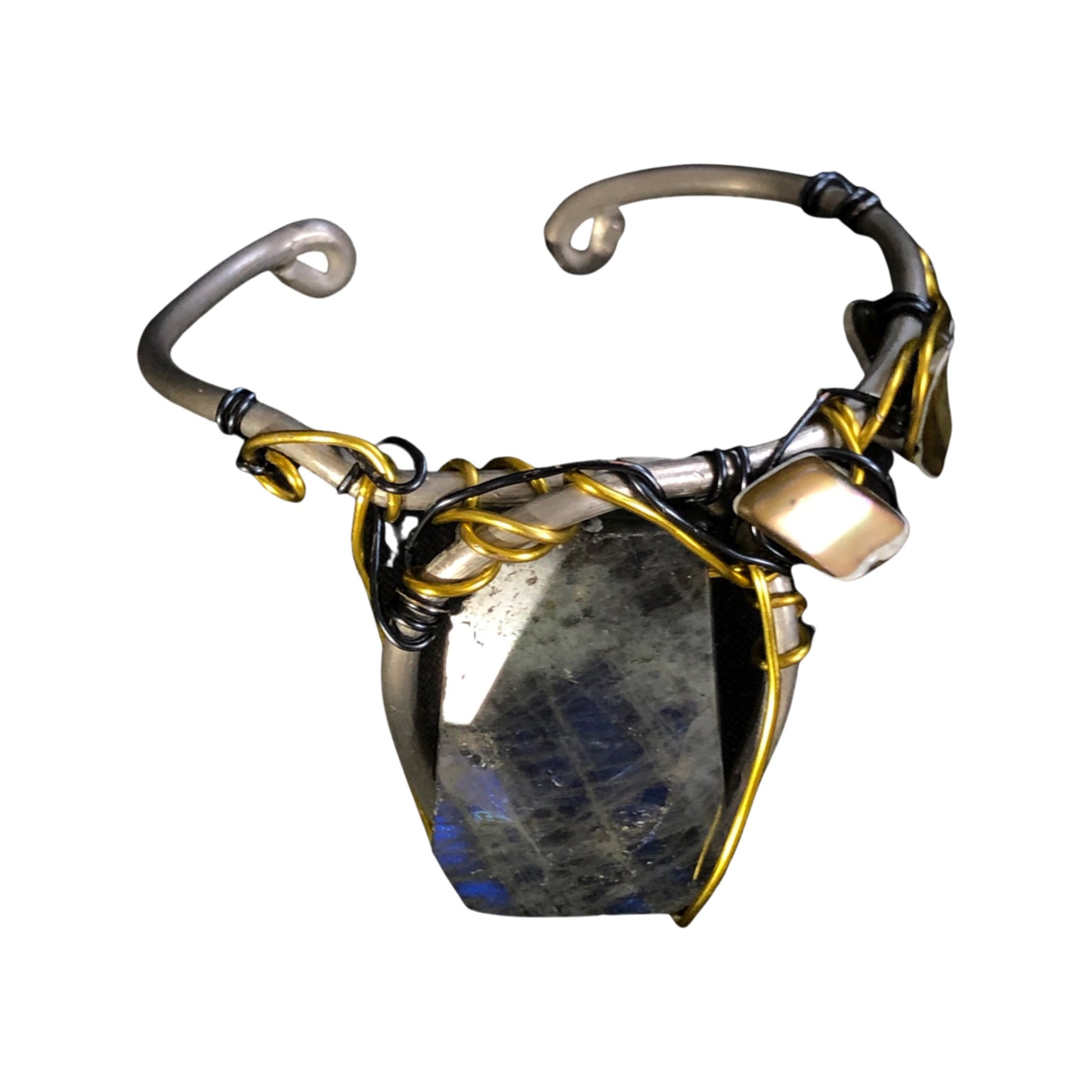 Introducing "Mystic Aura" - a captivating bracelet that showcases the enchanting beauty of a large labradorite stone. This exquisite piece is a testament to the mesmerizing allure of nature, with its iridescent flashes of color that dance and shimmer with every movement.