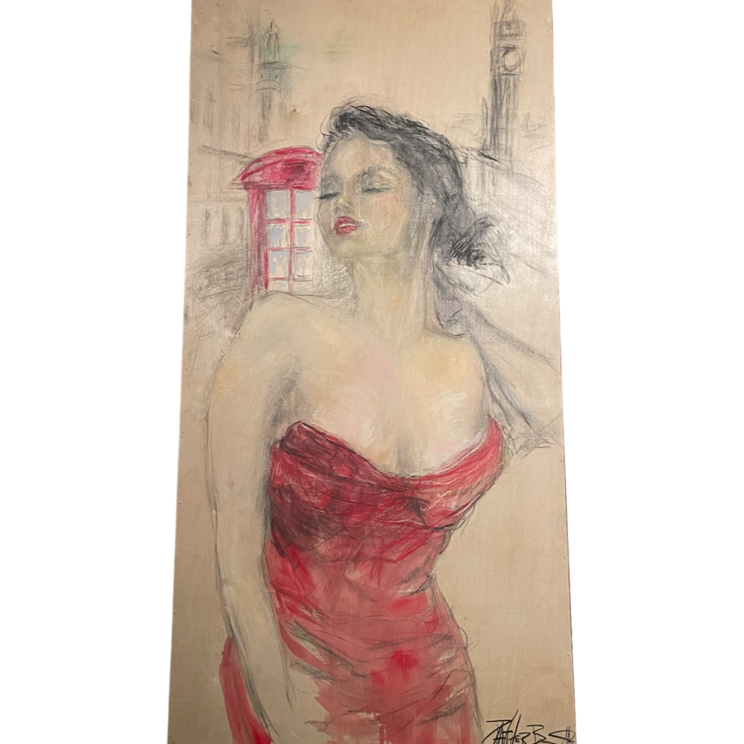 In the heart of London, there stood a breathtaking brunette beauty. Her figure, a tantalizing dance of curves, was accentuated by the vibrant red dress that clung to her every contour. Panther Brunotte, the master artist, sought to capture this enchanting essence in his work of art titled "London Beauty."