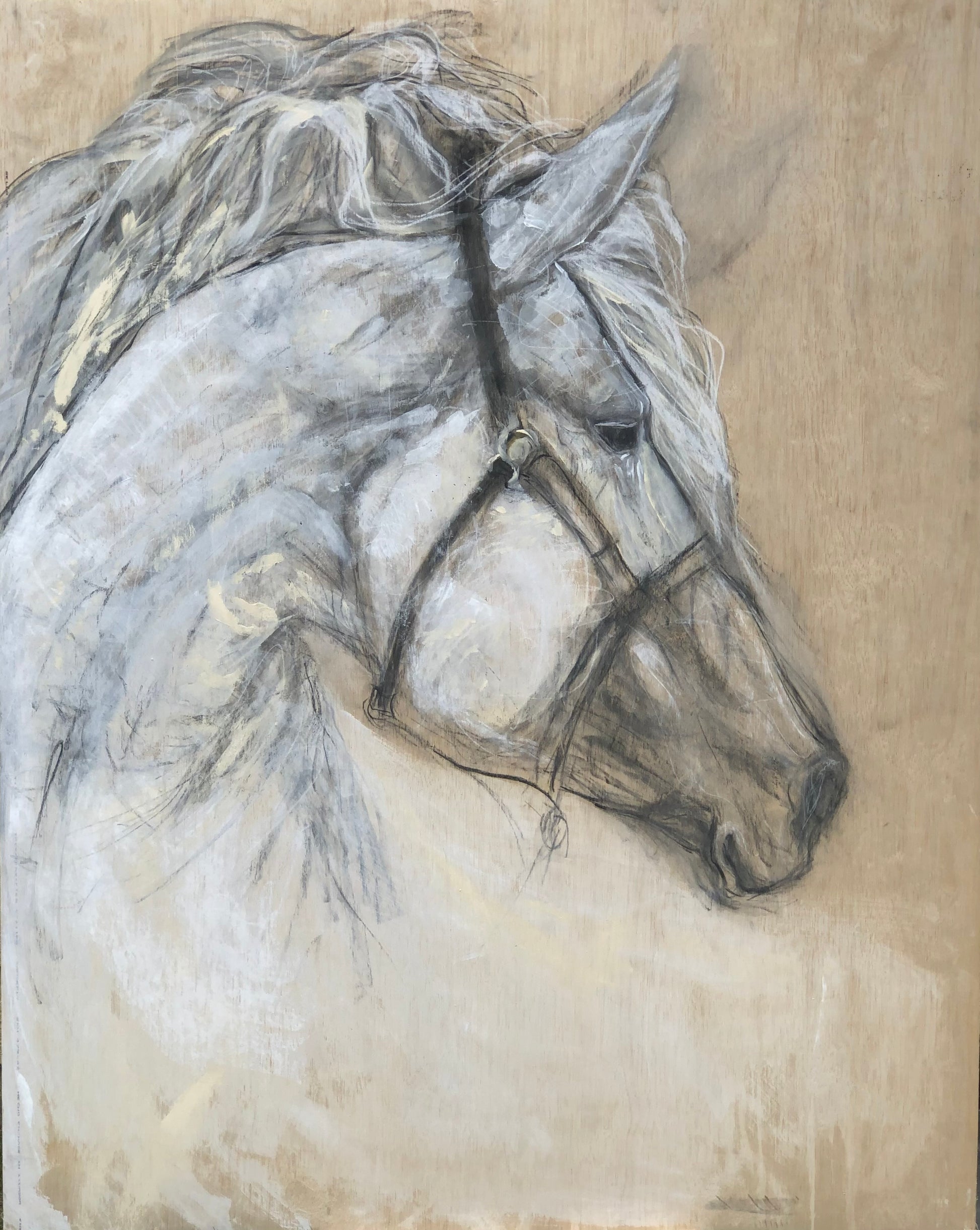 In this artwork, the artist employs charcoal, pastels, and chalk to create a dynamic interplay of light and shadow. The textures of the wood grain serve as a natural canvas, enhancing the organic connection between the horse and its surroundings. The subtle variations in color reflect the depth of Jane’s character, portraying her as a steadfast companion and an embodiment of loyalty. The nonjudgmental gaze of Jane invites viewers to find solace and understanding in her presence, reminding us of the unconditional love that animals can provide.