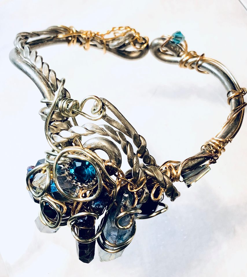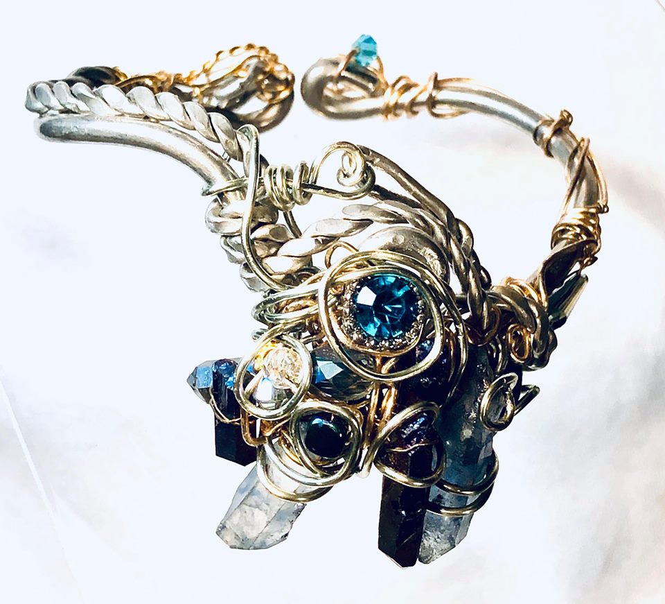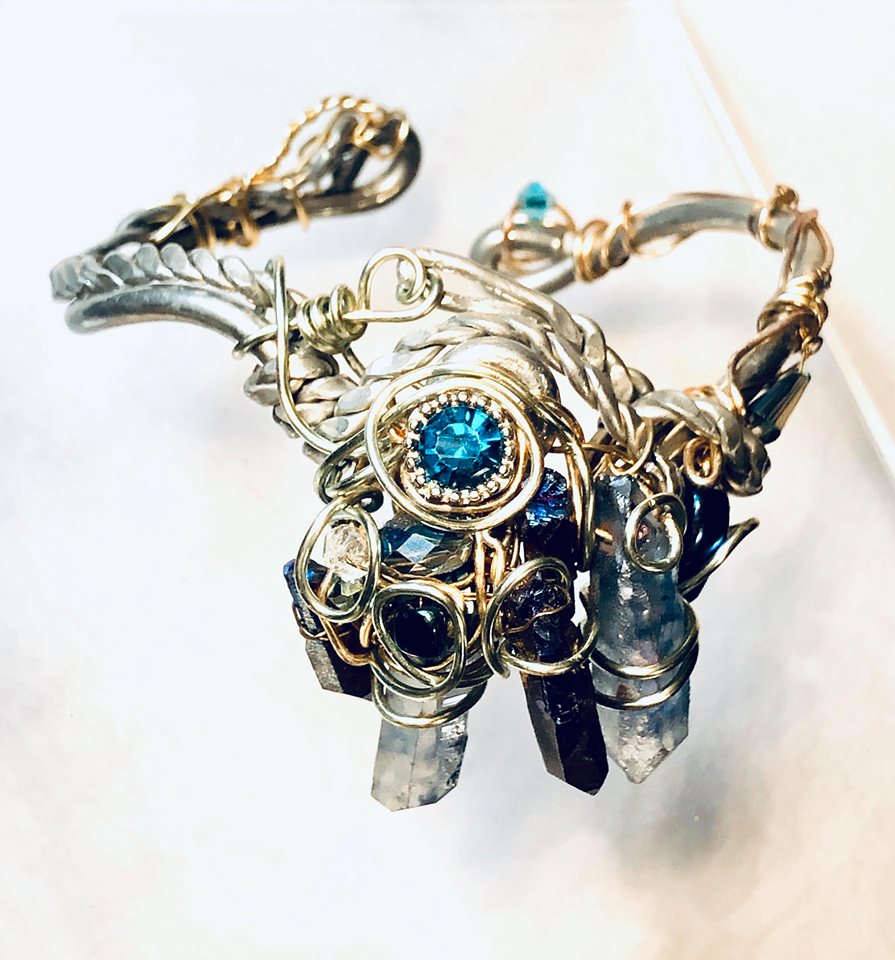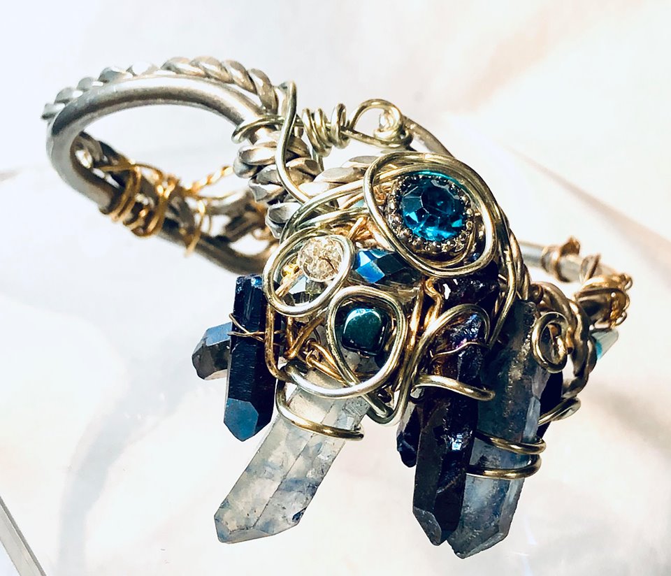 All of her beautiful magical power can be seen entwined in purple and silver braiding woven around slender cut gems of crystals irradiated to the perfect hues of iridescent periwinkle and blue, shards of peacock and Lucille, come to the center of a rhinestone of a mesmerizing turquoise hue. This piece is designed to be worn dropped down low on the top of ones hand. Will not tarnish, does not contain lead, copper or nickel. Each item is a unique, hand-made creation, please allow for subtle differences that solidifies the distinctiveness of each piece.