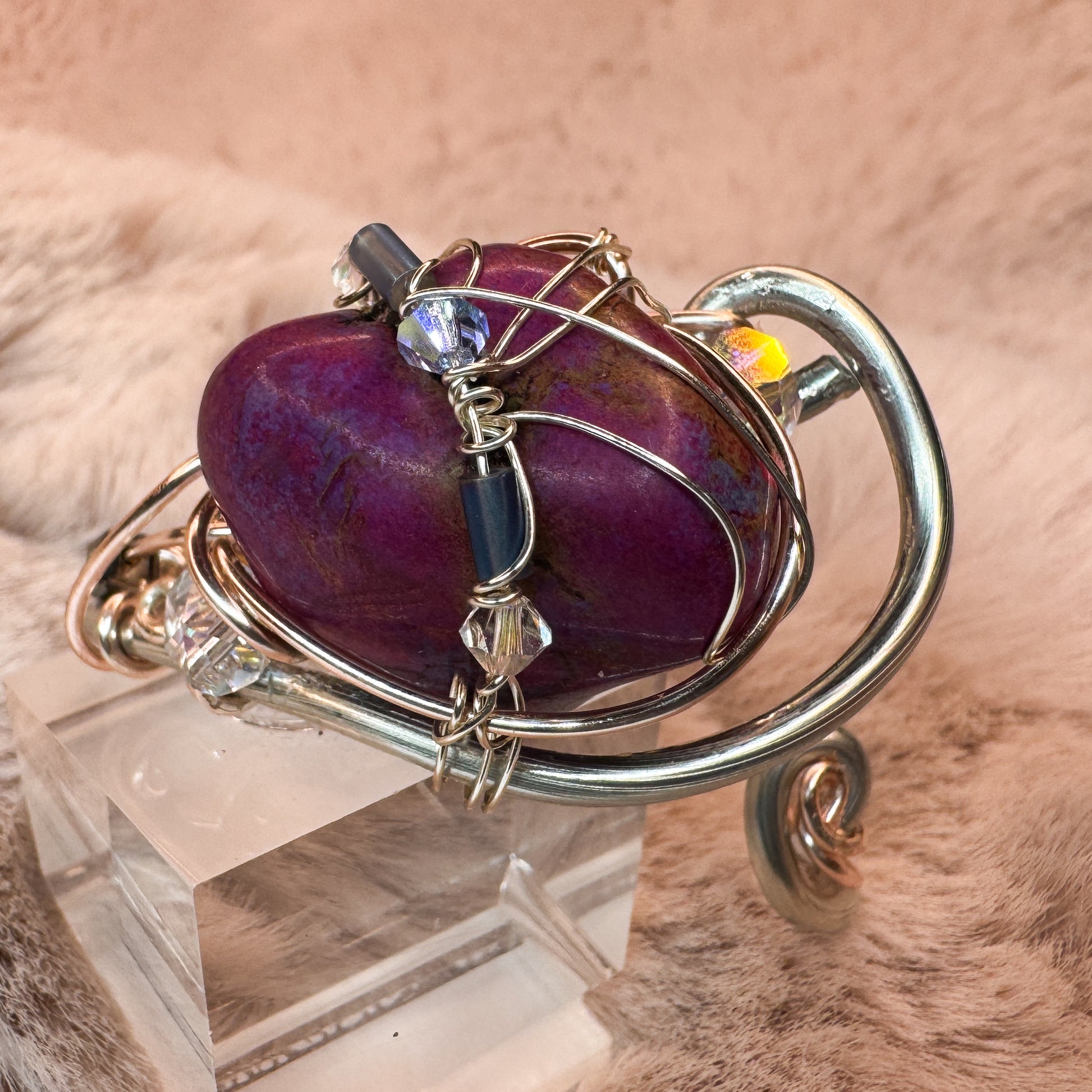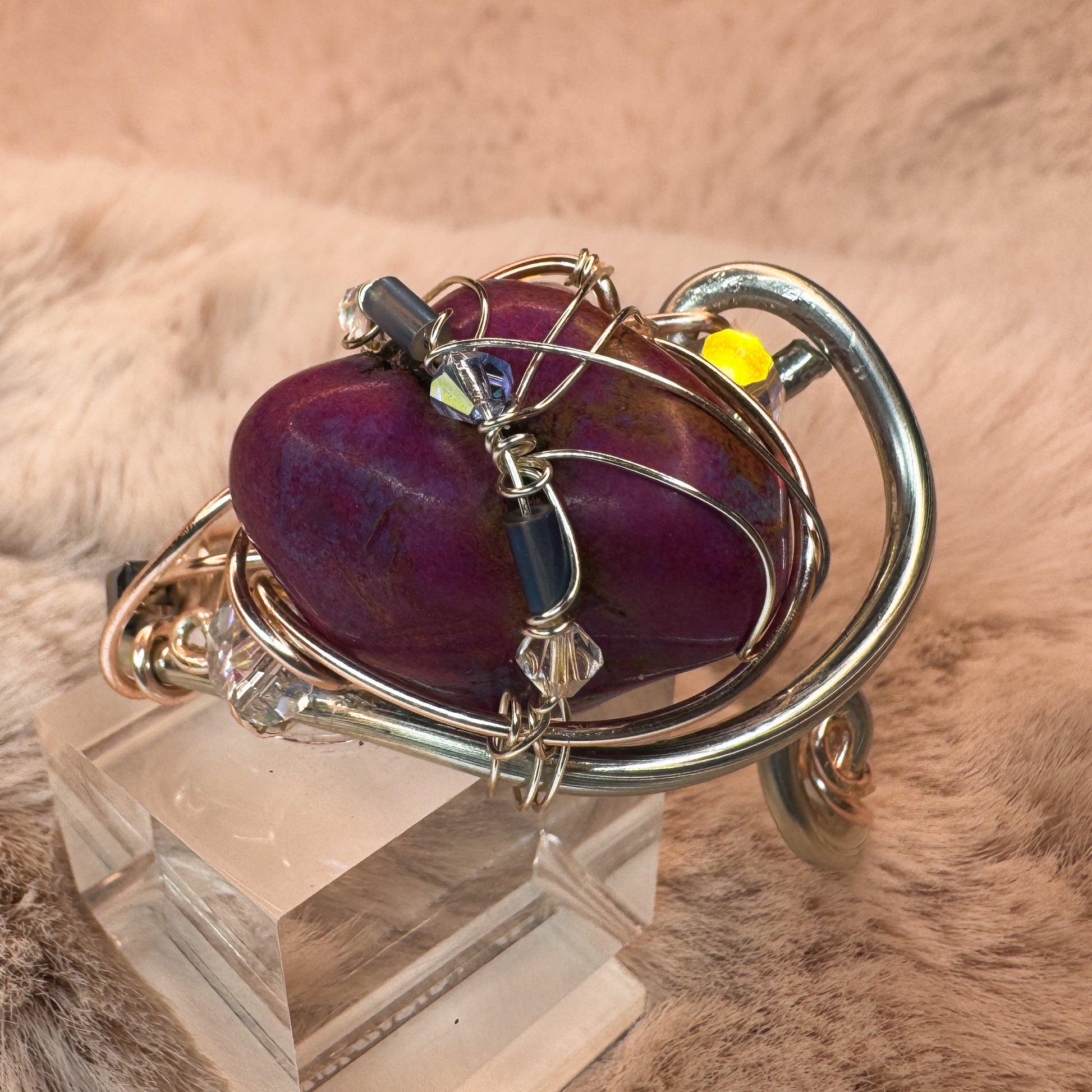 Experience the allure of the Majestic Turquoise Bracelet, an exquisite piece meticulously handcrafted from hypoallergenic Argentinian silver. This stunning bracelet features vibrant purple Madagascar turquoise, beautifully complemented by sparkling Swarovski crystals, creating a striking visual ensemble.