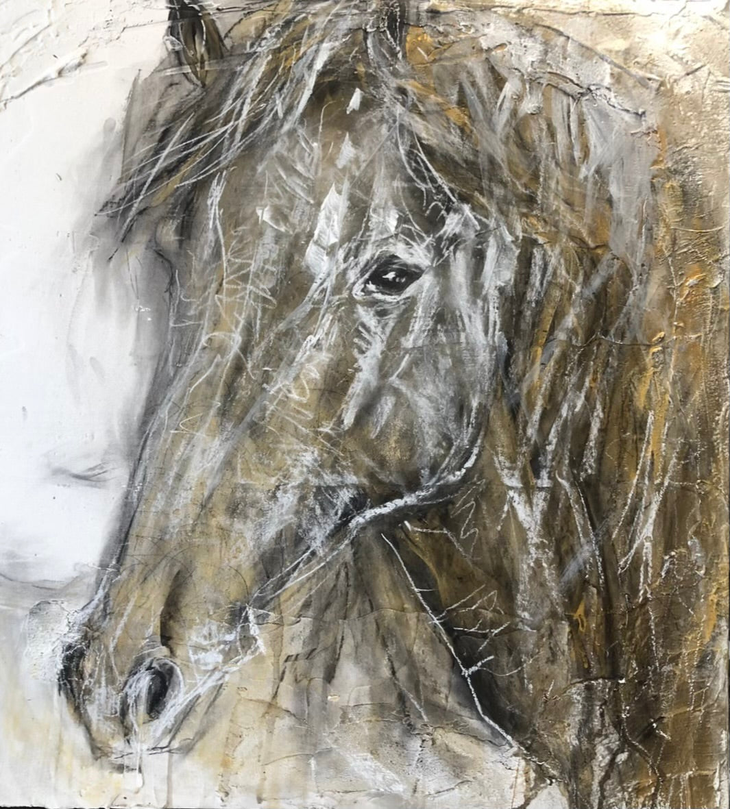 “Mystik Dan” is a breathtaking artwork that celebrates the strength, grace, and spirit of a powerful horse, capturing the essence of equine majesty through a masterful blend of charcoal and chalk. The artist enhances the dynamic portrayal with striking gold and white strokes, which illuminate the horse's form against a backdrop of natural wood grain, creating a captivating contrast that draws the viewer in.