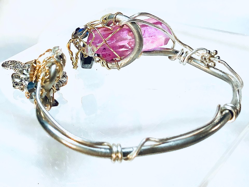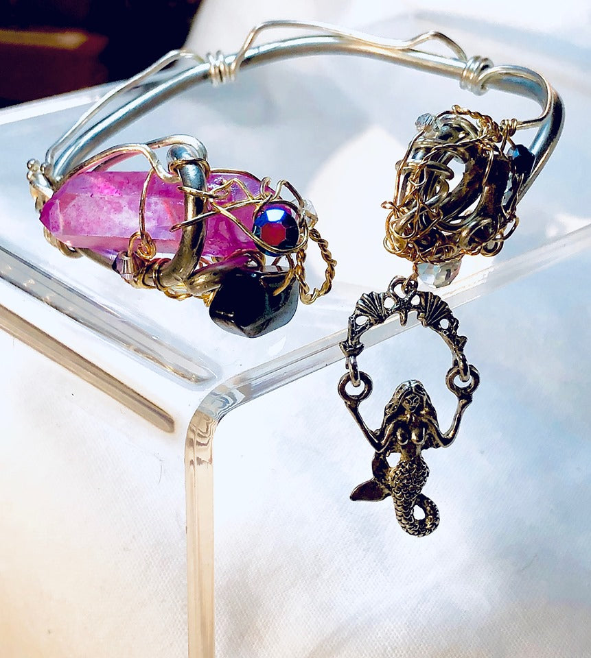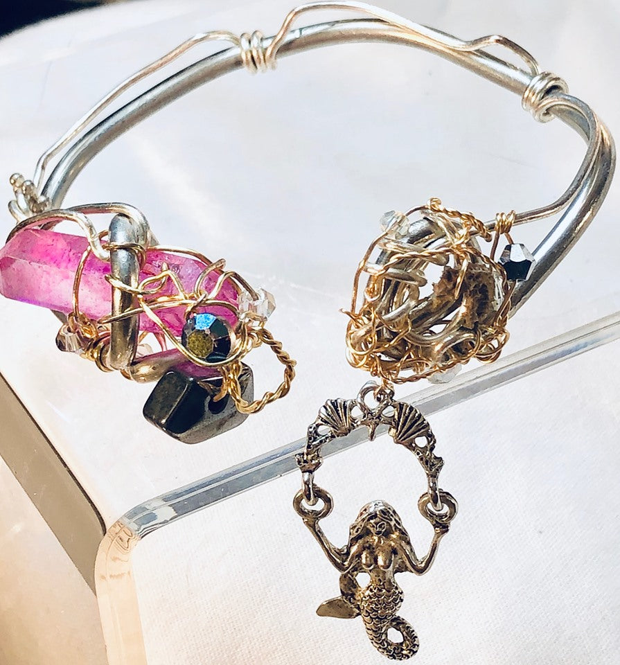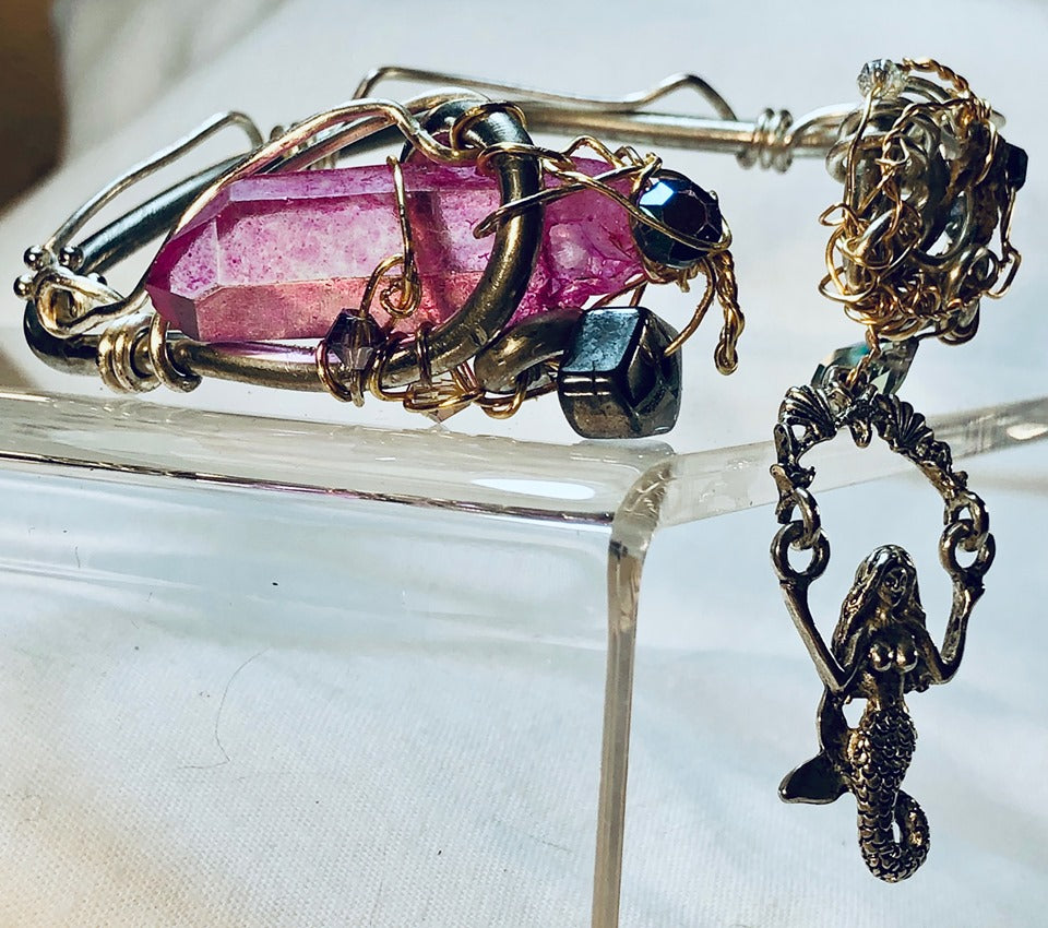 Brilliant Quartz crystal irradiated to pink, closely guarded by the Mermaid Queen of the Ocean.  Will not tarnish, does not contain lead, copper or nickel.  Each item is a unique, hand-made creation, please allow for subtle differences that solidifies the distinctiveness of each piece.