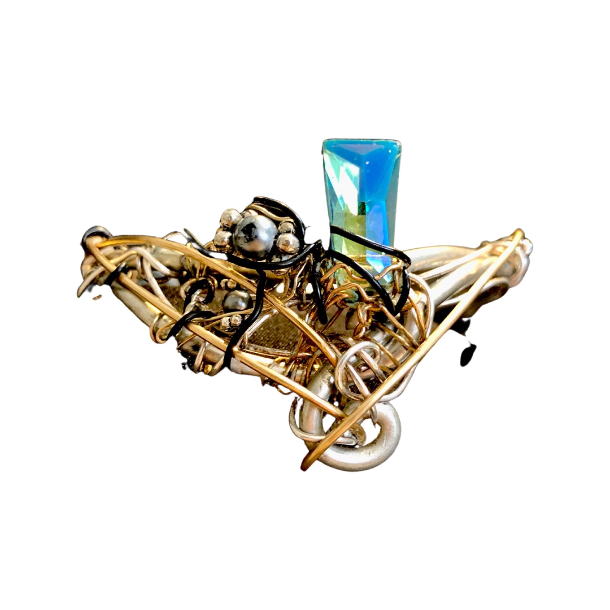 Entrancing Art Deco design with black pearls, outstanding gem cut opalescent blue crystal, encircled with bits of silver and gold hardware giving it an elegant, steampunk angst.
