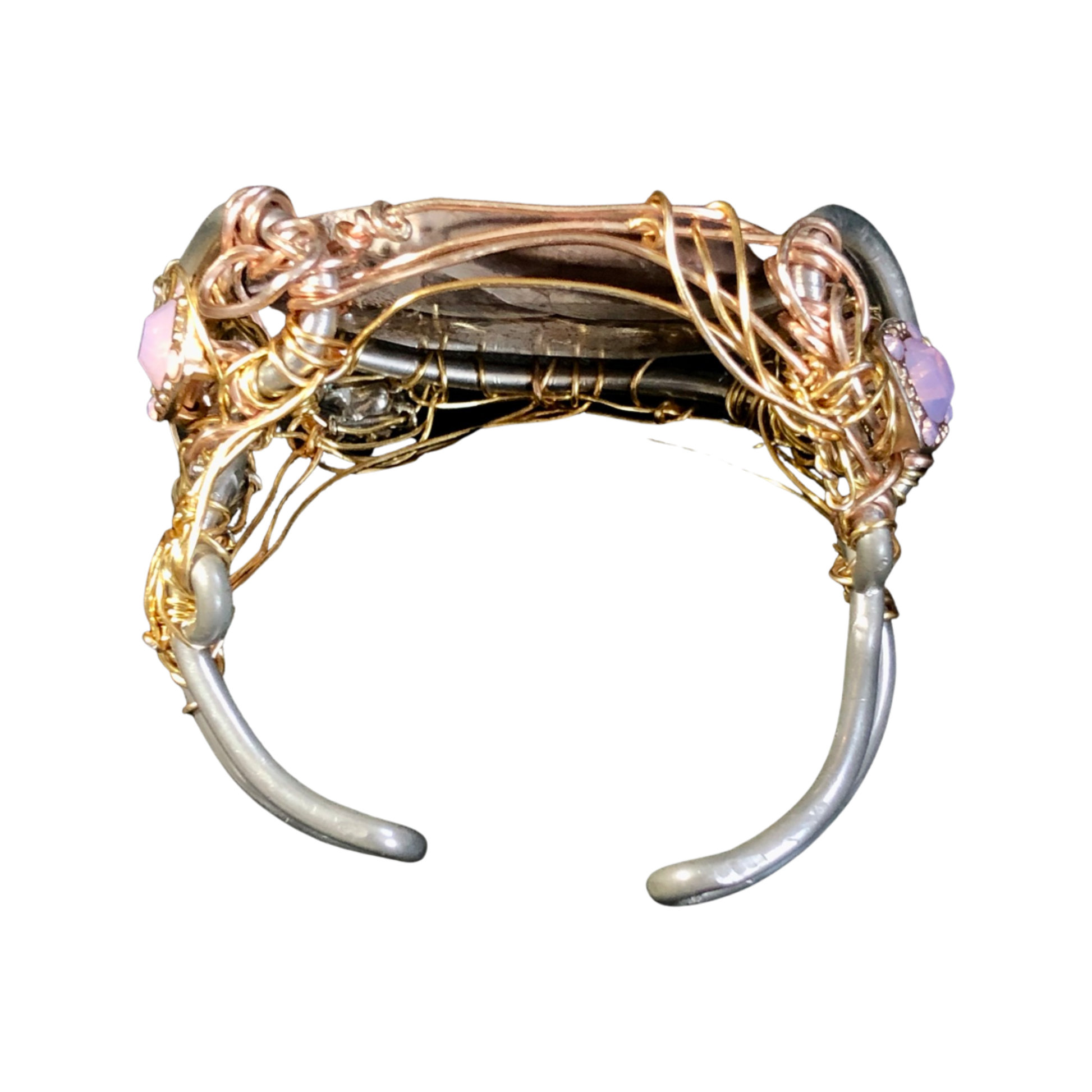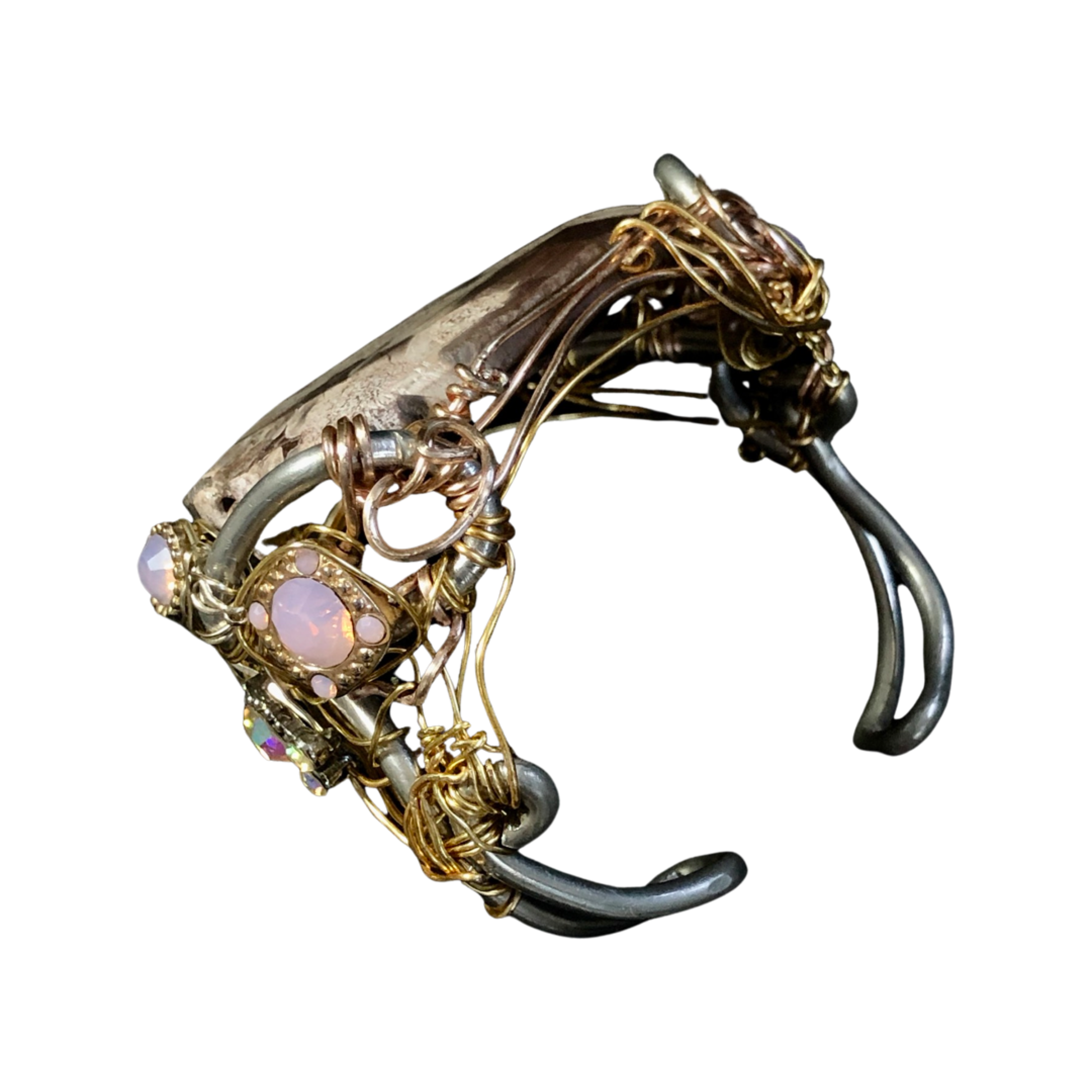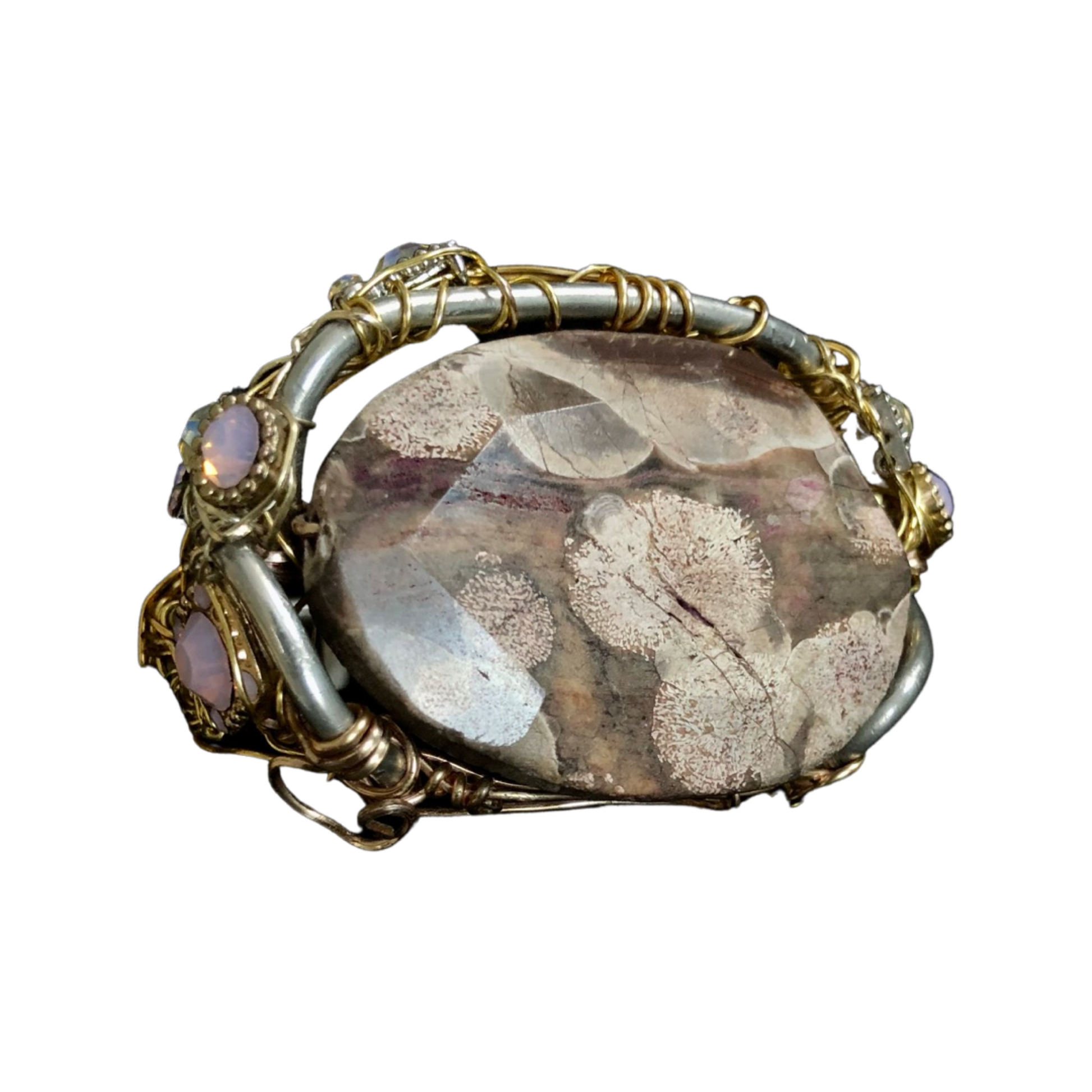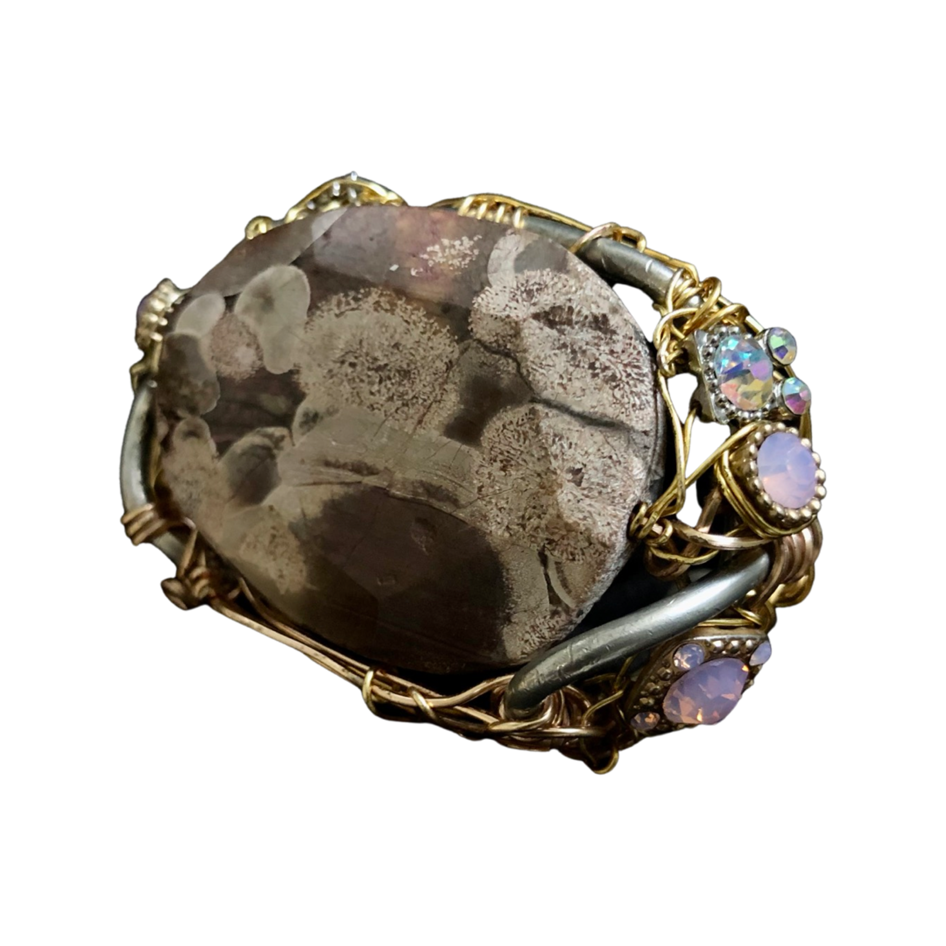 Introducing "Eternal Blossom" - a truly remarkable bracelet that showcases the everlasting beauty of a large, 165 million-year-old petrified flower, adorned with delicate pink rhinestones. This exquisite piece is a testament to the timeless allure of nature, preserving the essence of a flower that bloomed centuries ago.