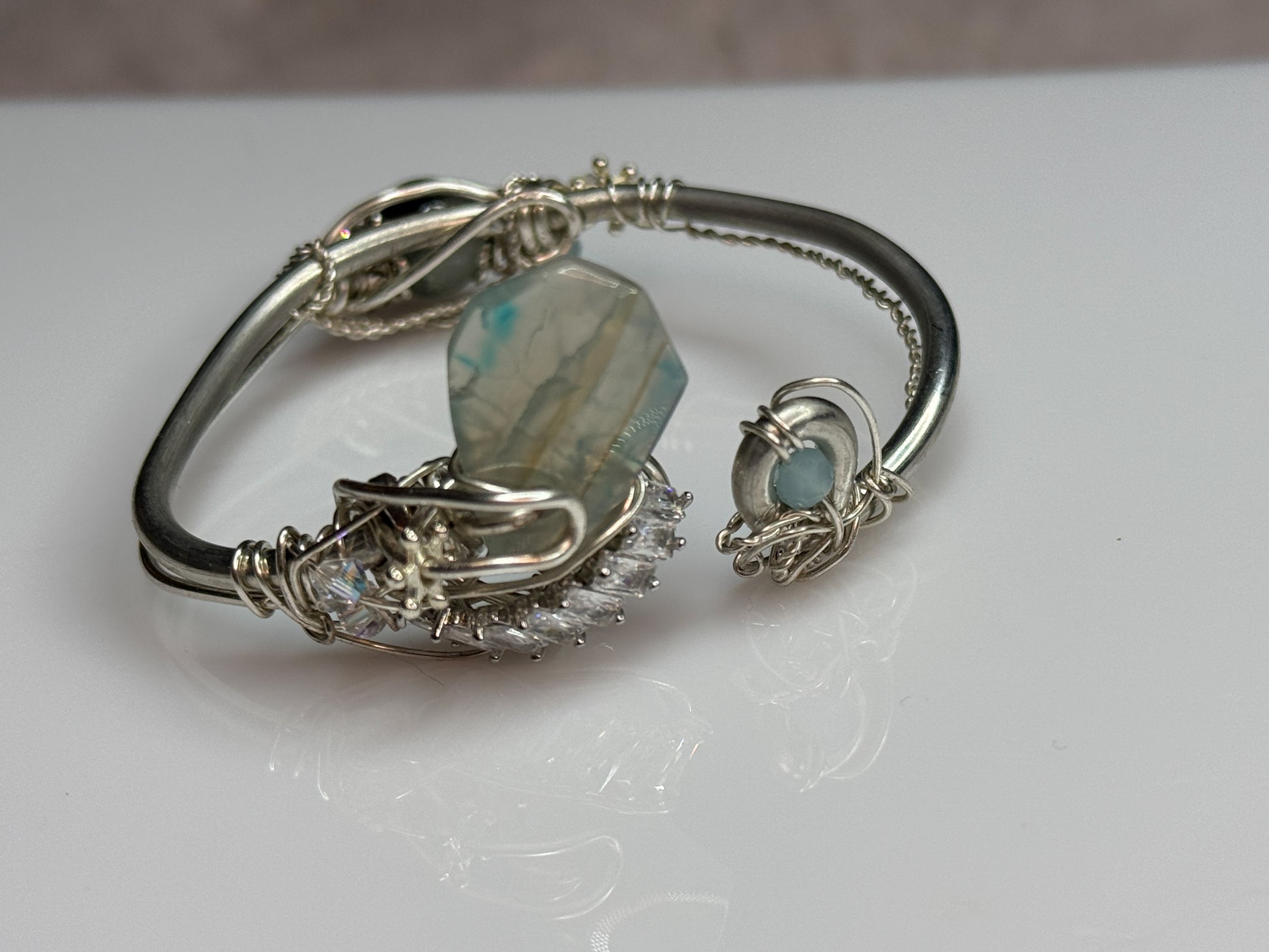 This exquisite jewelry piece is a harmonious blend of hypoallergenic Argentinian silver and captivating gemstones. The central gemstone is Australian turquoise, renowned for its vibrant hues and grounding energy. Turquoise is believed to offer protection, enhance communication, and attract prosperity.